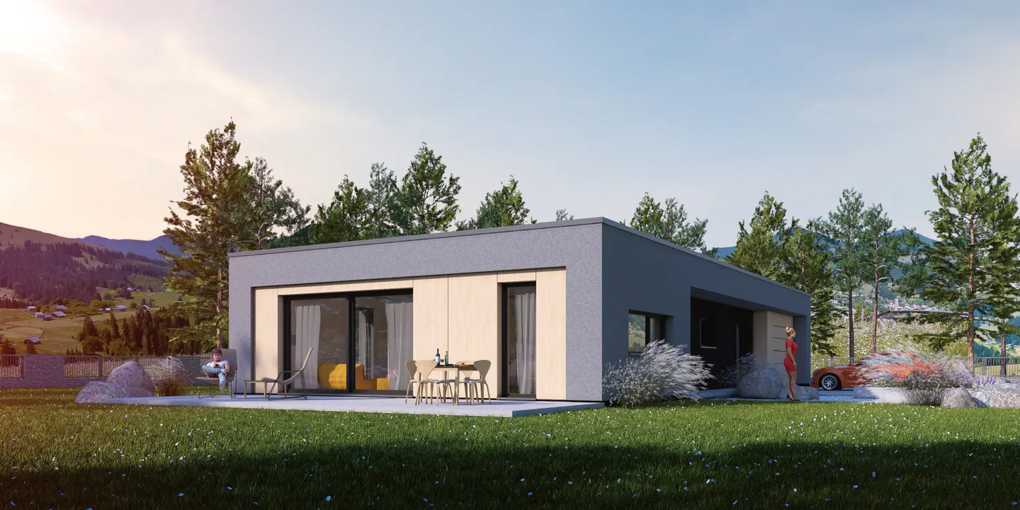 Проект современного одноэтажного дома с плоской крышей и интегрированным гаражом.