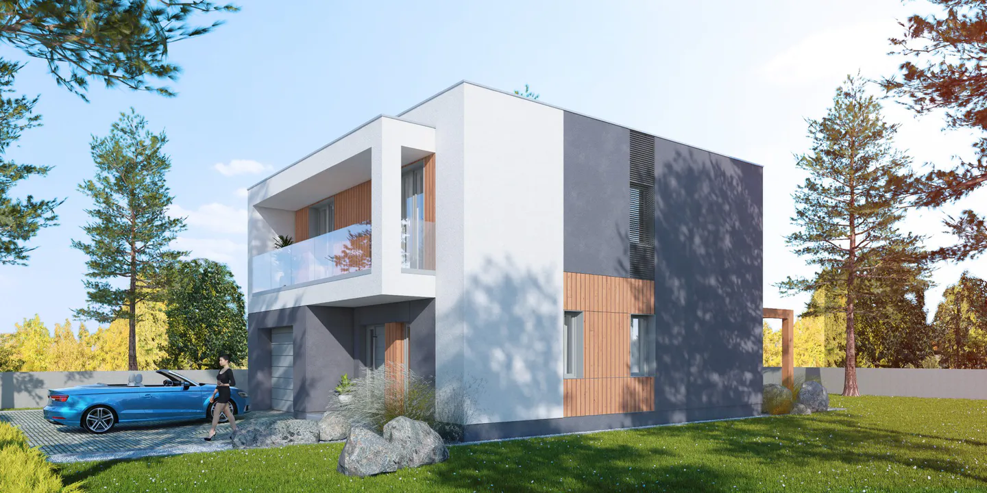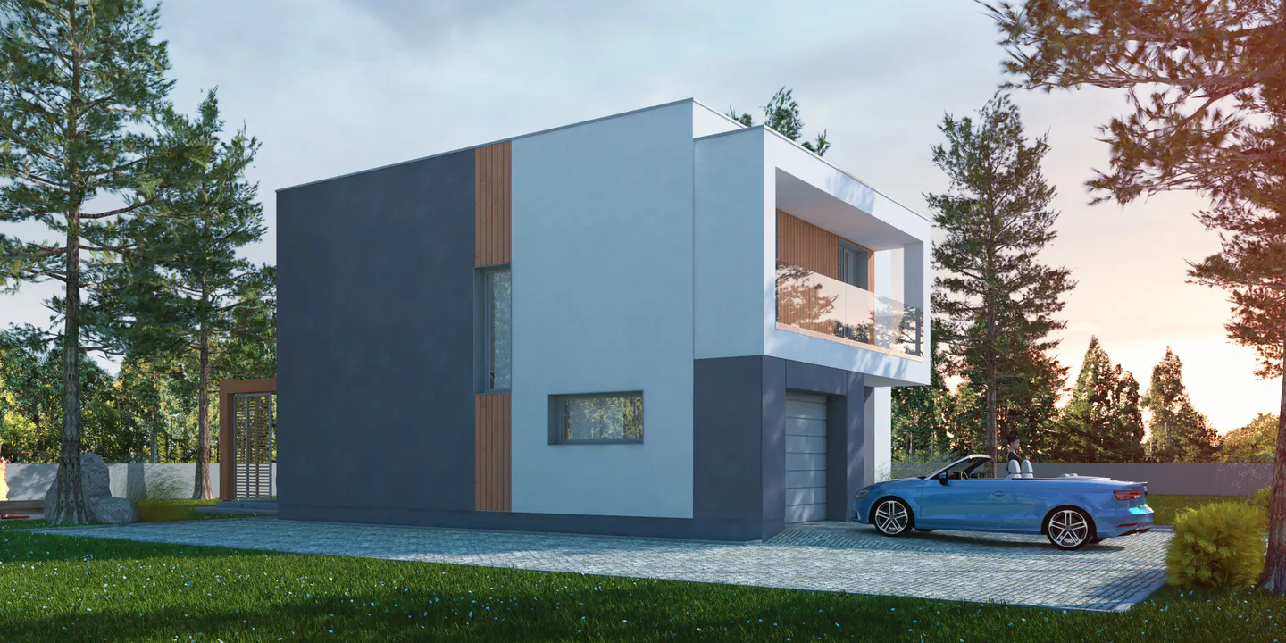 Дизайн современного двухэтажного дома подчеркивает простоту, минимализм и функциональность. Использование прямых линий, плоской кровли и геометрических форм характерно для стиля Хайтек, создавая современную и воздушную эстетику.