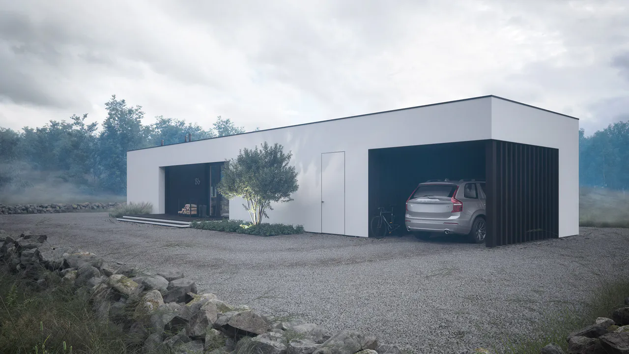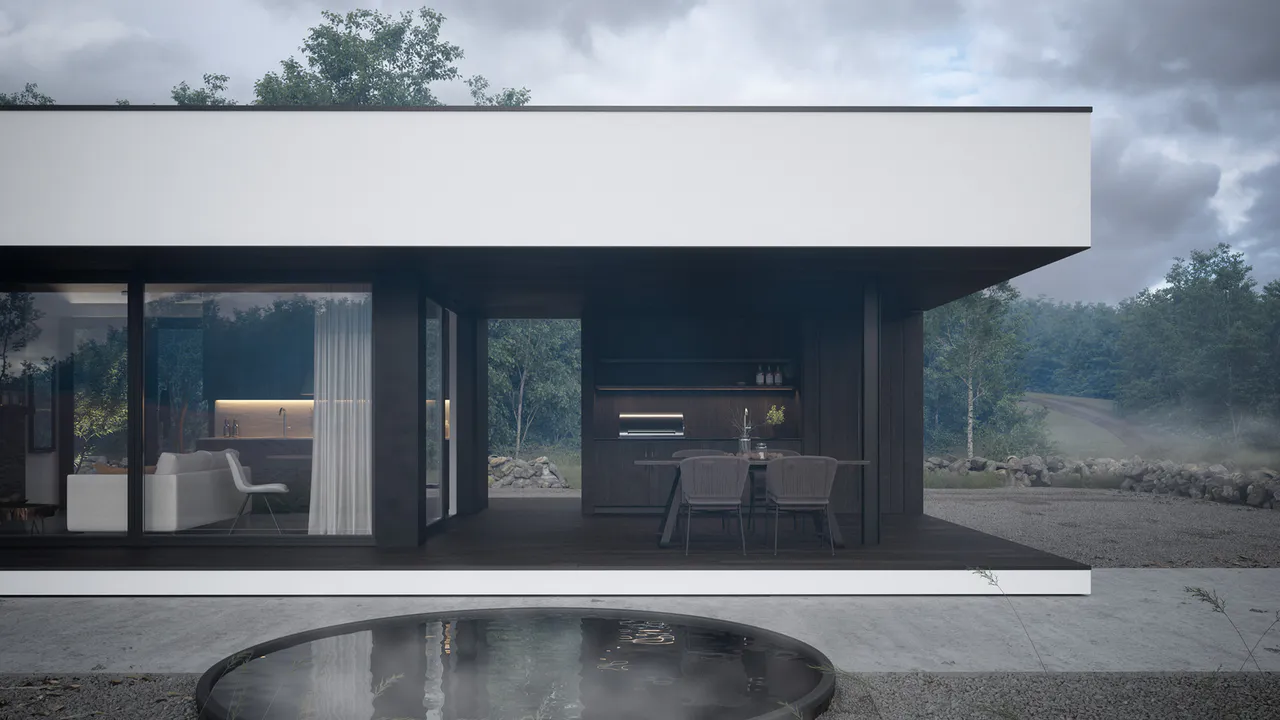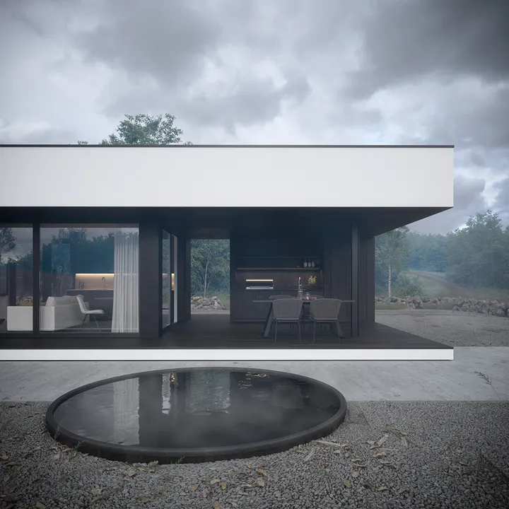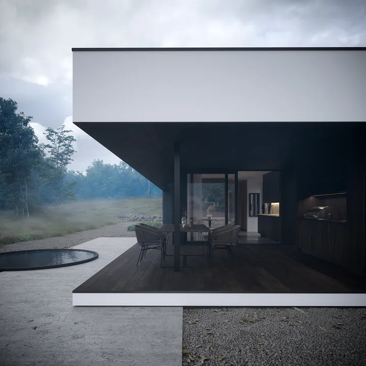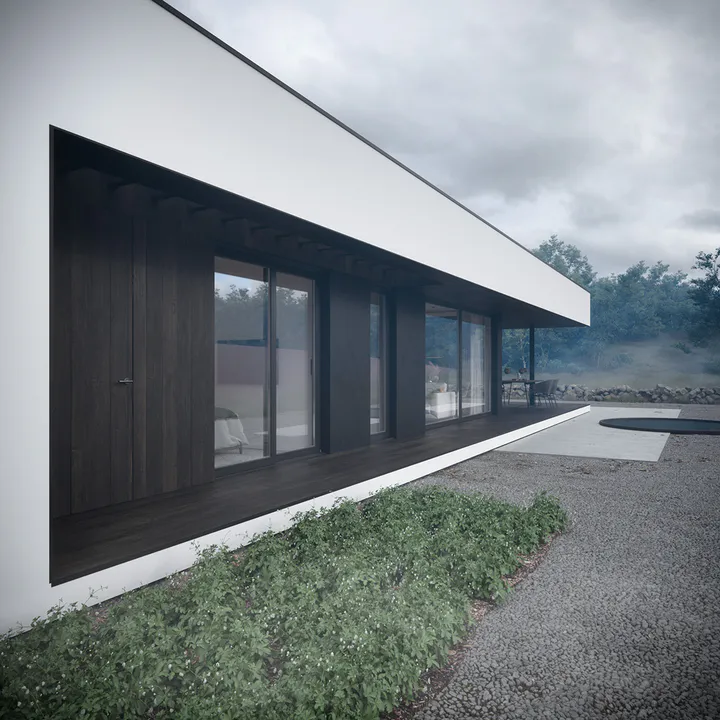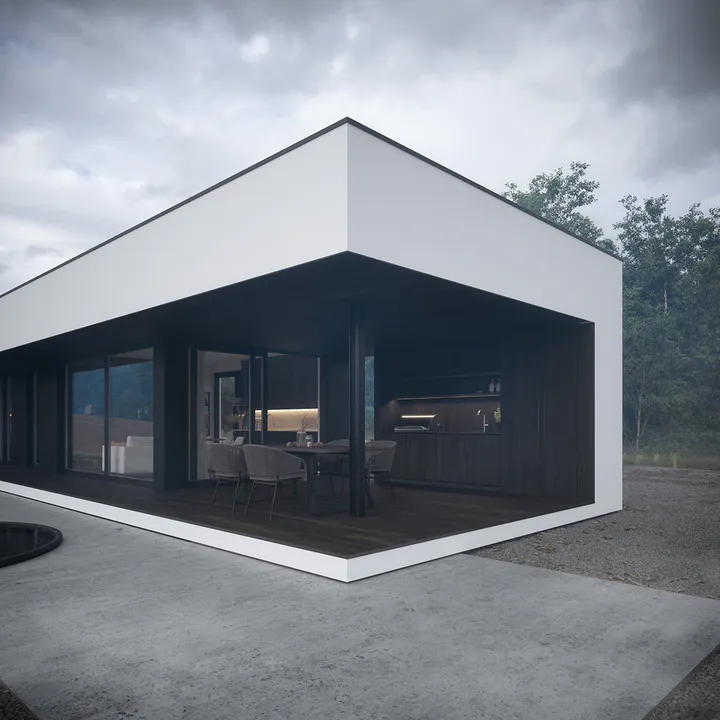 Здание в стиле Хайтек выполнено в духе минимализма и дополнено плоской кровлей. Экстерьер базируется на контрасте фактур: белоснежной штукатурки и акцентного планкена из темного дерева.