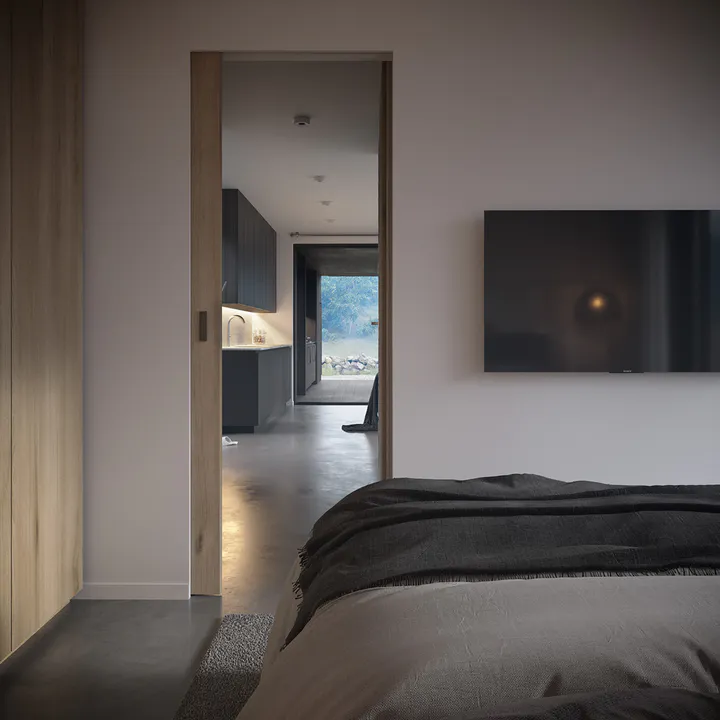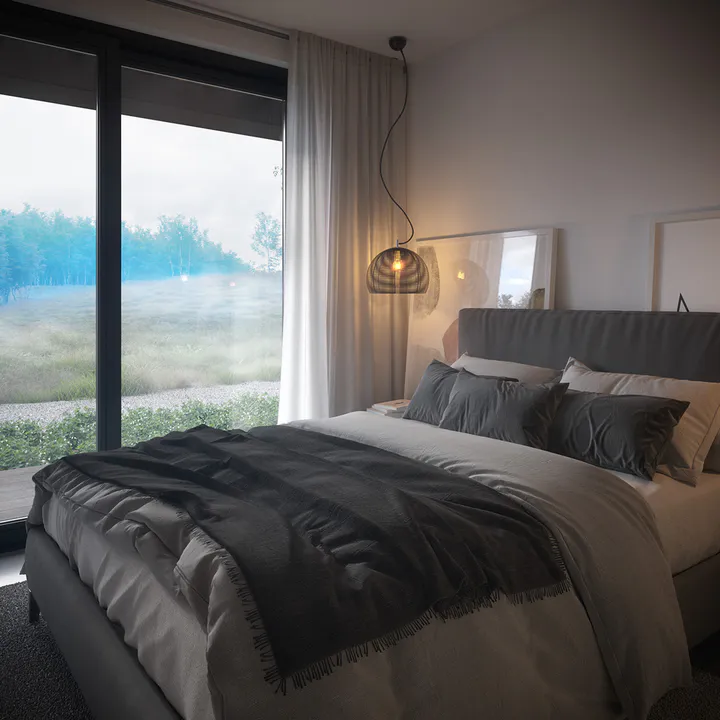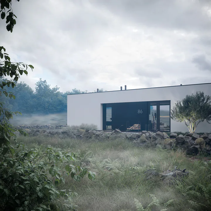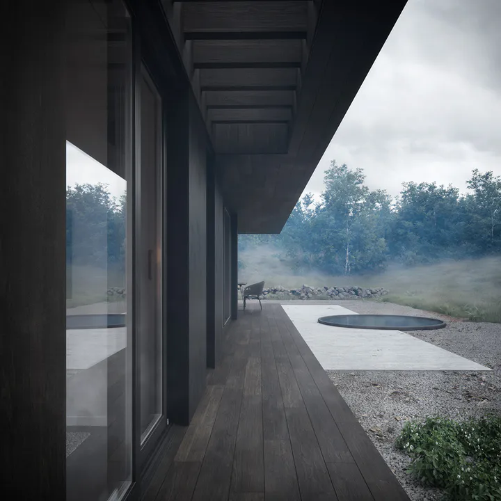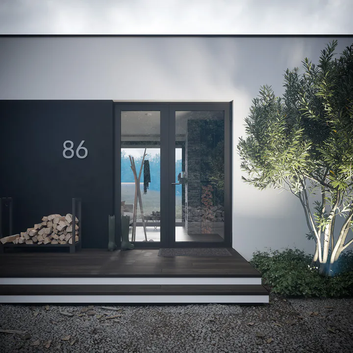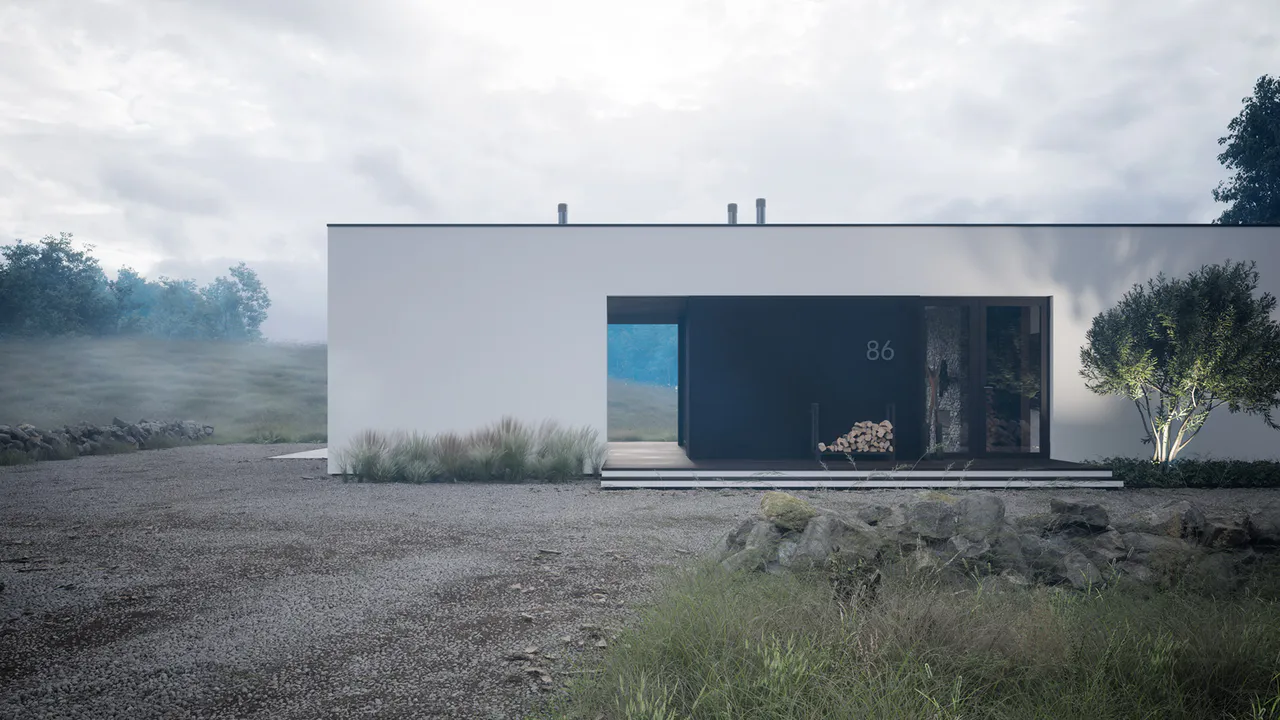 Здание в стиле Хайтек выполнено в духе минимализма и дополнено плоской кровлей. Экстерьер базируется на контрасте фактур: белоснежной штукатурки и акцентного планкена из темного дерева.