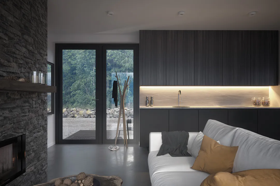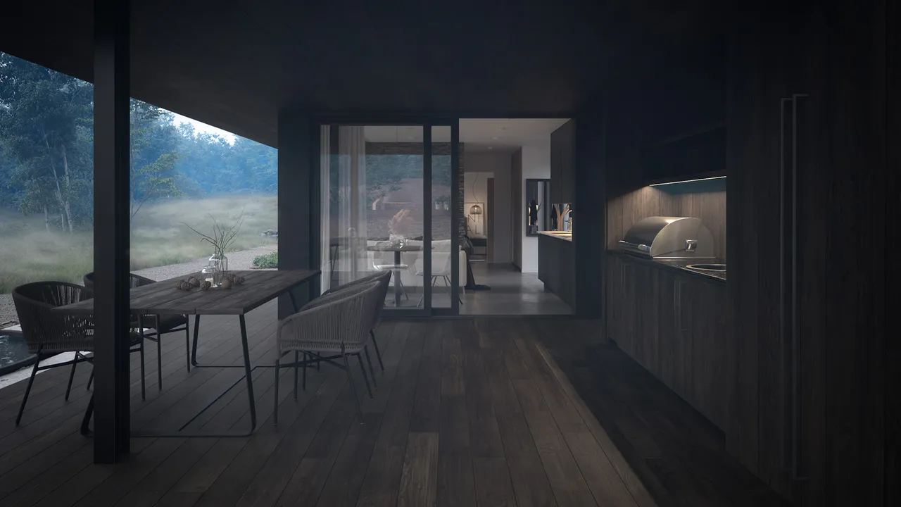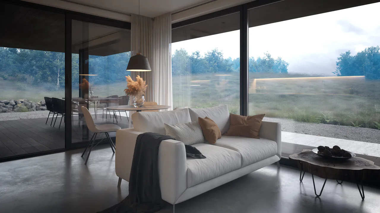 Панорамное остекление стирает границы между интерьером и террасой, наполняя дом светом.