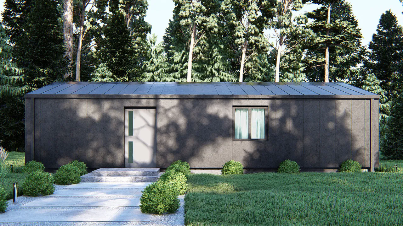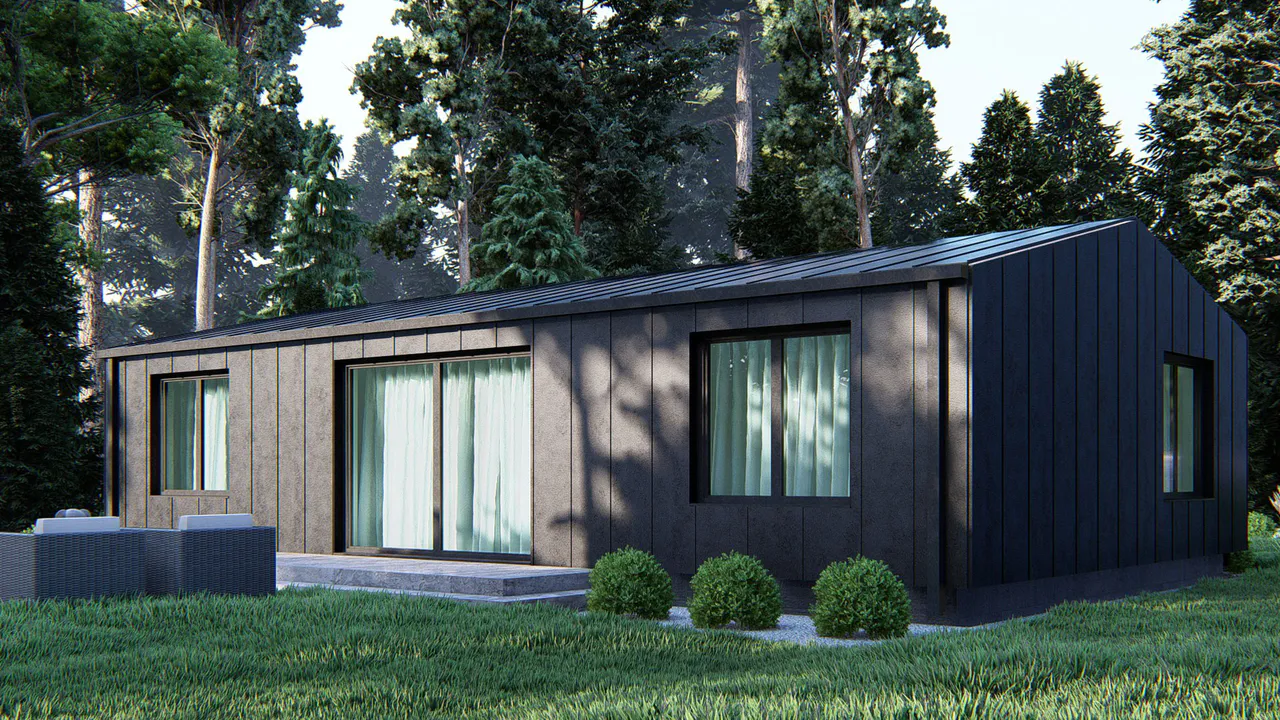 Дом имеет простую прямоугольную форму без выступов и карнизов, что создает ощущение целостности и чистоты линий. Почти плоская крыша с углом наклона 13° придает зданию приземистый «скандинавский» вид, гармонично вписывая его в ландшафт. В отделке используется сочетание фальцевого металла и деревянного планкена.