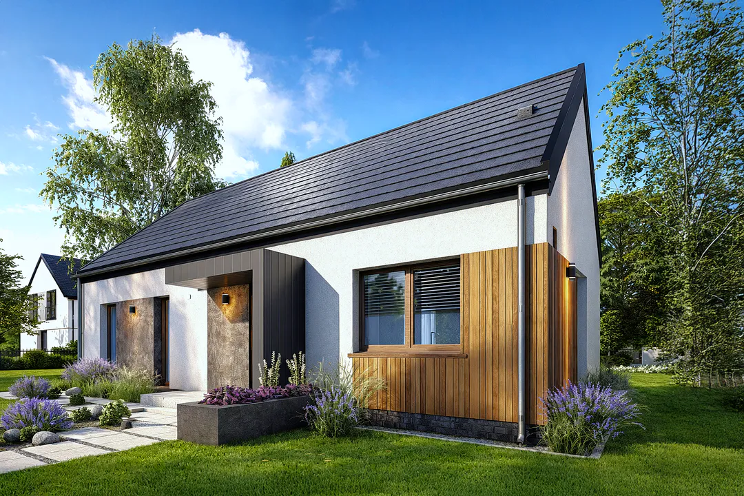 Проект компактного одноэтажного дома с двускатной крышей и террасой.