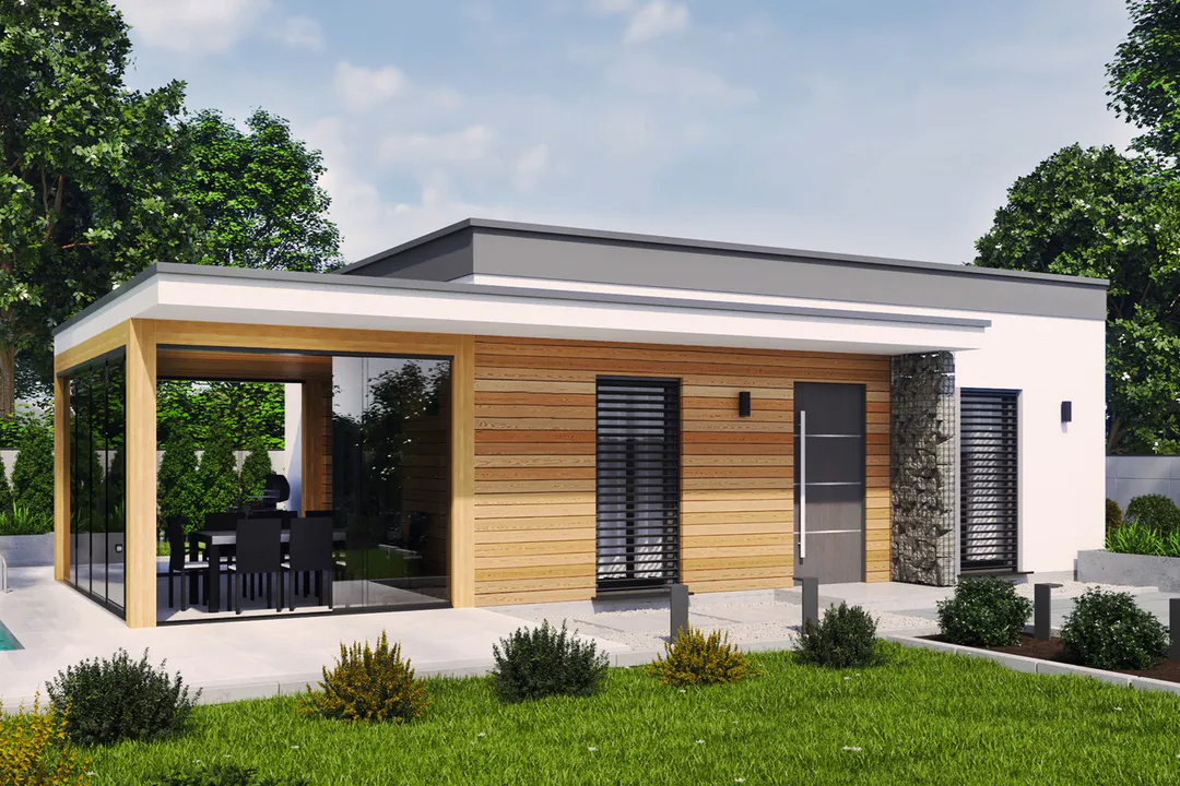 Проект компактного одноэтажного дома с плоской крышей и террасой.