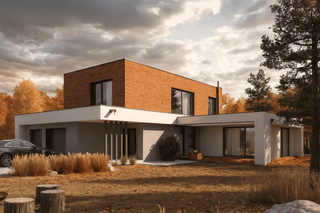 Проект современного дома с минималистичным дизайном в стиле хайтек. Дом двухэтажный с плоской крышей и большими панорамными окнами. Фасад окрашен в спокойные серые и белые тона.