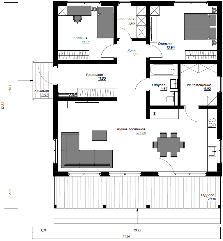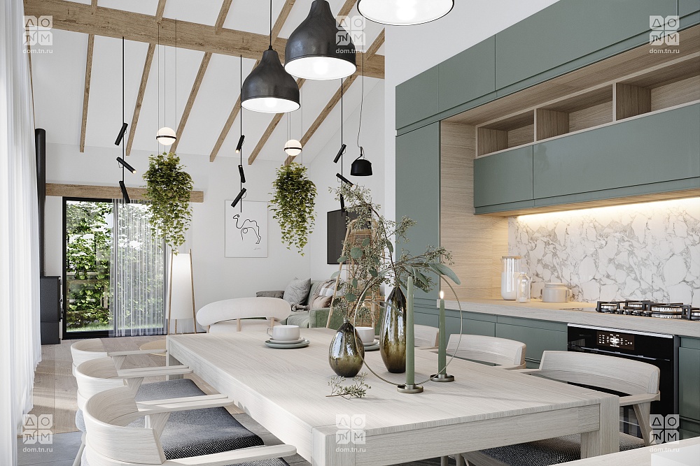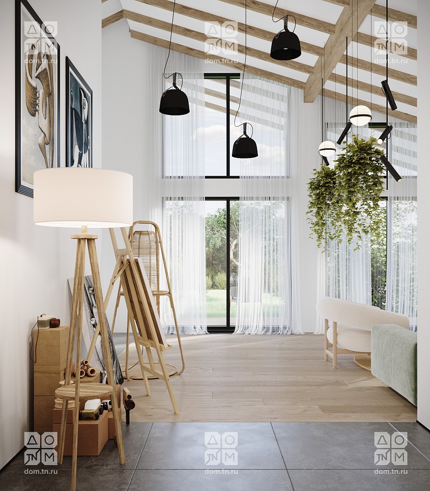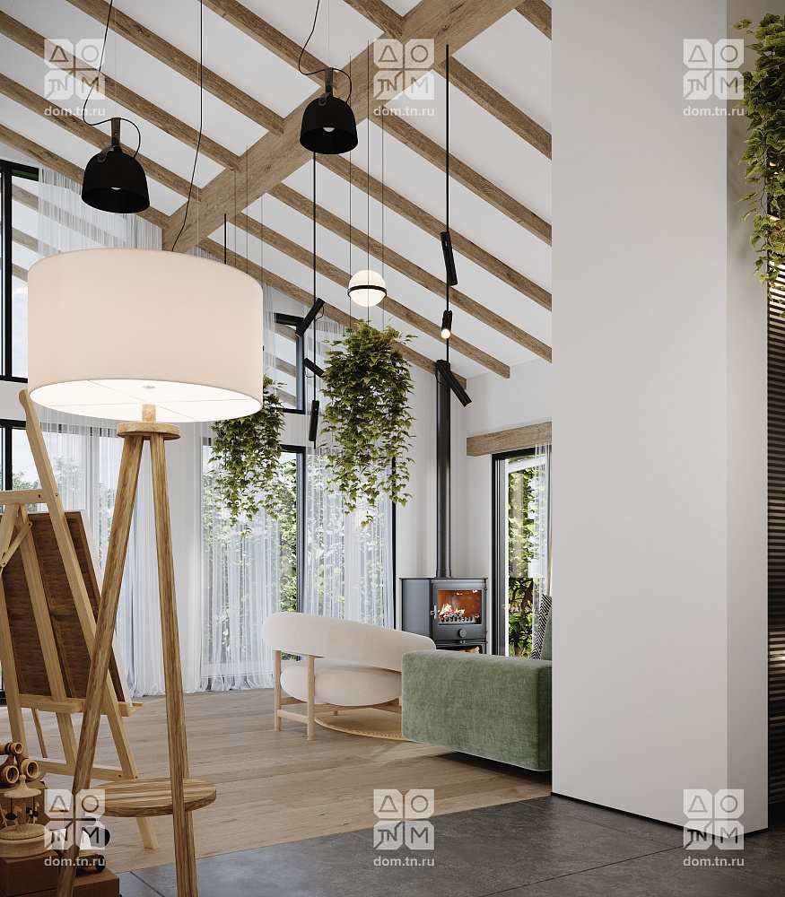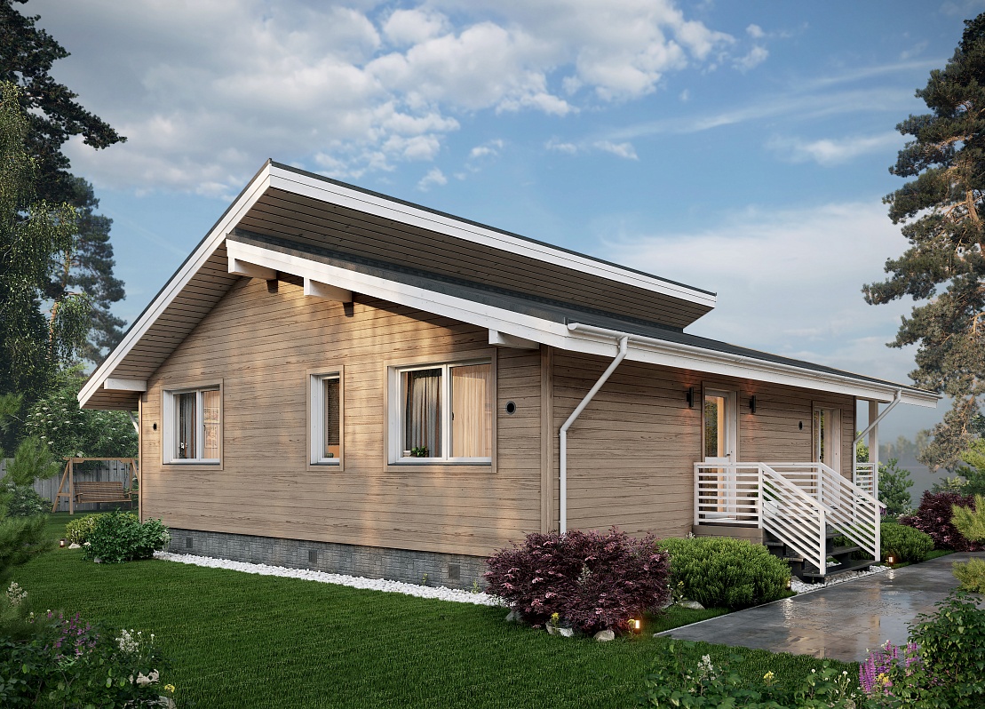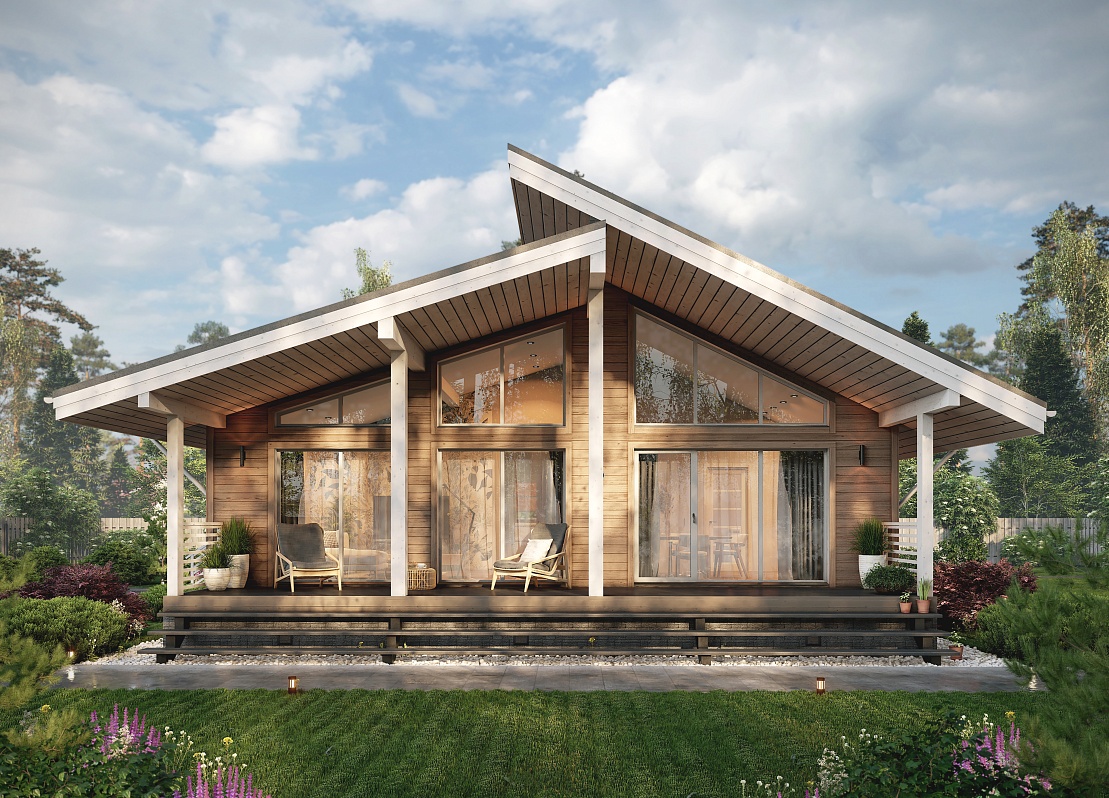 Современный коттедж в скандинавском стиле с разноуровневой крышей, панорамным остеклением, просторной гостиной, двумя спальнями и большой крытой террасой.