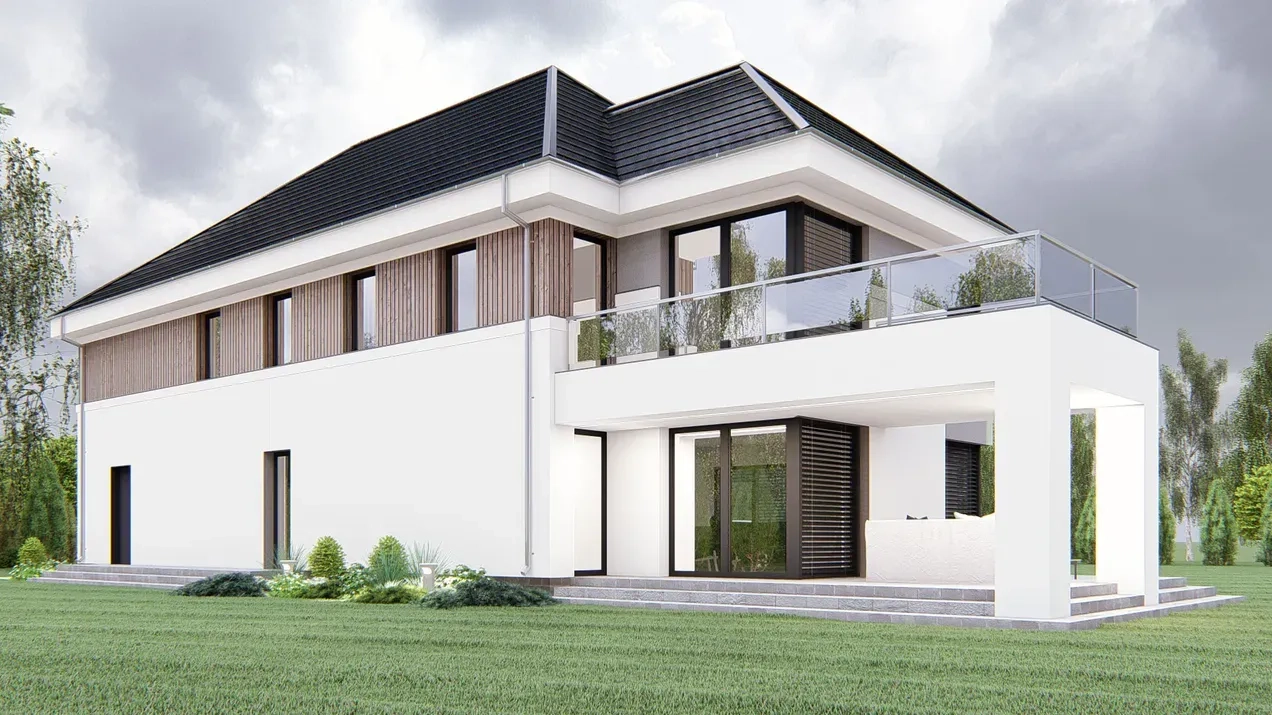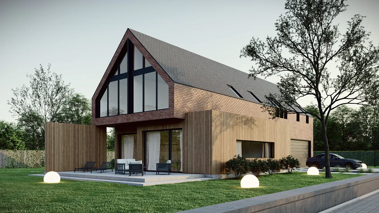 Дизайн дома выполнен в сдержанных тонах с использованием натуральных материалов, что создает атмосферу уюта и комфорта. Дом притягивает внимание своей элегантностью и изысканностью.