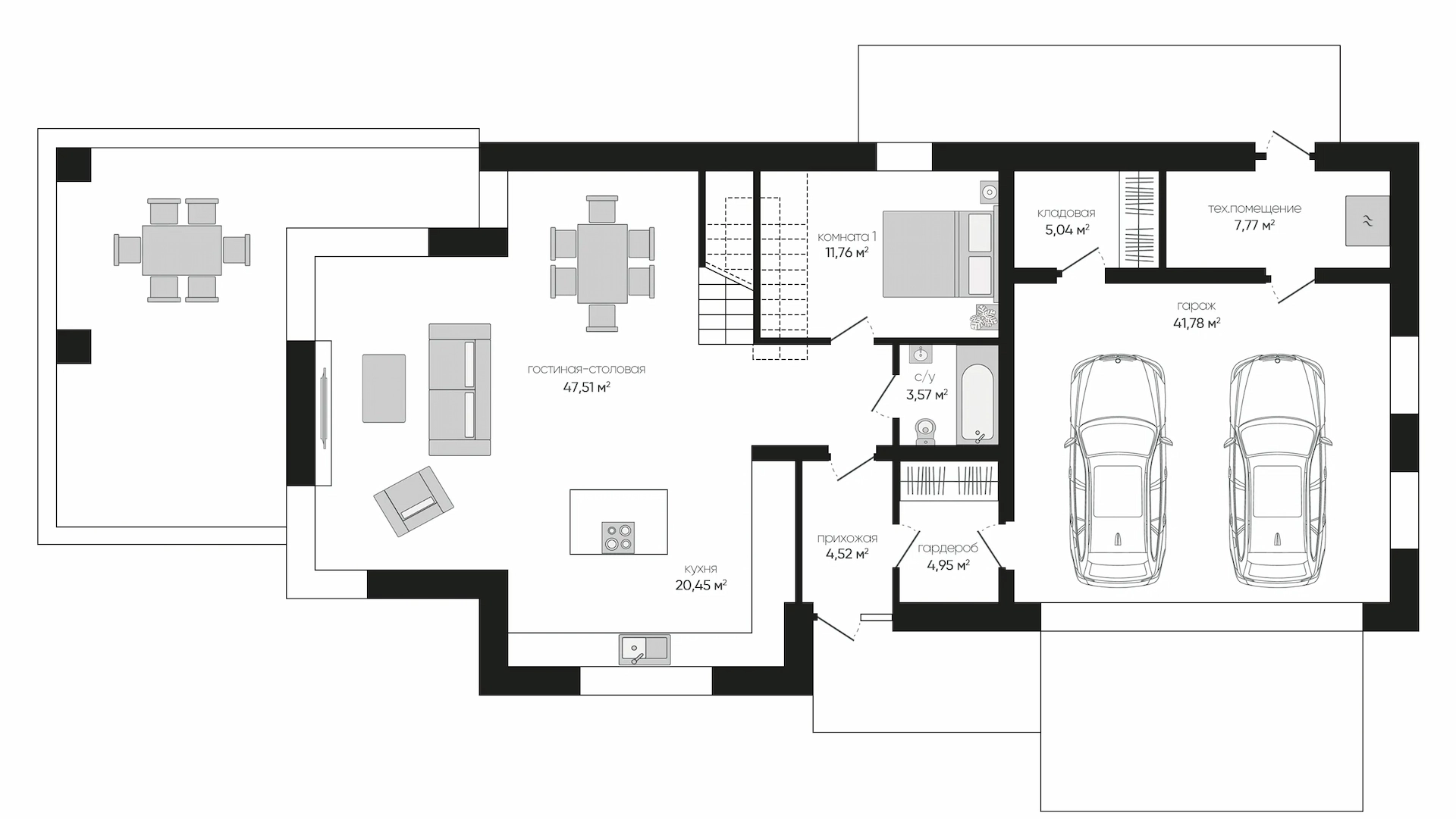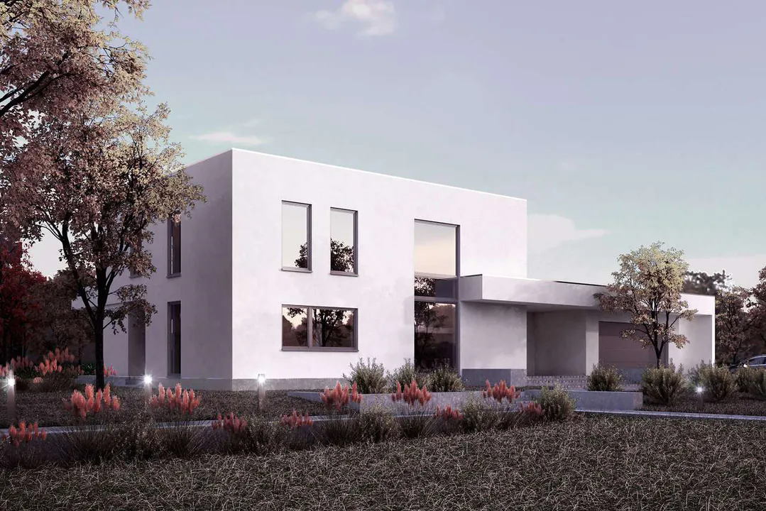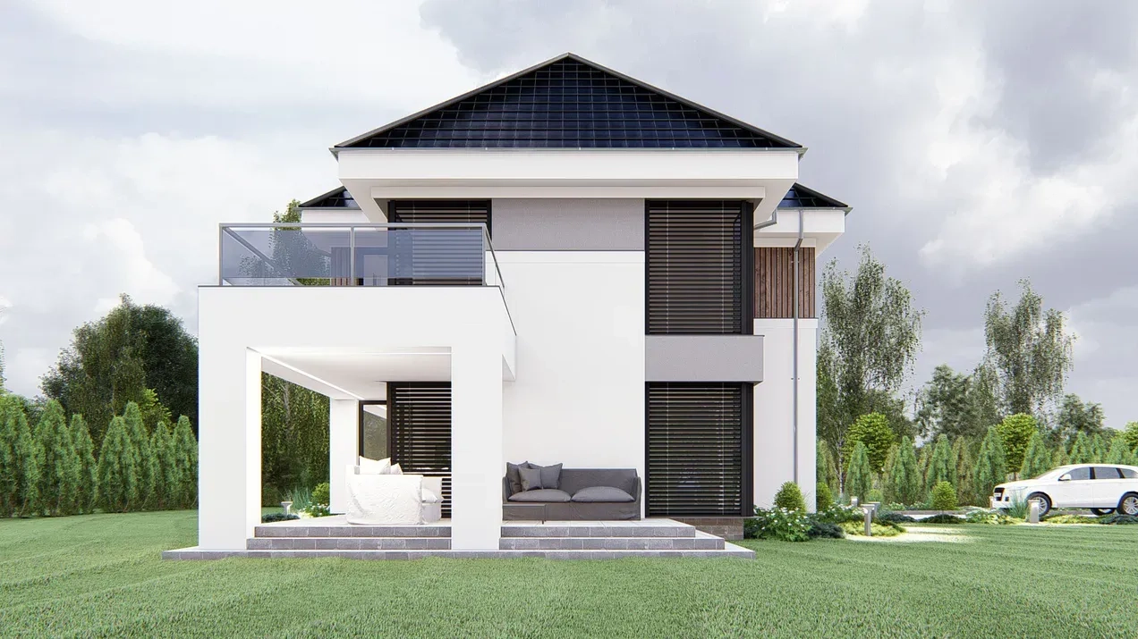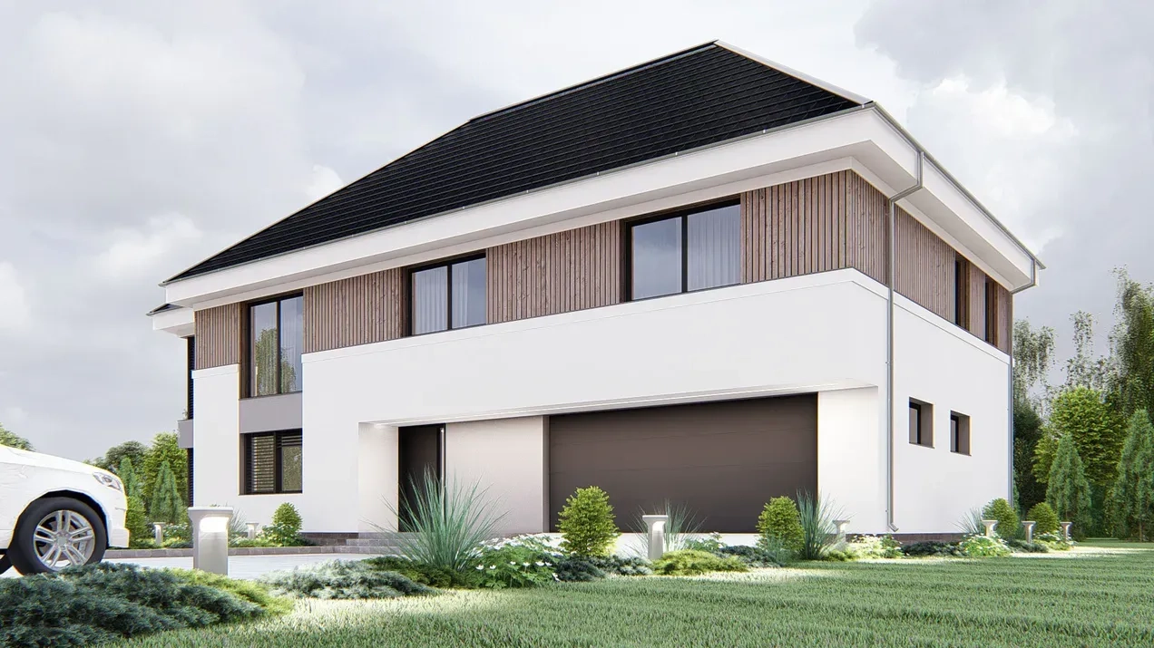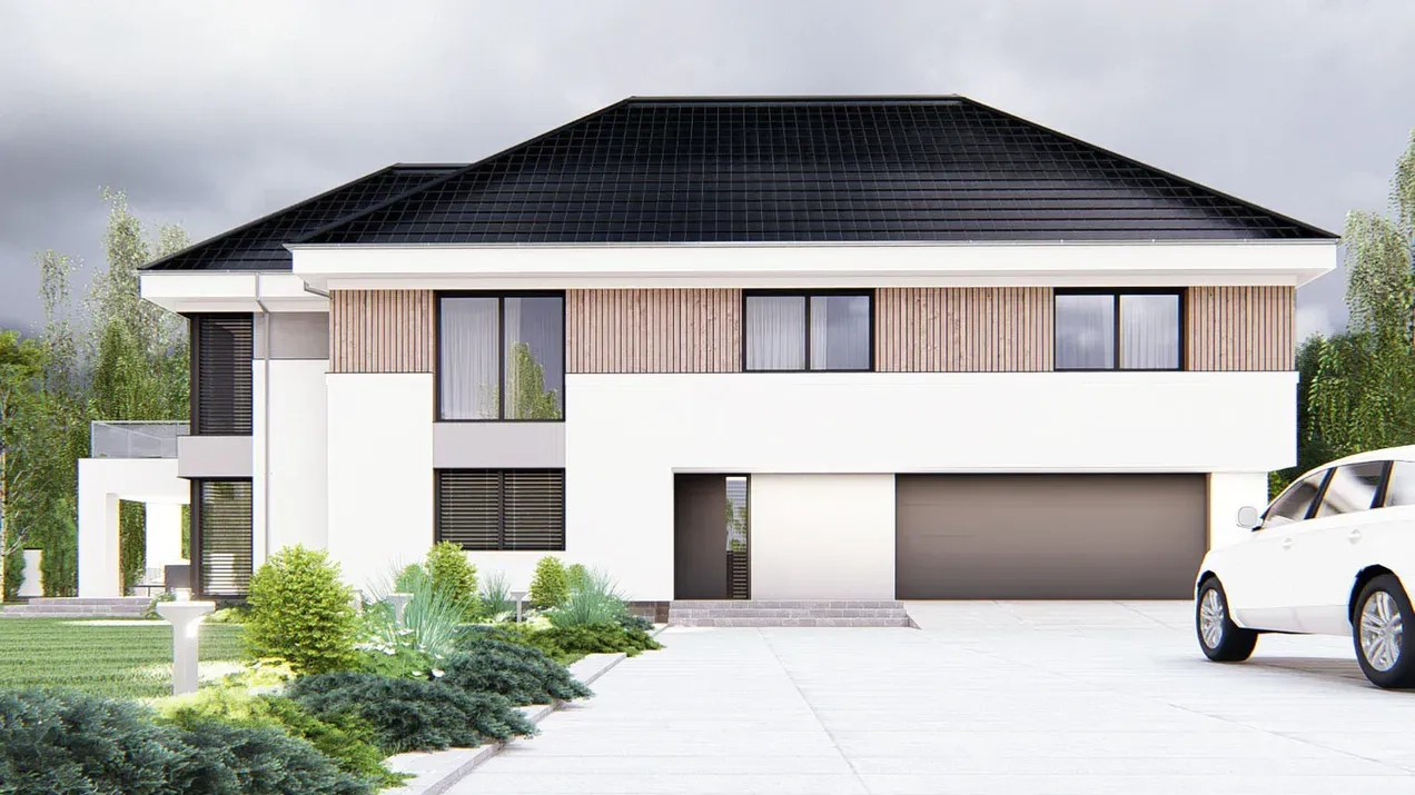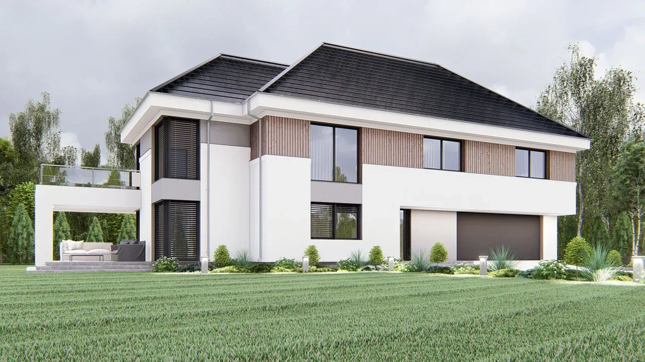 Проект современного двухэтажного дома с просторным гаражом и террасой.