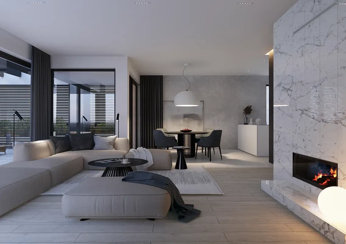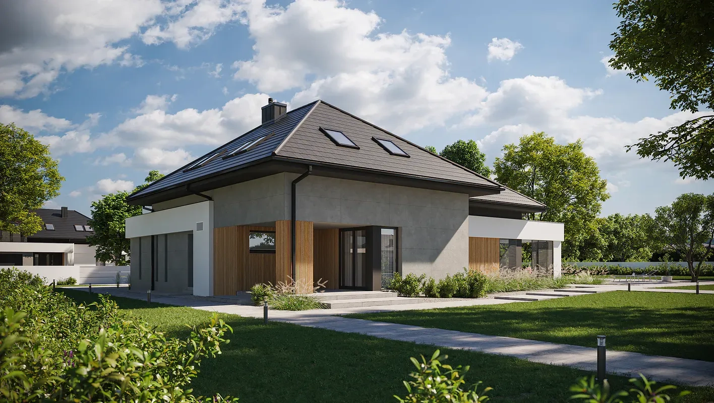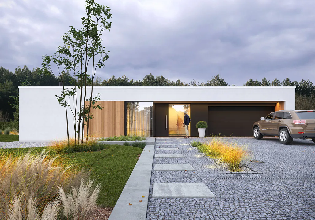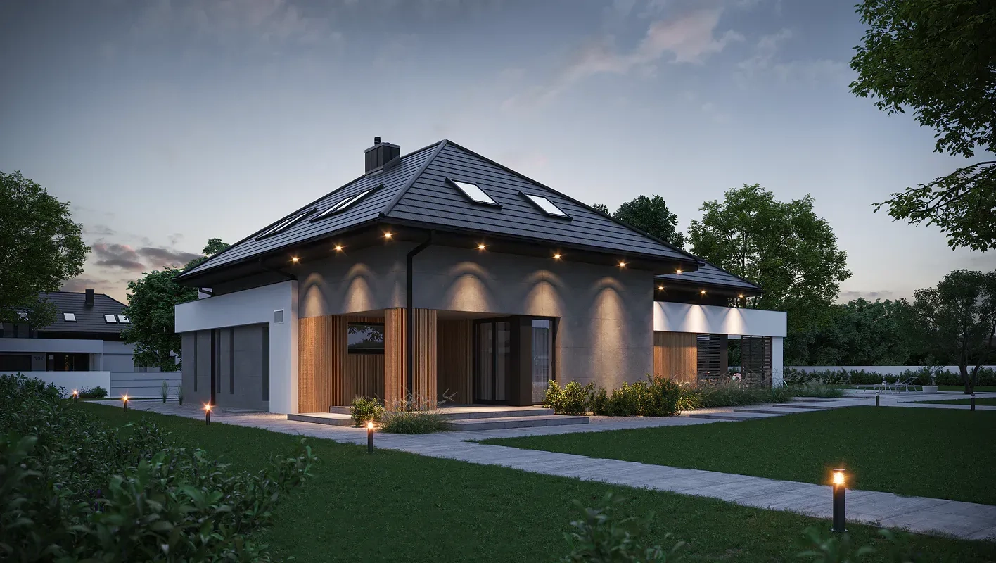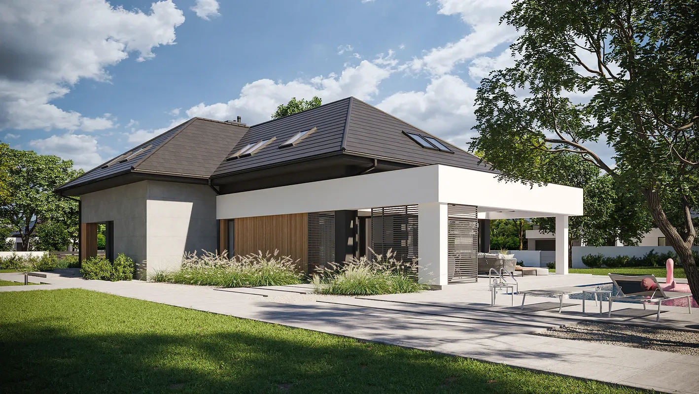 Фасад из силиконовой штукатурки с бетонной структурой белого и графитового цвета в сочетании с фасадным деревом теплого оттенка создает уникальную и вневременную композицию.