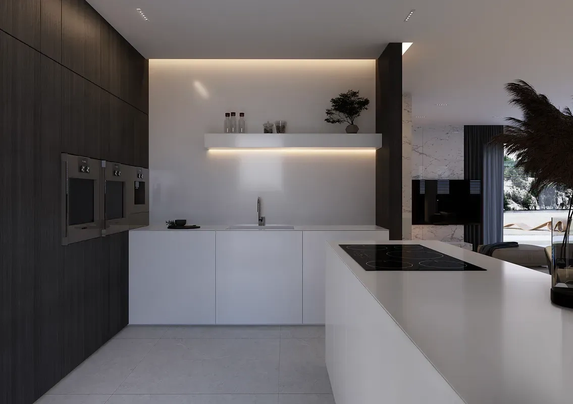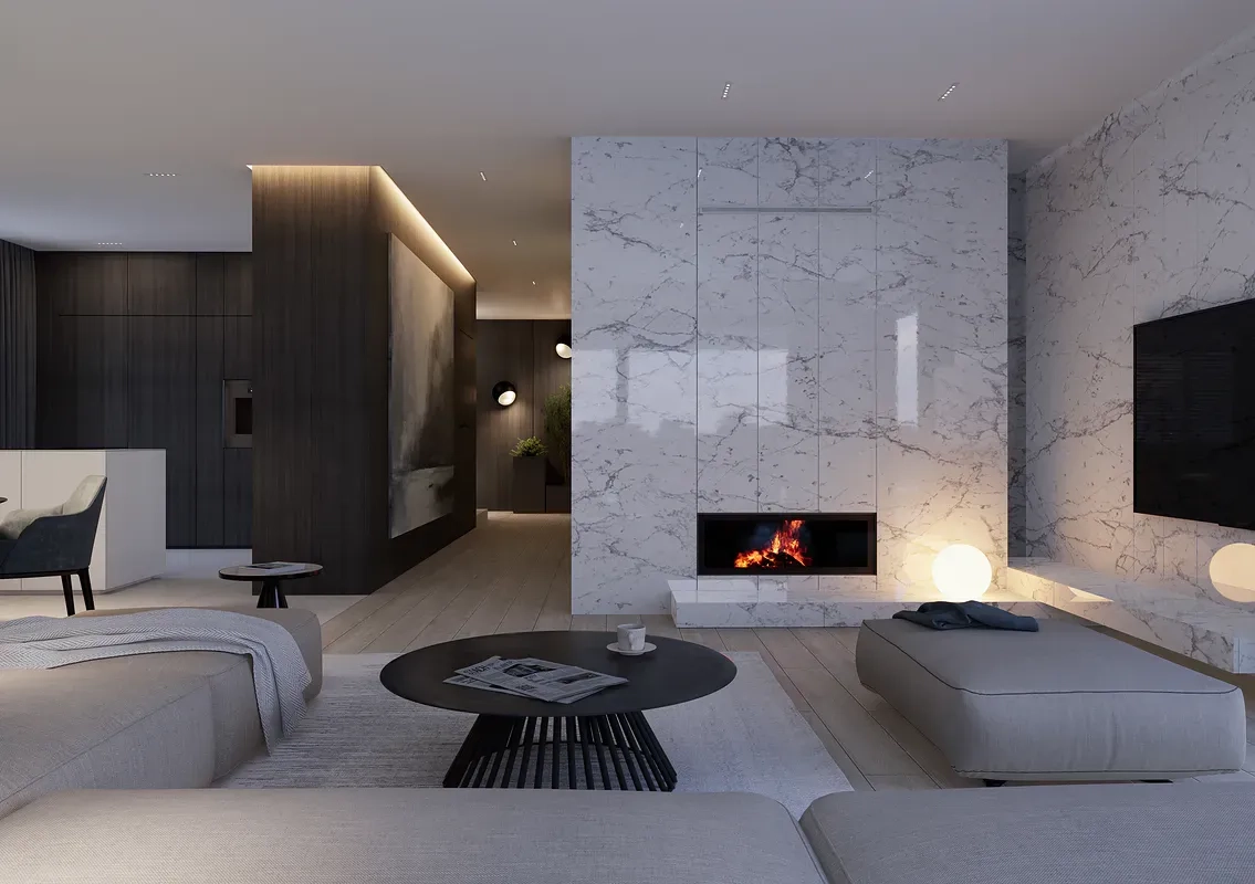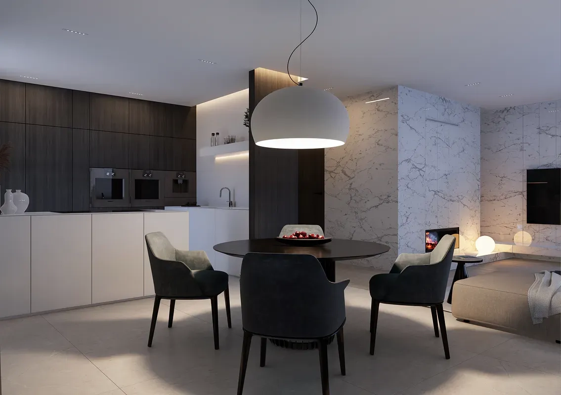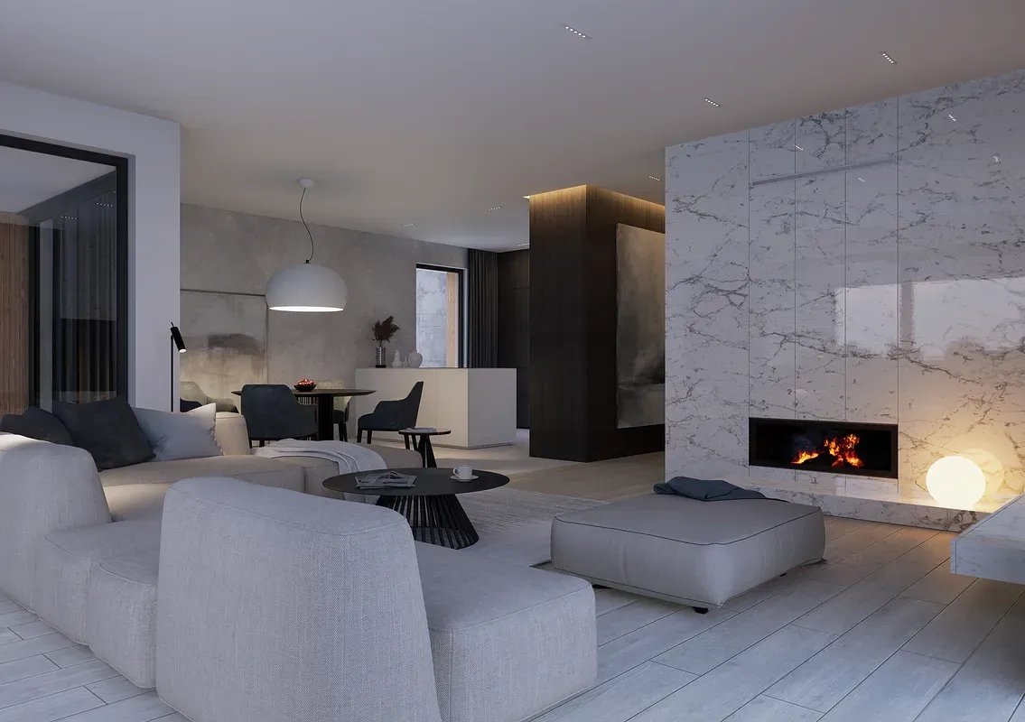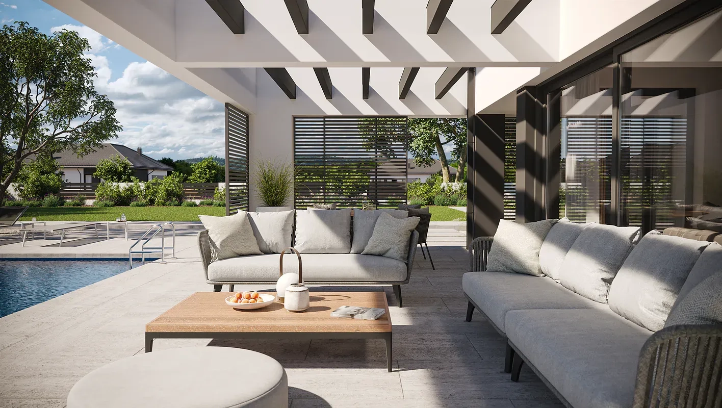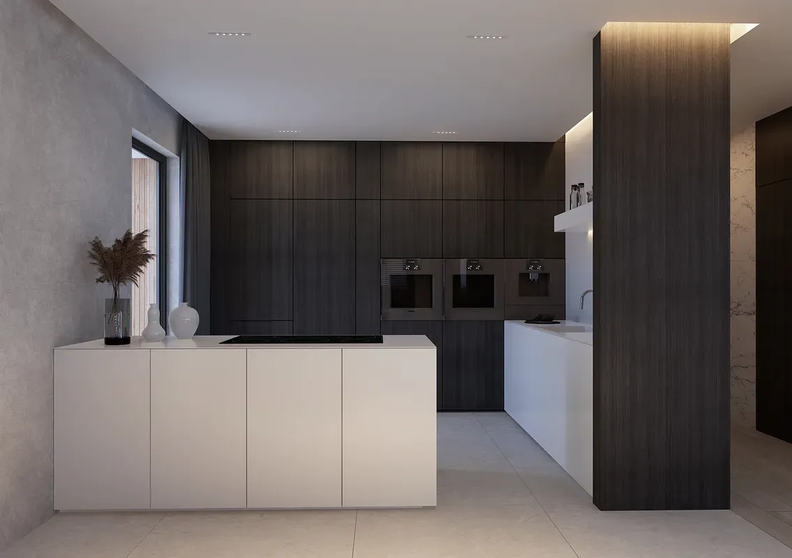 Фасад из силиконовой штукатурки с бетонной структурой белого и графитового цвета в сочетании с фасадным деревом теплого оттенка создает уникальную и вневременную композицию.