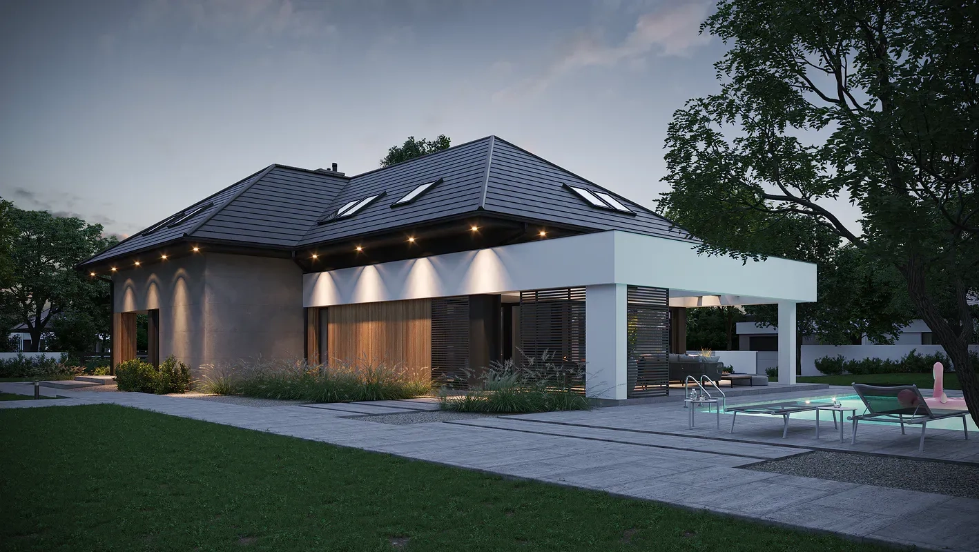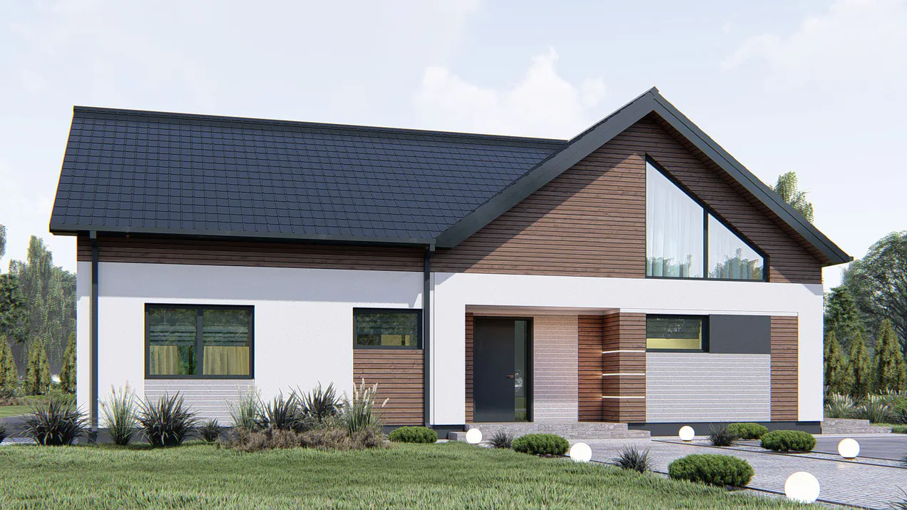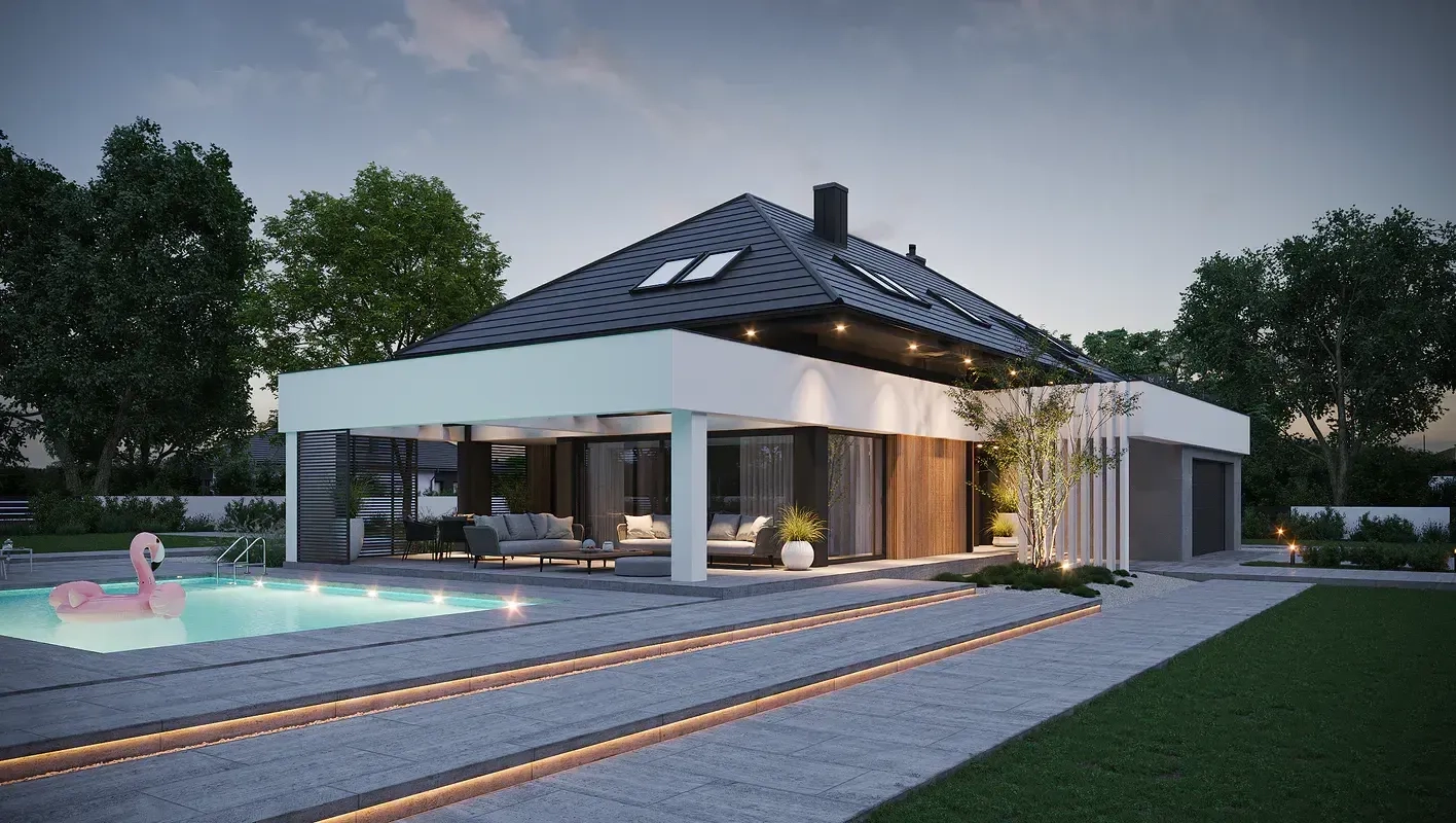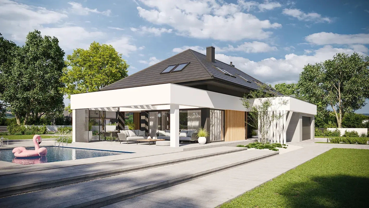 Проект дома в современном стиле с большими внутренними помещениями, разделенными на функциональные зоны. Сочетание современного дизайна с панорамным остеклением делает дом уютным и стильным, а также привлекательным и функциональным для жизни семьи.