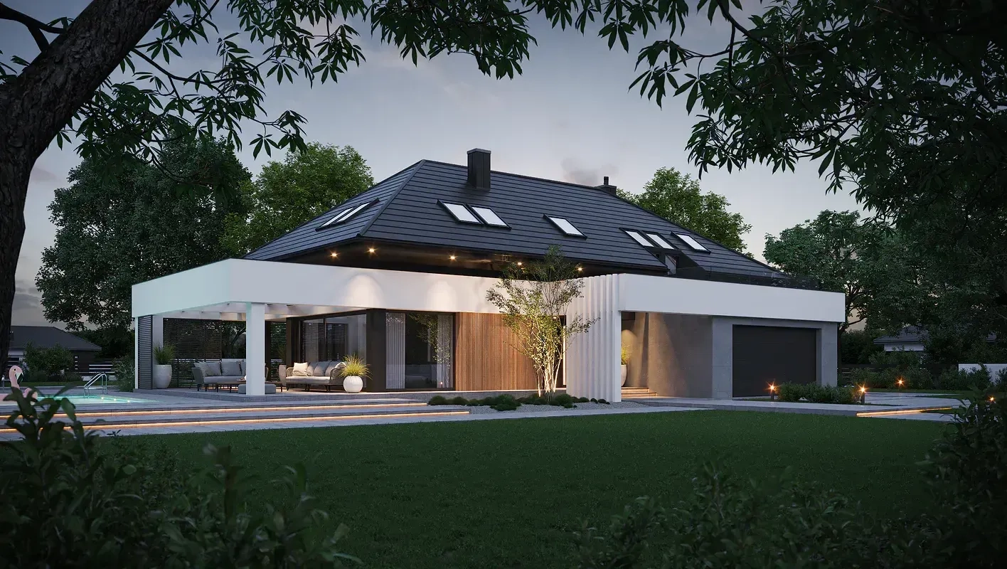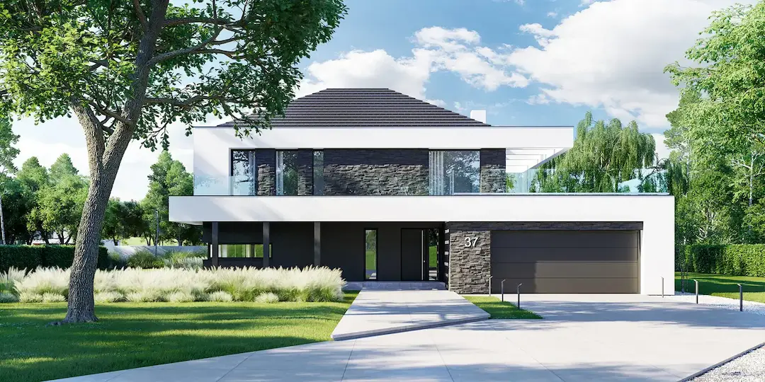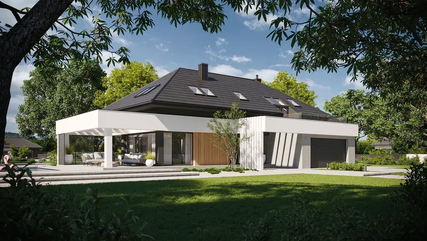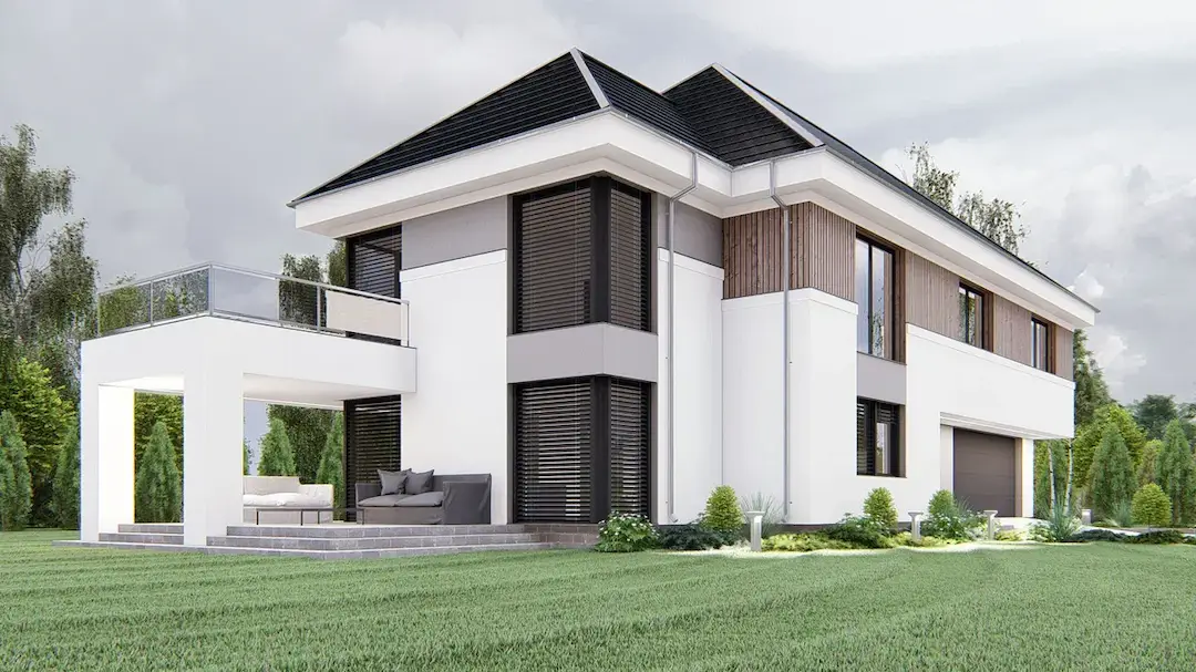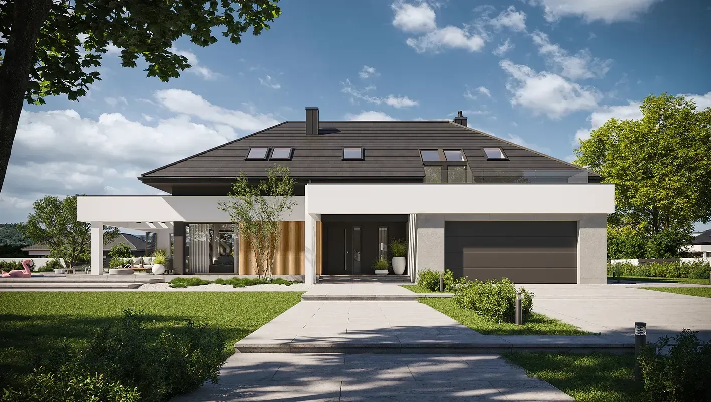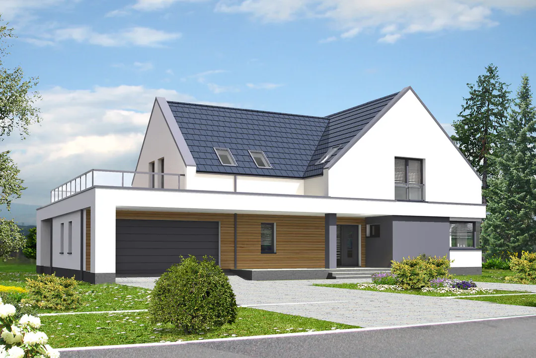 Проект двухэтажного современного дома с вместительным гаражом, многоскатной крышей и террасой.