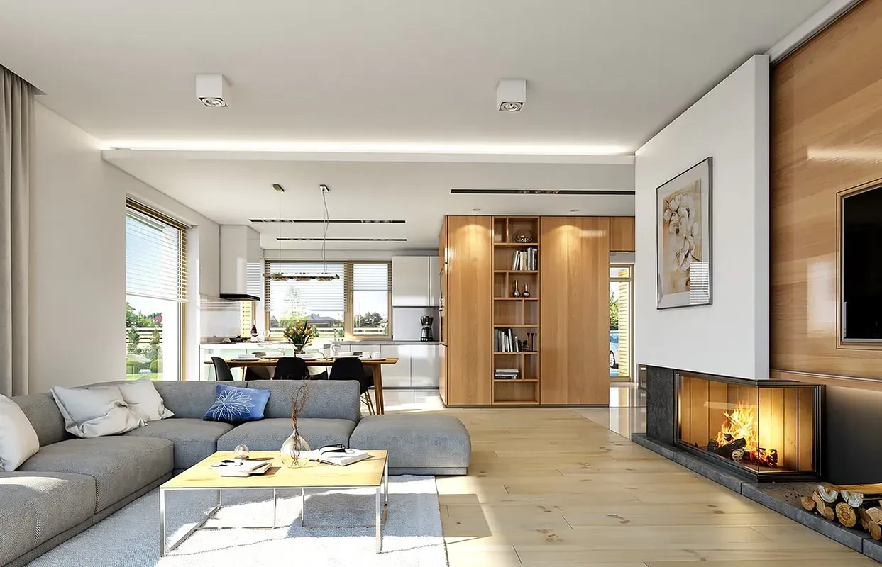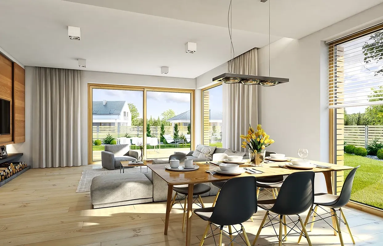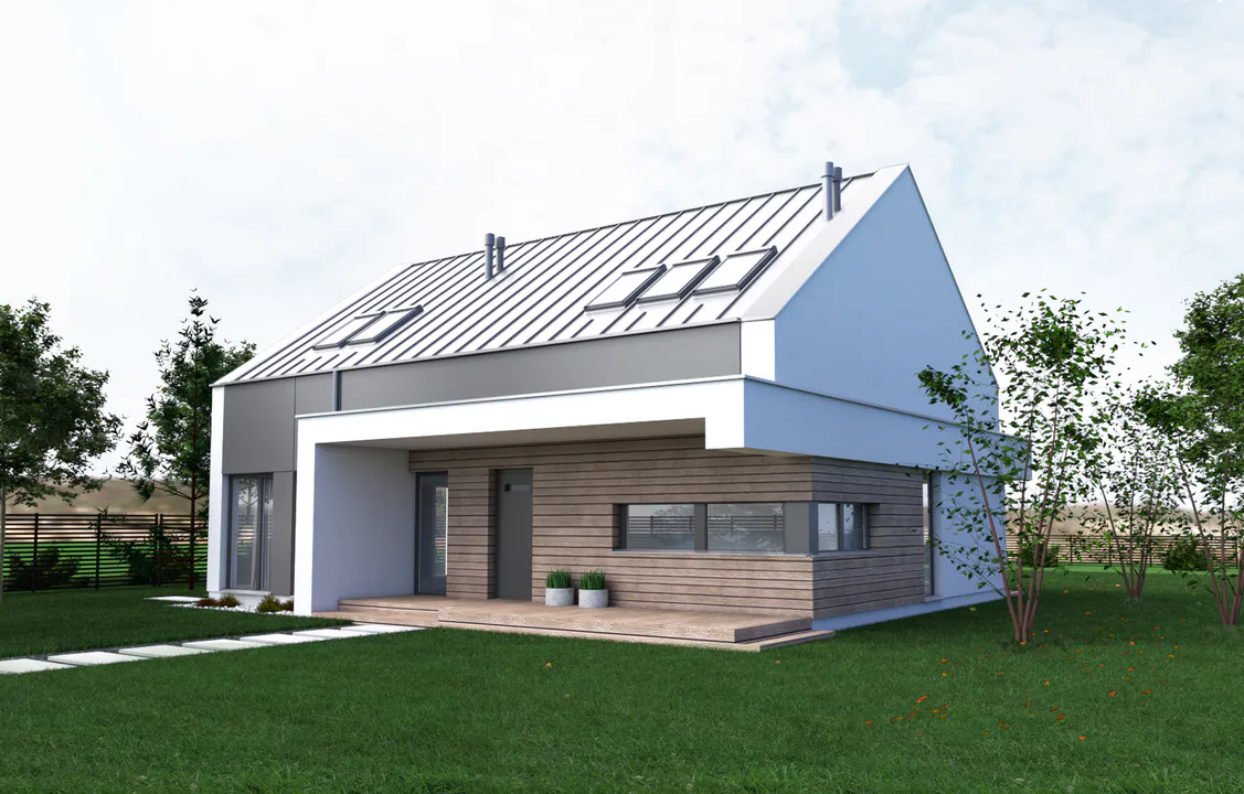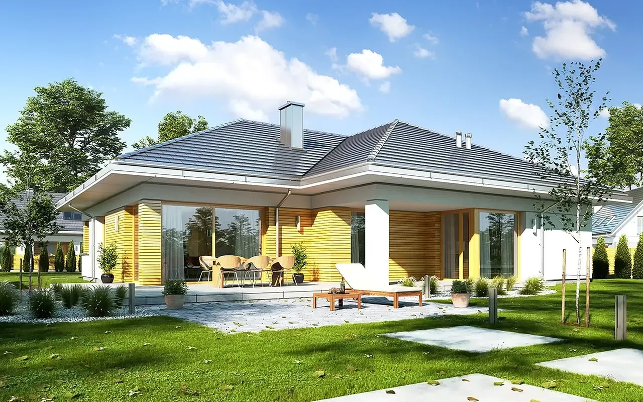 Благодаря четырехскатной форме крыши дом привлекает внимание, несмотря на небольшую высоту. Современную архитектуру подчеркивают большие оконные остекления, в том числе угловое кухонное окно, деревянные фасадные панели, а также белая силиконовая штукатурка.
