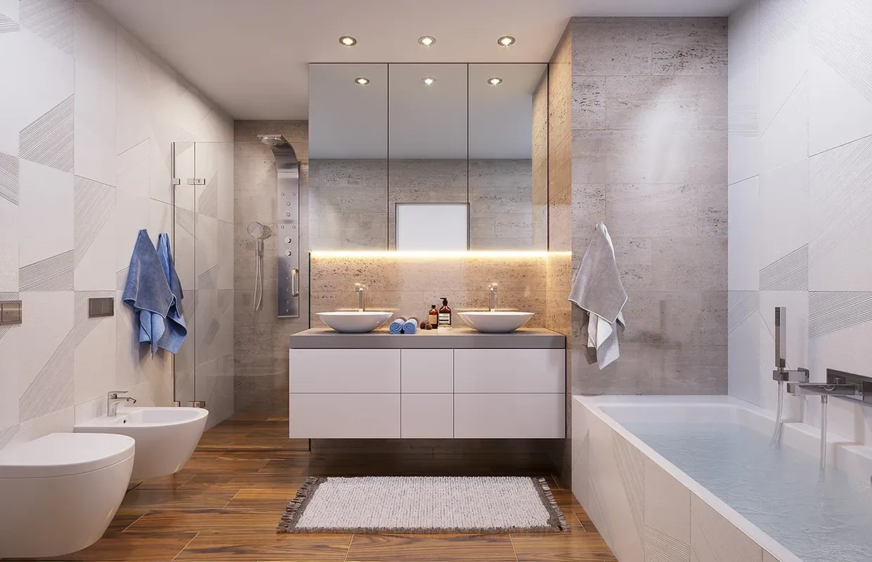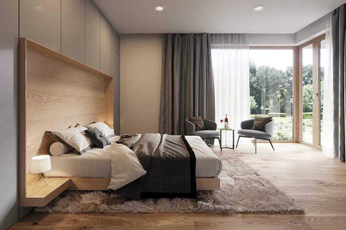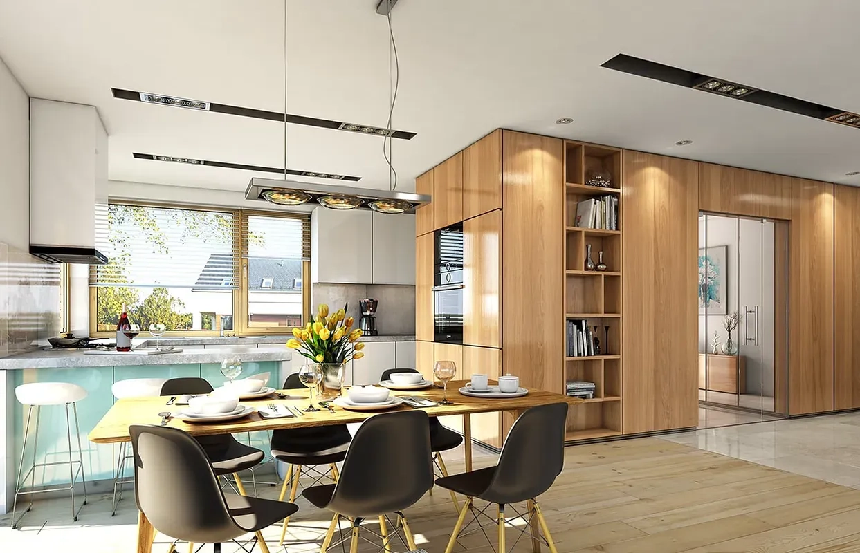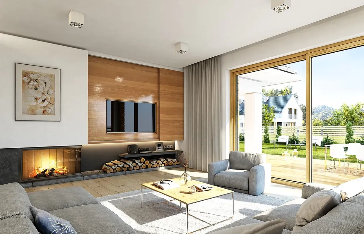 Благодаря четырехскатной форме крыши дом привлекает внимание, несмотря на небольшую высоту. Современную архитектуру подчеркивают большие оконные остекления, в том числе угловое кухонное окно, деревянные фасадные панели, а также белая силиконовая штукатурка.