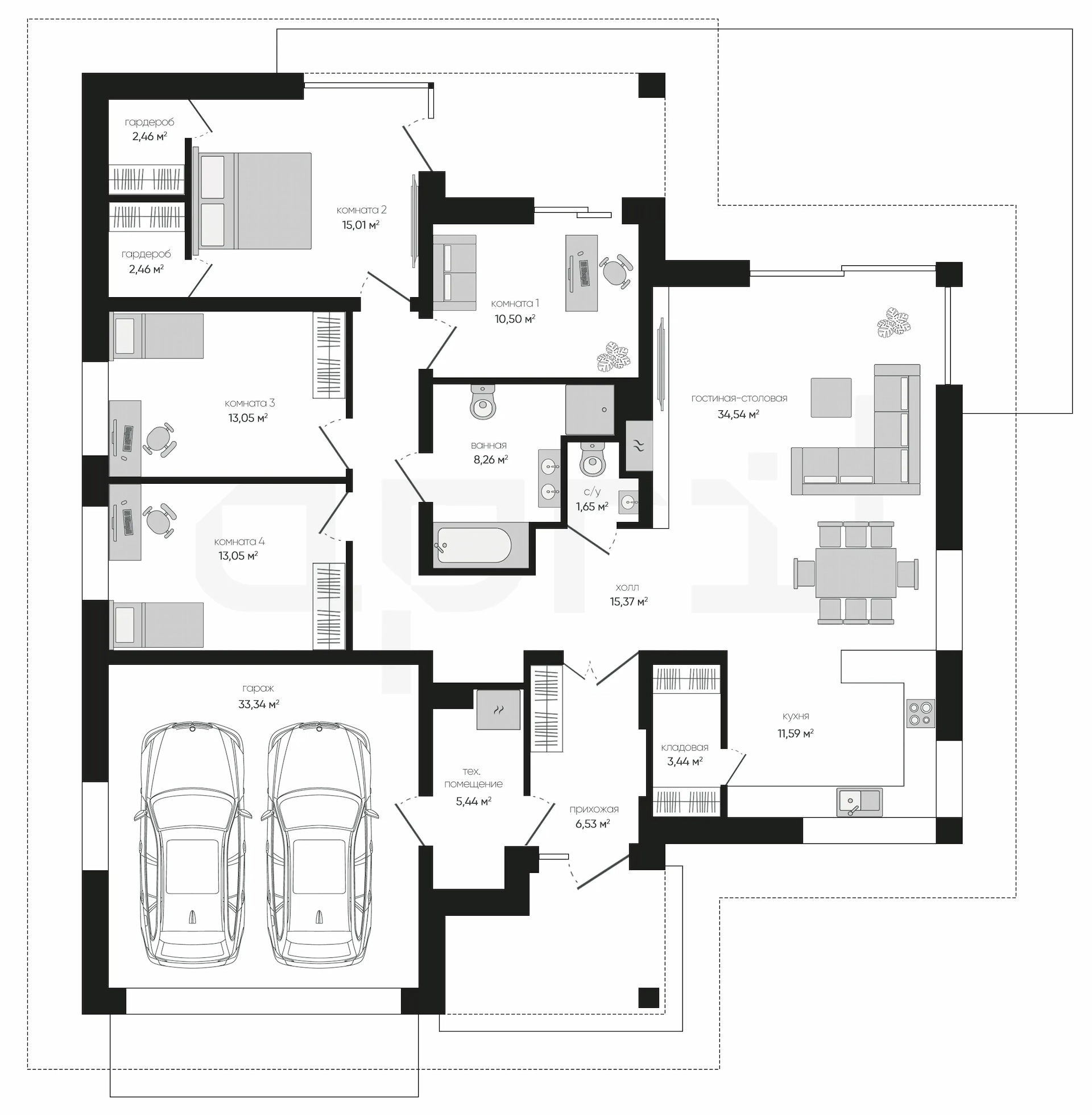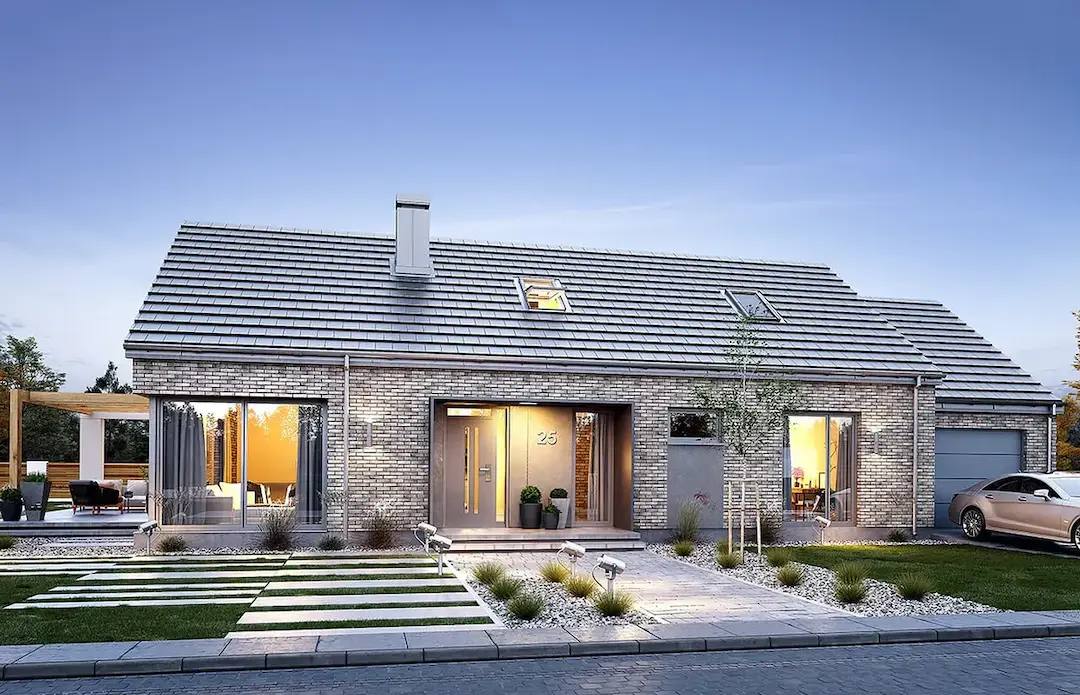 Проект одноэтажного современного дома с гаражом, террасой и чердаком свободного назначения.