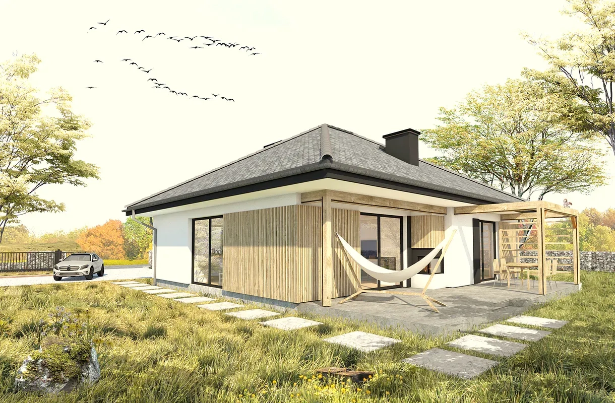 Функциональный одноэтажный дом с четырехскатной крышей для 3-4 человек.