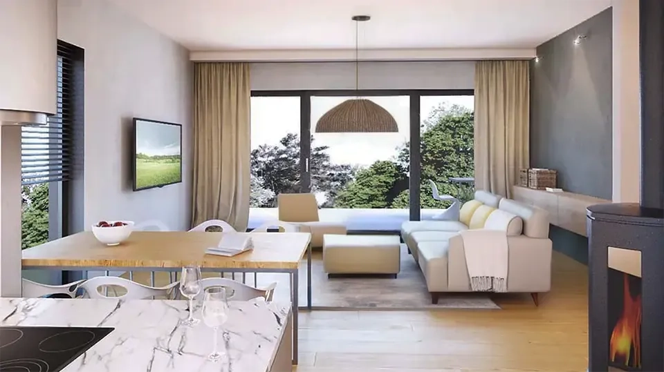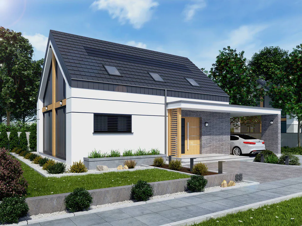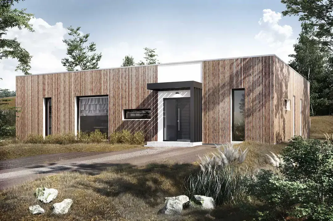 Дом в современном стиле с отделкой фасада под дерево и большими панорамными окнами. Дом гармонично сочетает в себе современность и красоту природы.