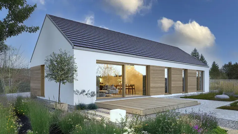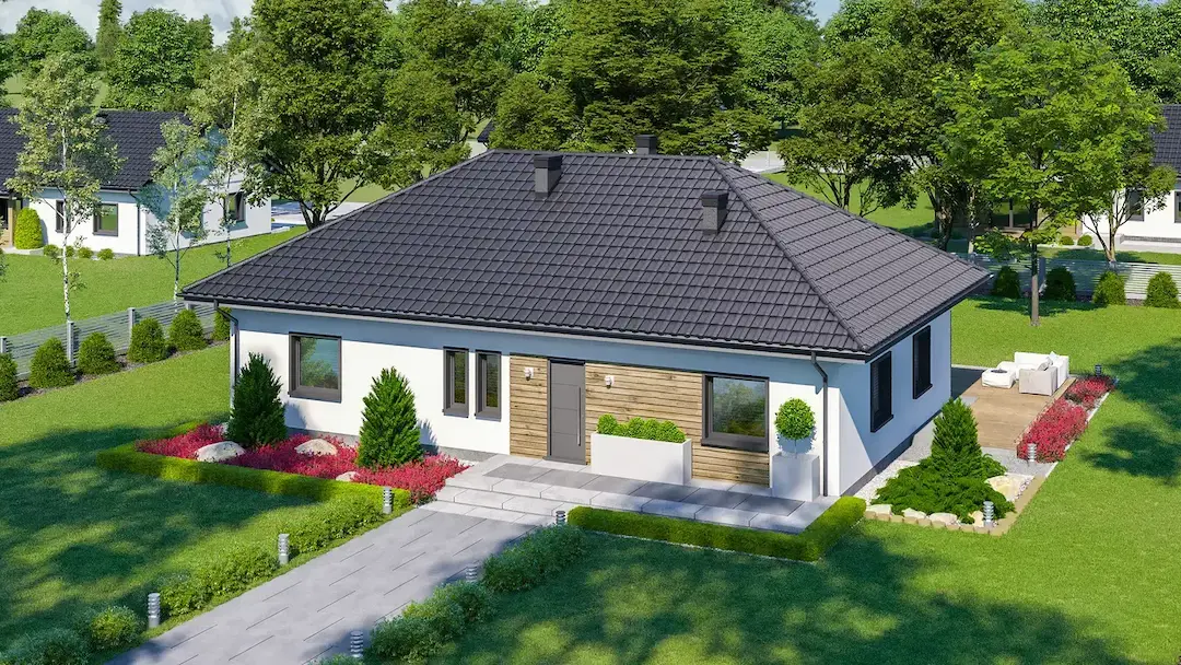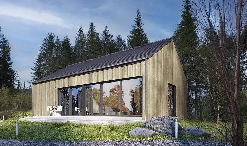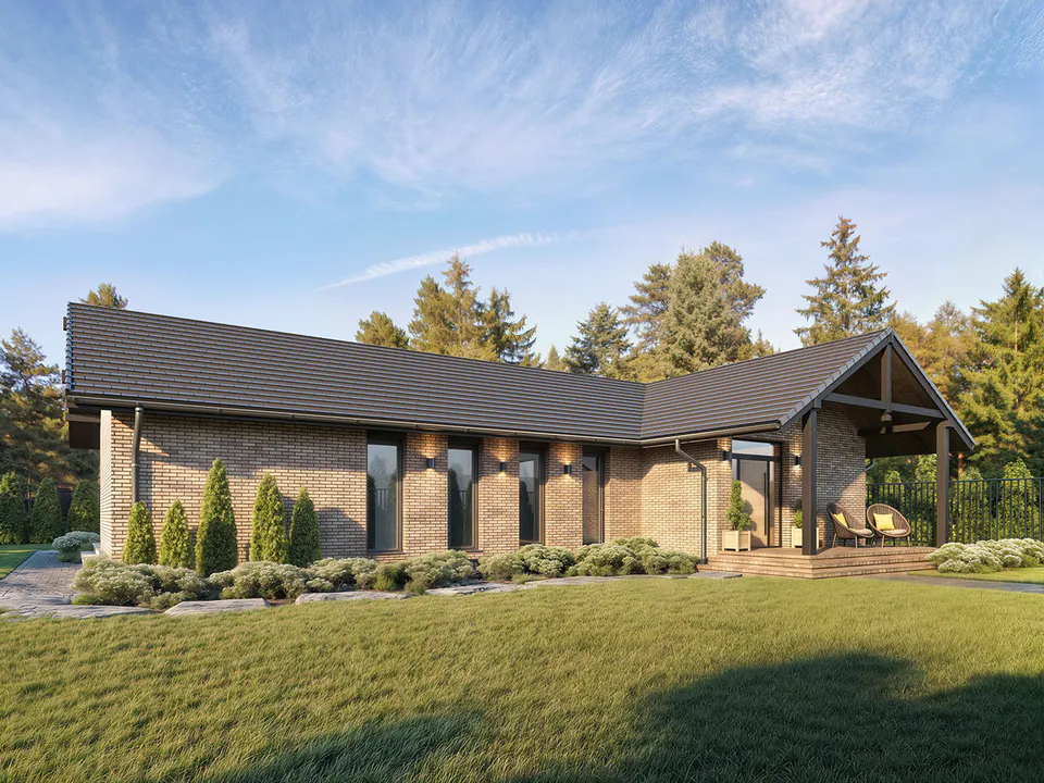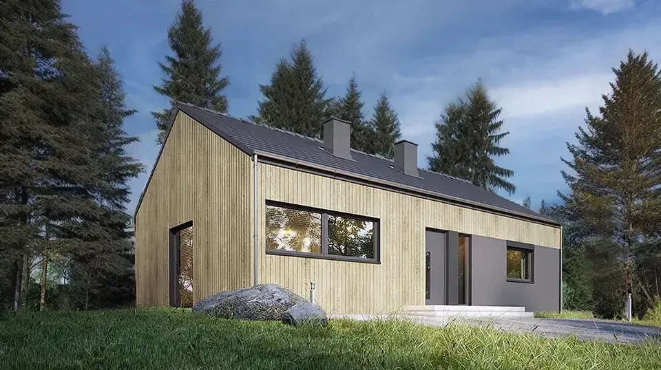Проект одноэтажного дома представляет собой простую в реализации форму с двускатной крышей и фасадом, отделанным деревянной облицовкой. Изюминка данного дома – большая площадь остекления. Высокие окна придают дому нарядный и воздушный вид.