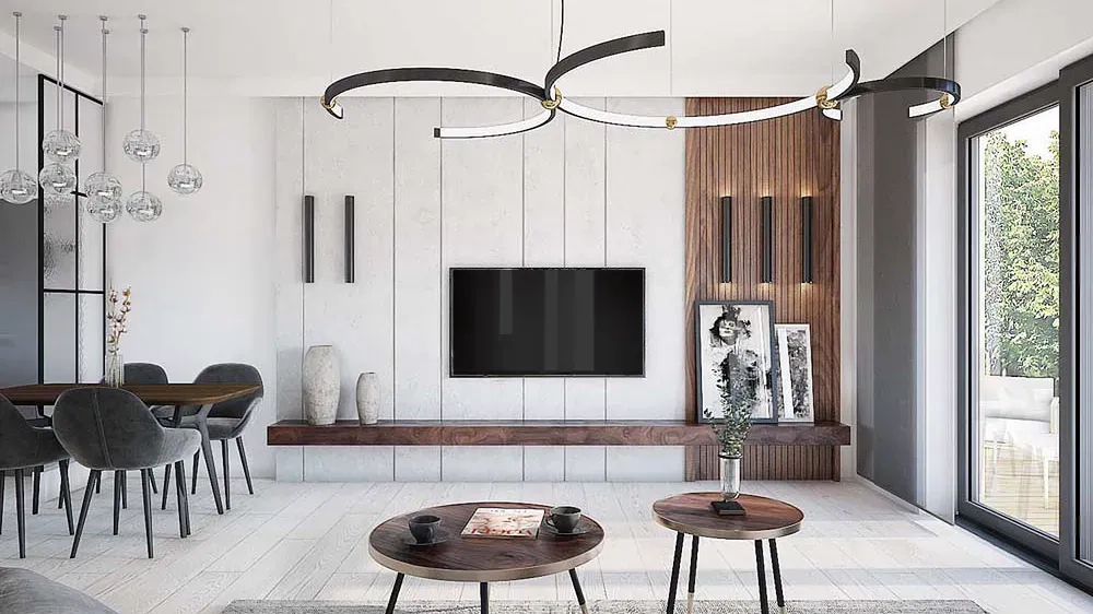 Фасад дома сочетает в себе белую и серую декоративную штукатурку, а также элементы облицовки из дерева, что создает стильное и уютное впечатление. Крыша дома серая, двускатная с плоской керамической черепицей.