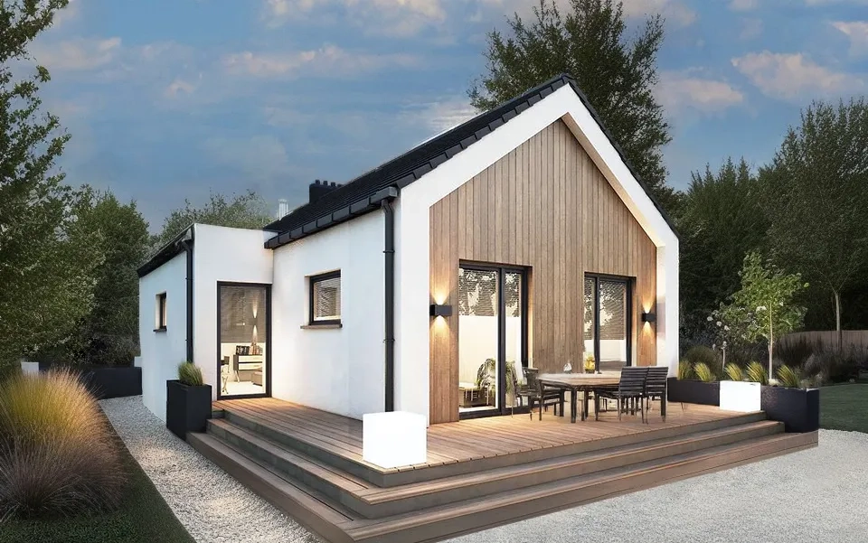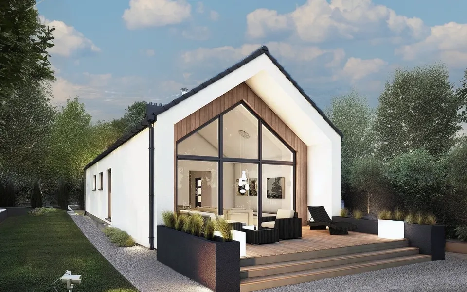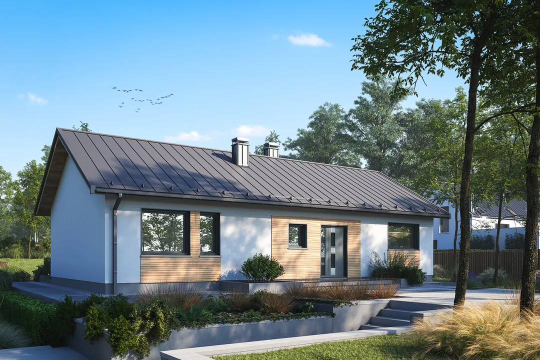 Проект современного одноэтажного дома с двускатной крышей и террасой.