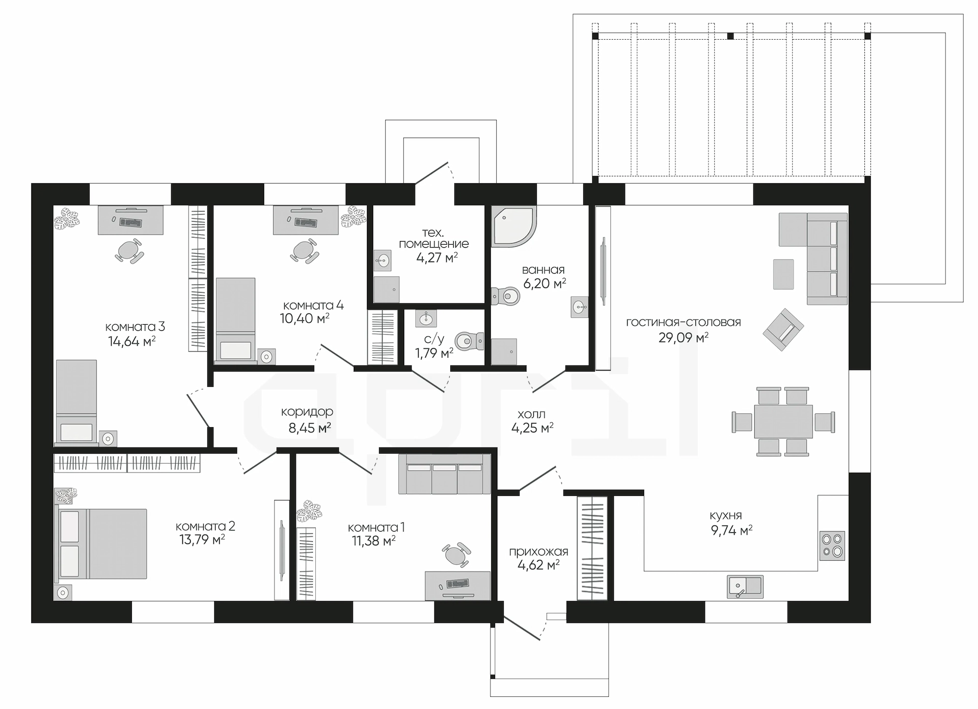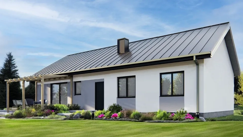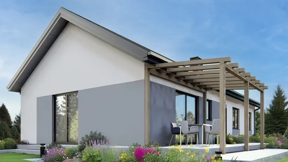Проект одноэтажного дома с двускатной крышей и террасой.