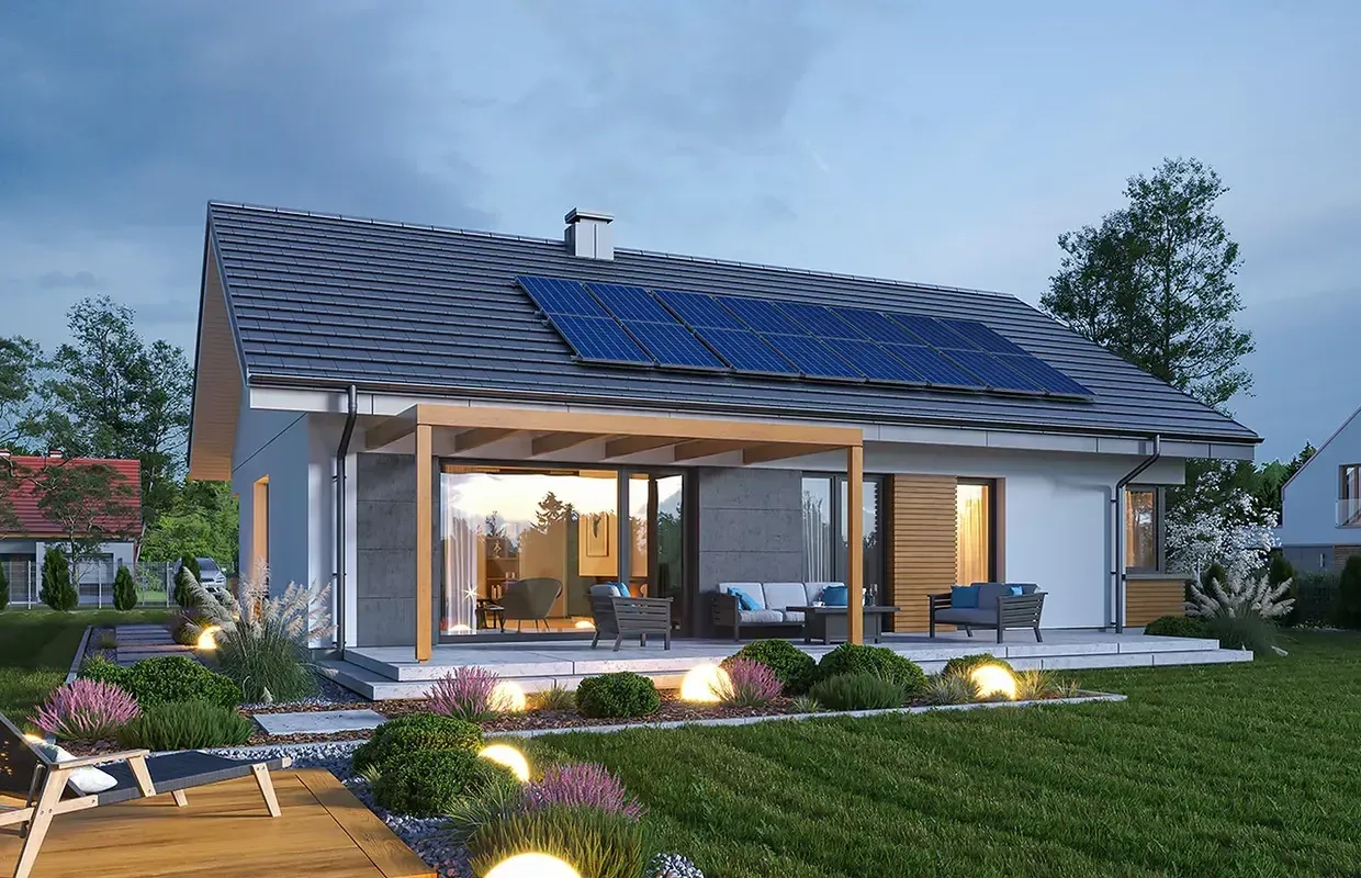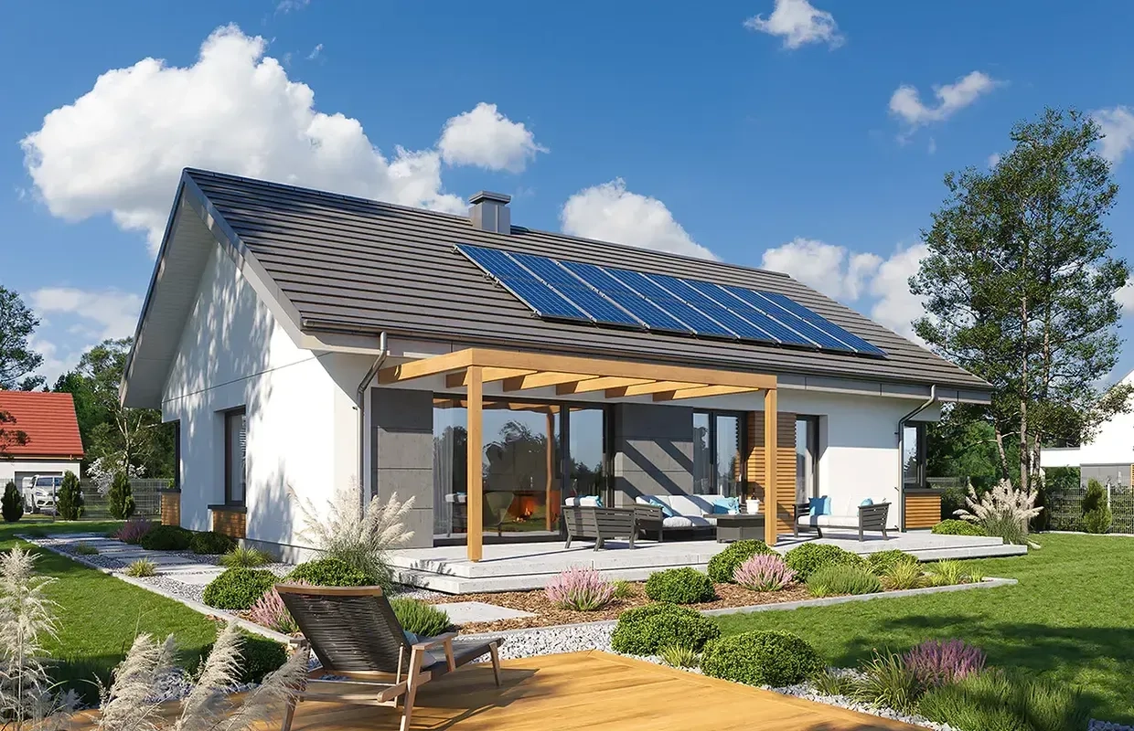 Проект одноэтажного дома с двускатной крышей и террасой.