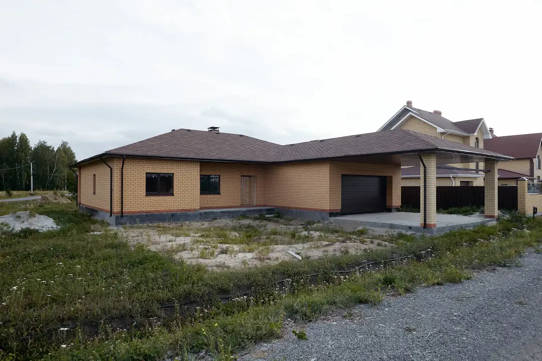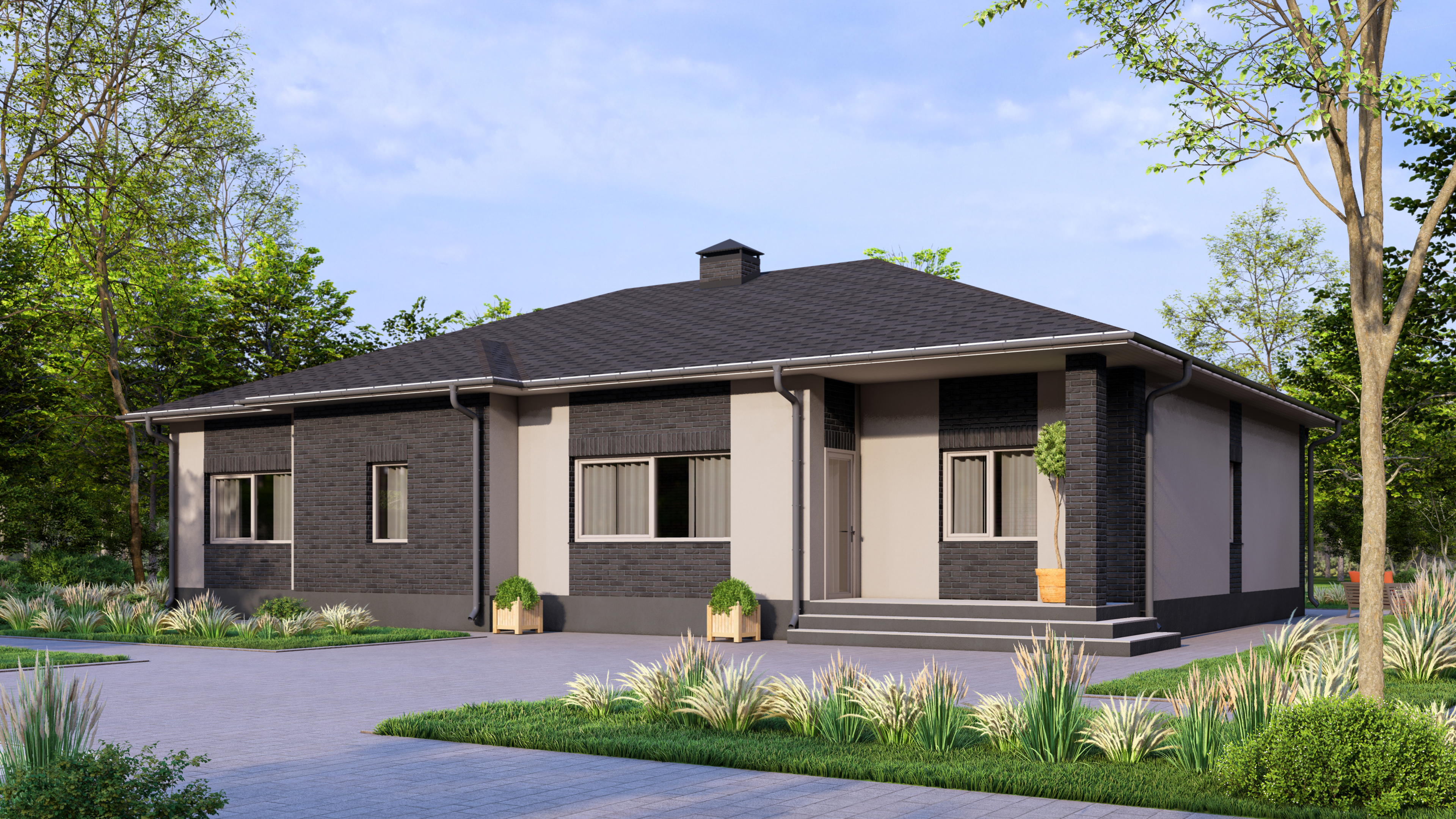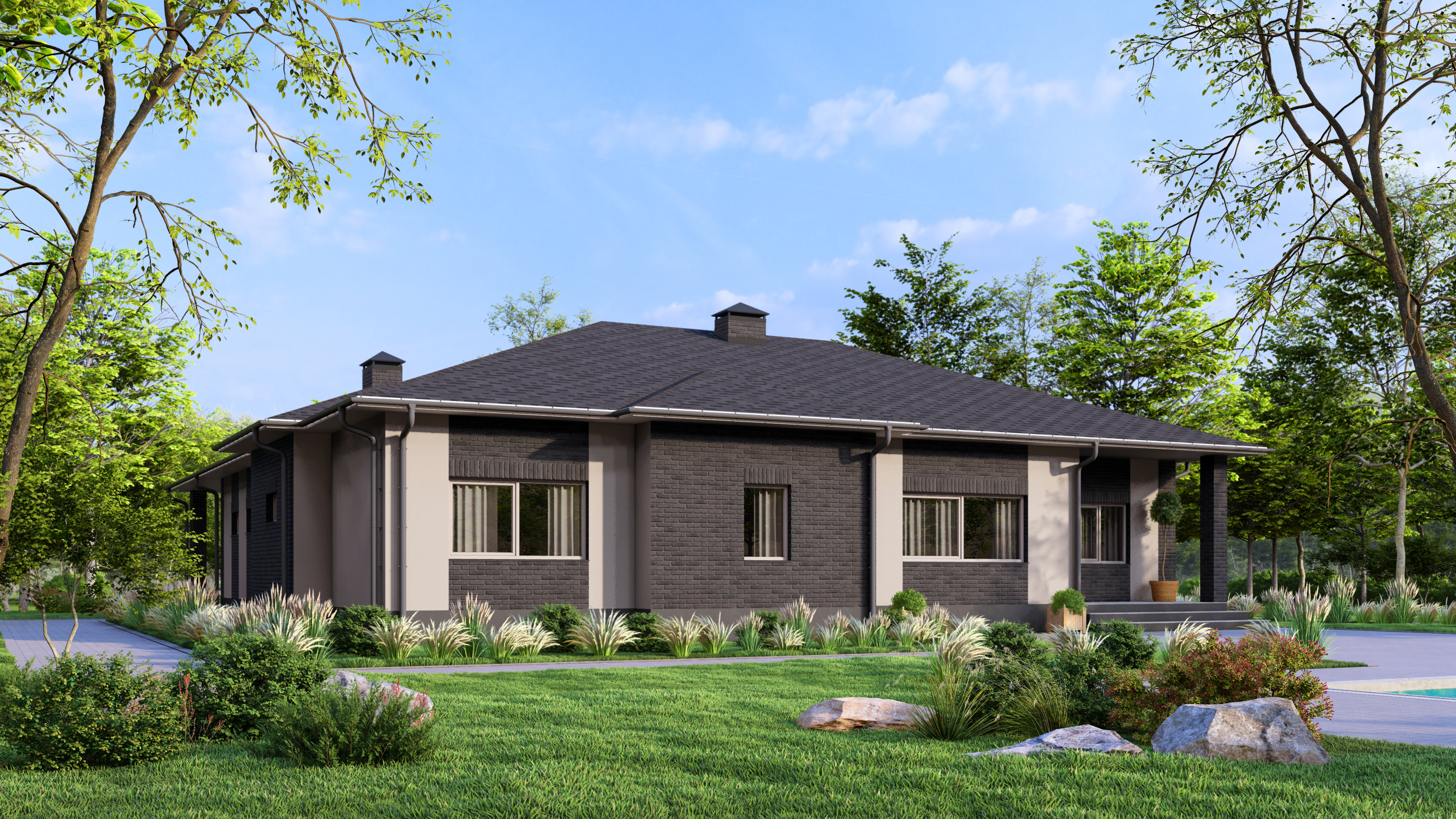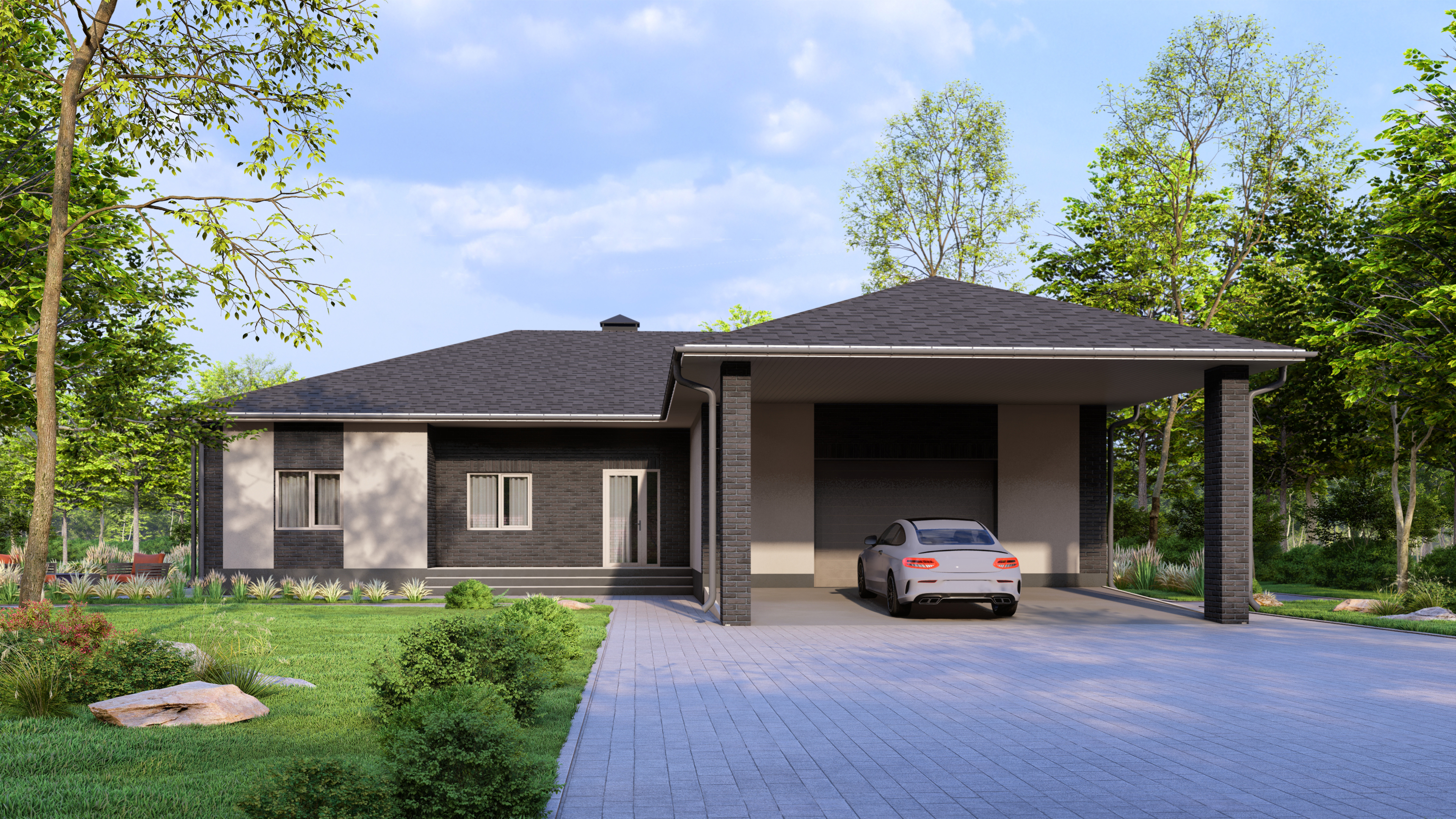 Одноэтажный дом в классическом стиле с примыкающим гаражом и навесом для машины. Дом имеет удобную функциональную планировку и зону отдыха с хаммамом.