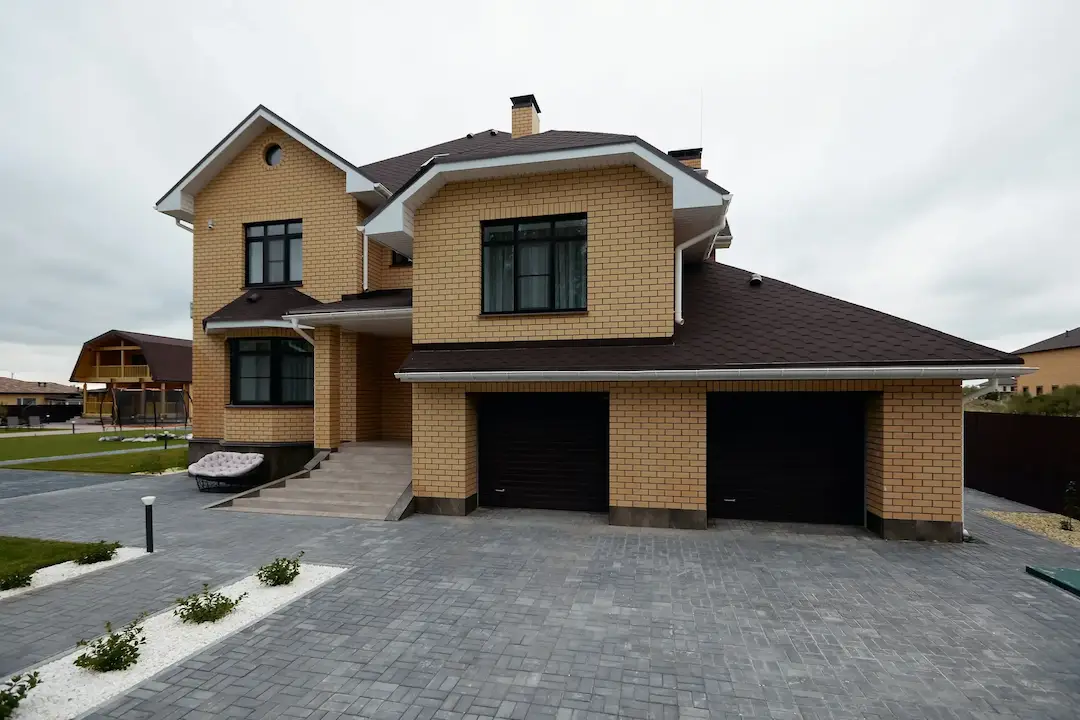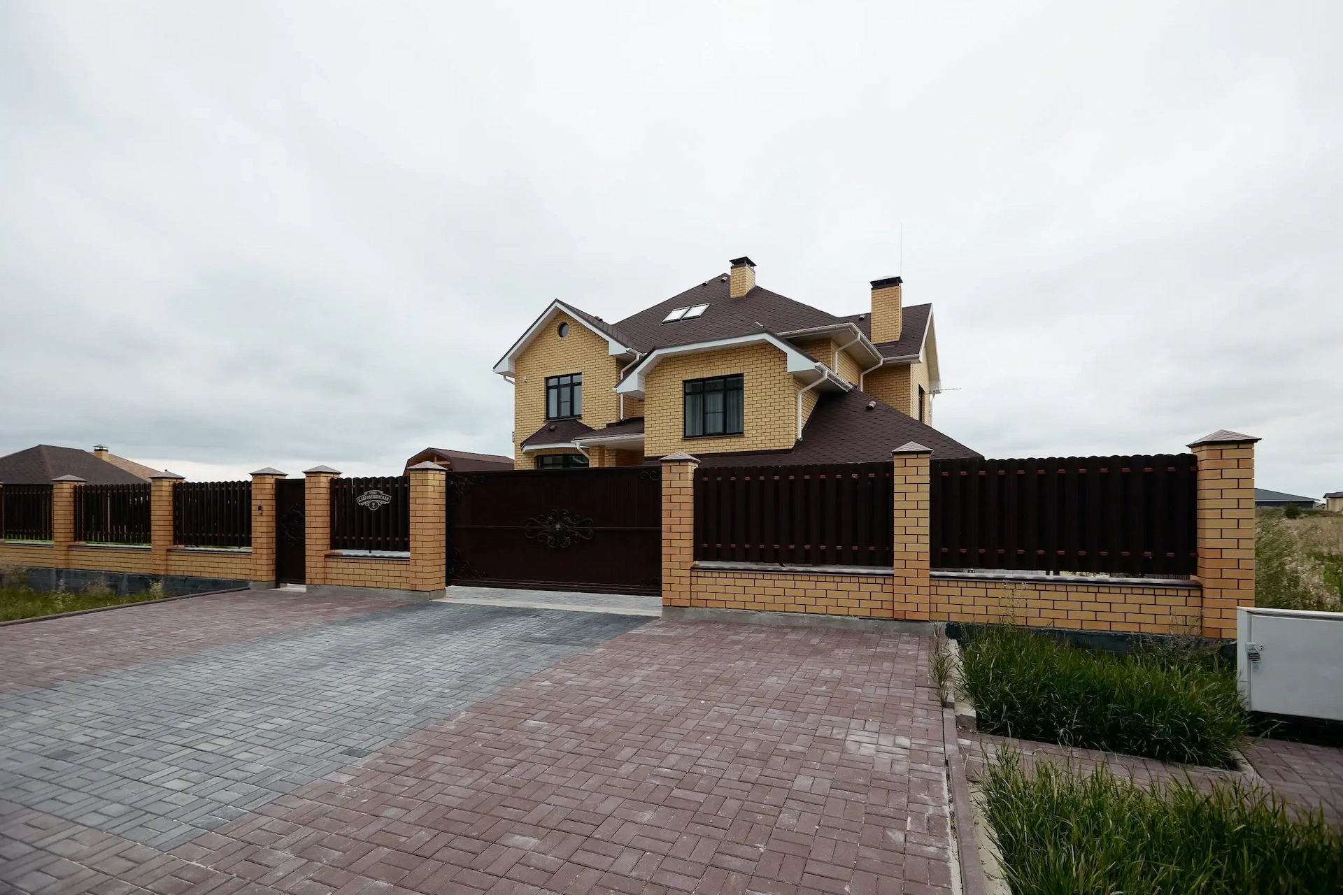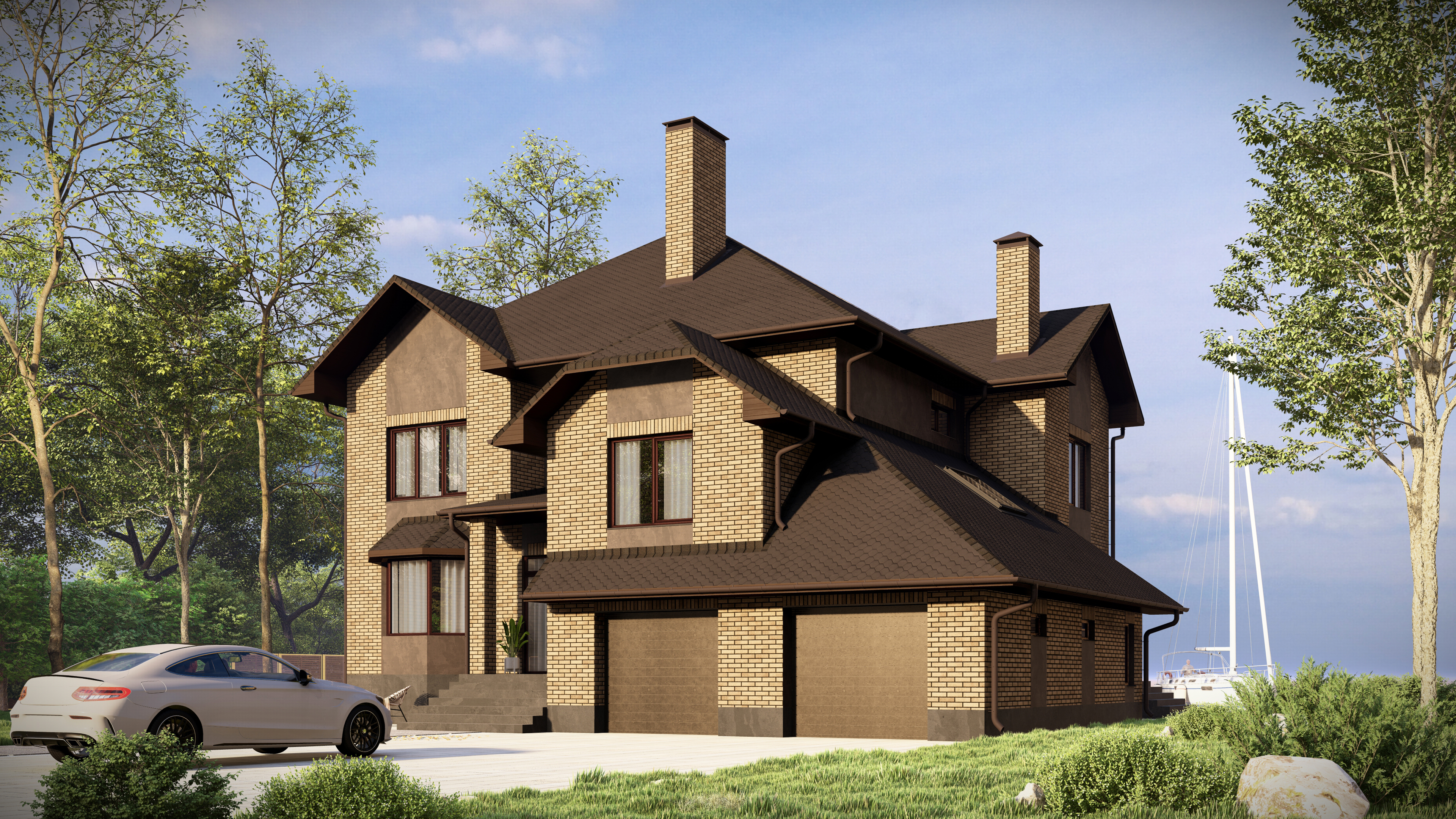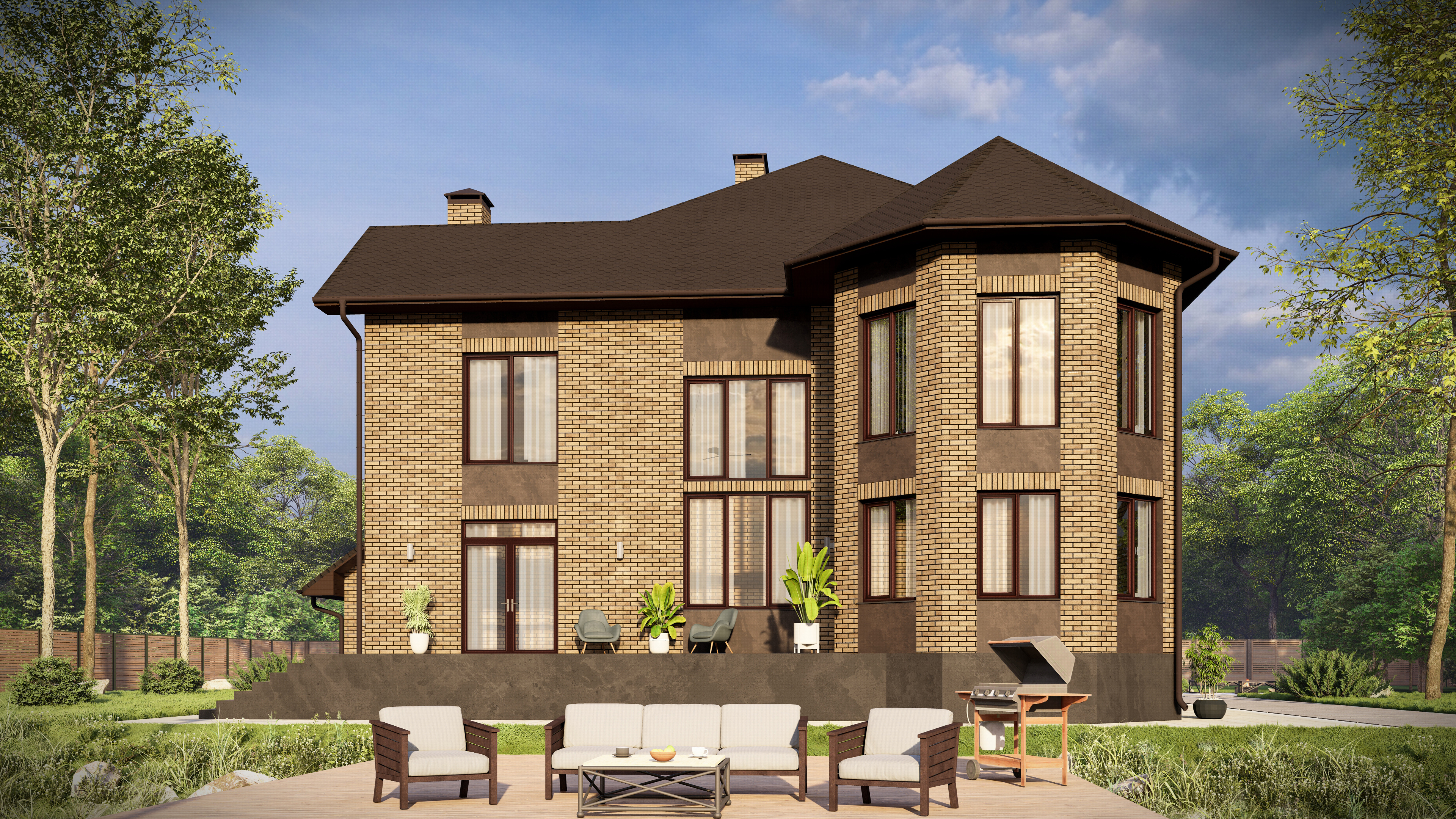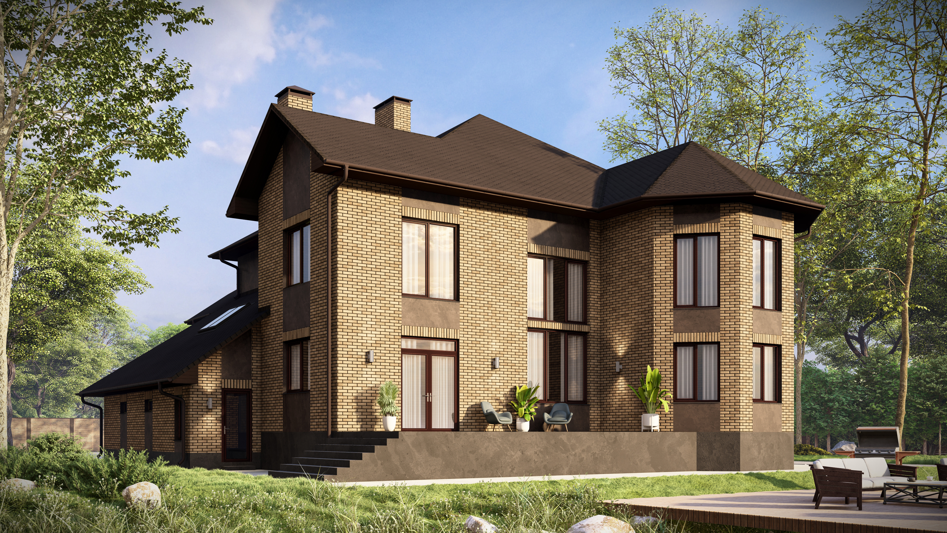 Фасад дома облицован желтым кирпичом, фасадной плиткой под камень и украшен фасадным элементом – эркером. Выделяет этот дом интересная темно-коричневая крыша, что добавляет дому оригинальности и изящности.