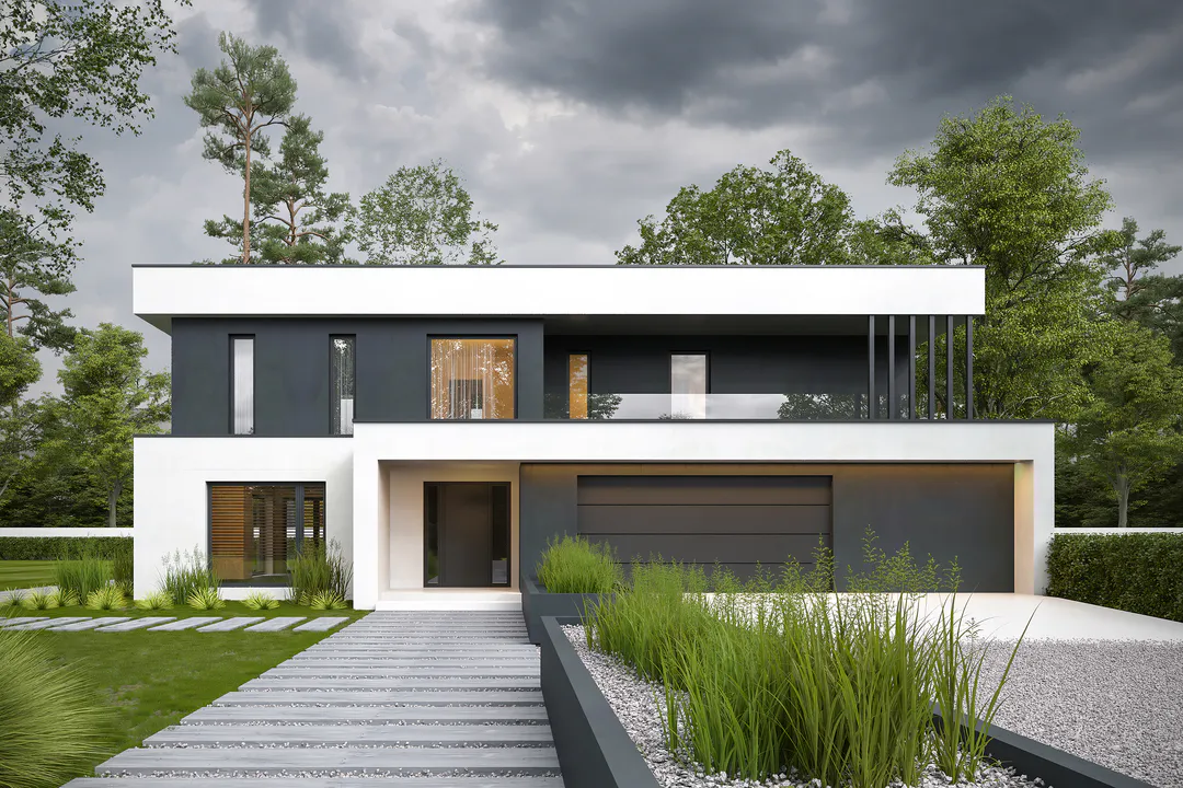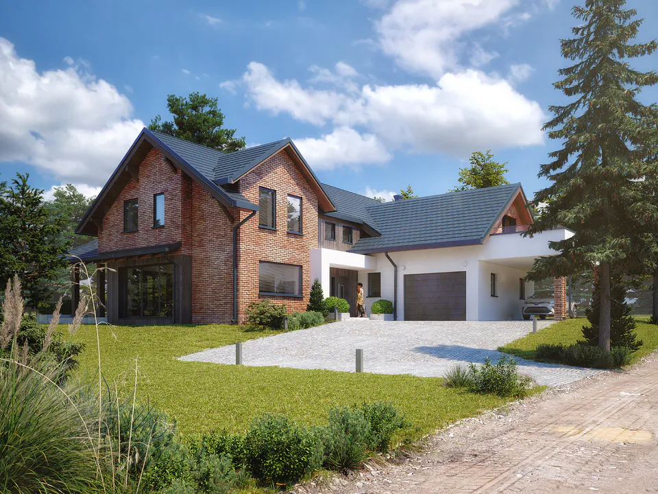 Дом имеет несколько крытых входов, интегрированный гараж, крытую террасу и представляет собой элегантное сочетание комфорта и роскоши.