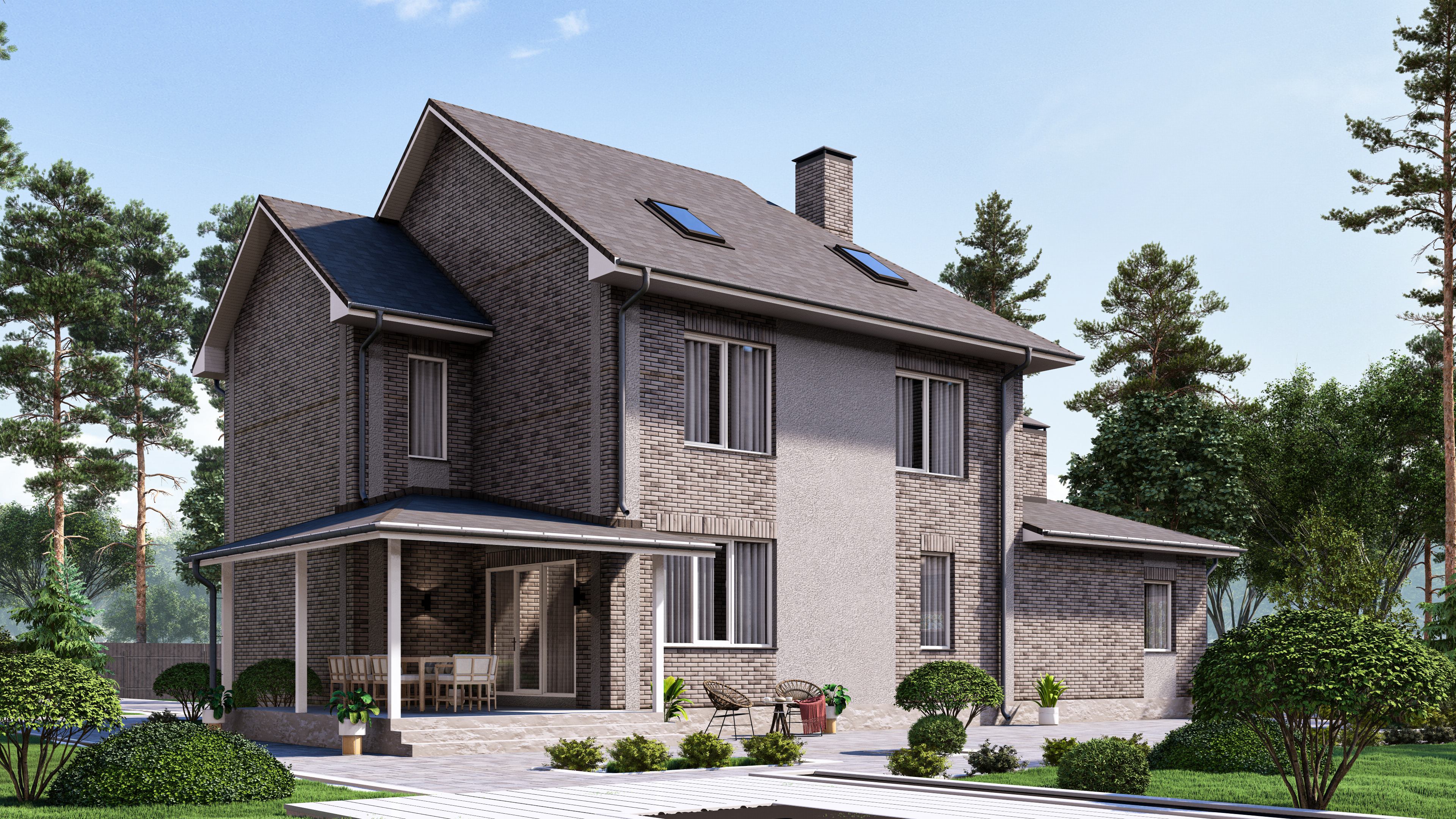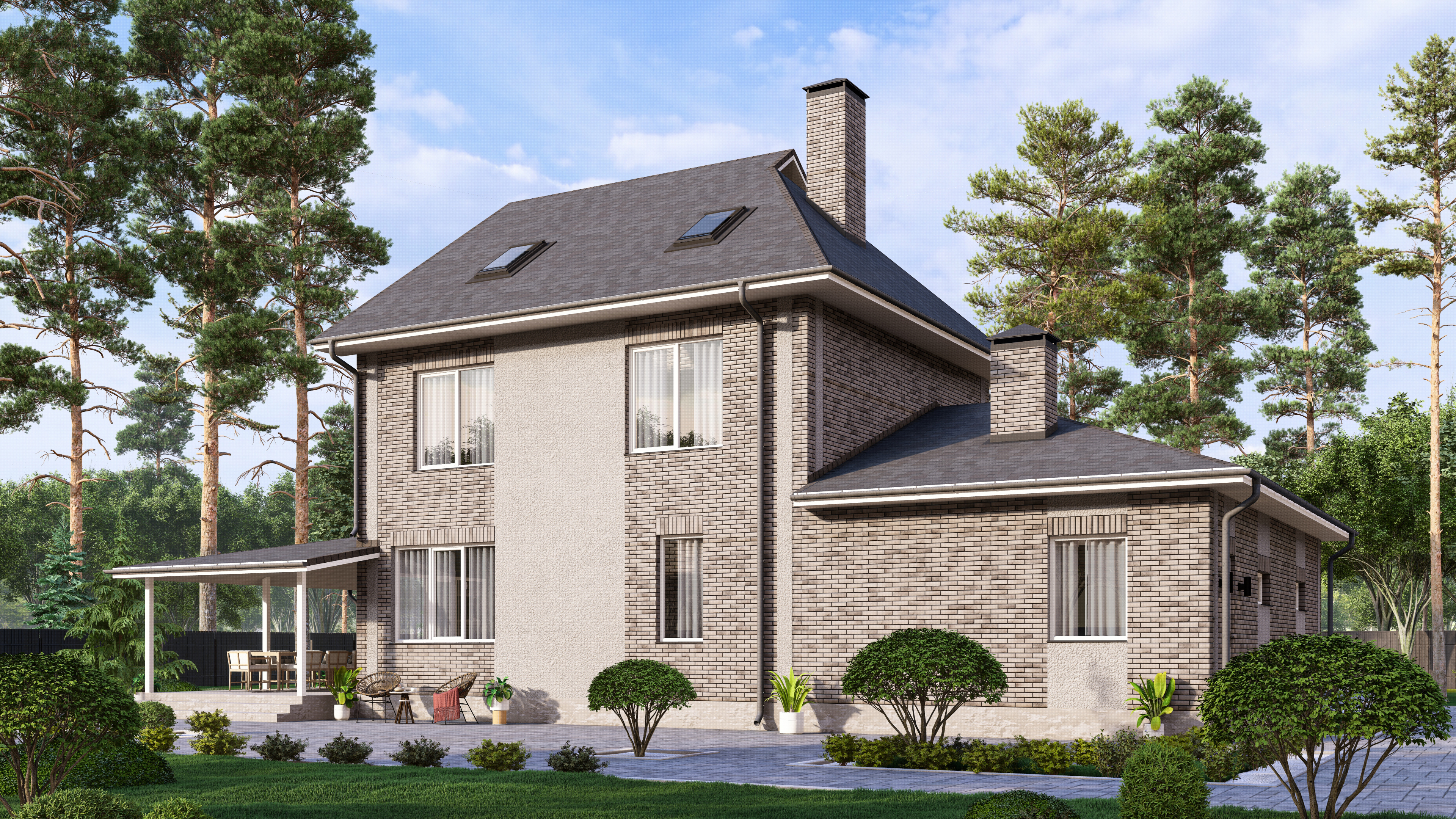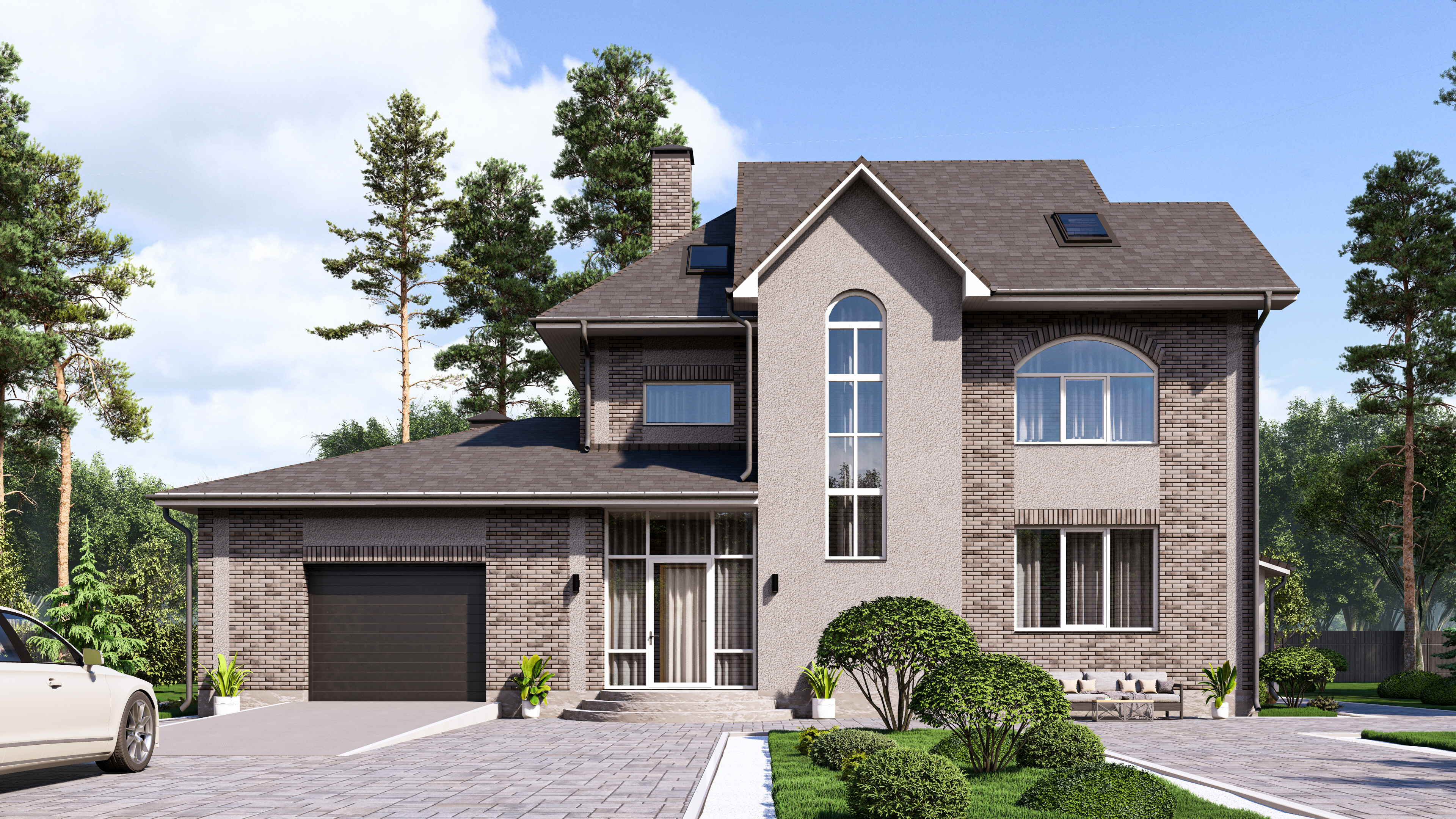Проект трехэтажного дома выполнен в современном стиле с элементами классики. Фасад дома отделан светлым кирпичом и штукатуркой серого цвета, создавая стильное и гармоничное сочетание. Крыша имеет многоскатную форму и покрыта плоской серой черепицей. Окна прямоугольные и арочные с белыми рамами, придающими дому дополнительный шарм и утонченность.