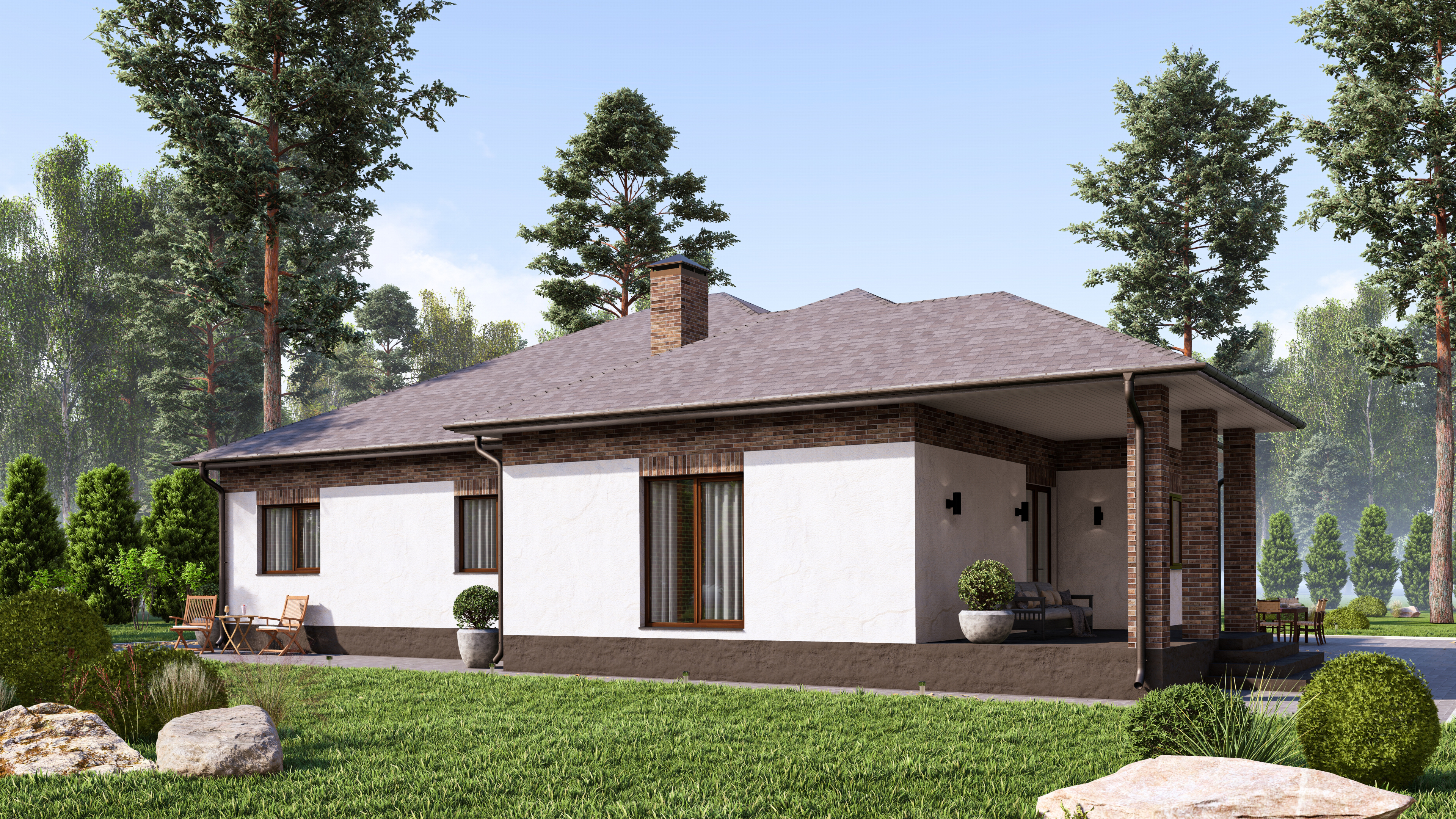 Фасад покрыт бежевой штукатуркой с элементами клинкерной плитки. В сочетании с контрастным темным цветом крыши, дверей, оконных рам и ворот гаража, светлый фасад создает современный классический стиль, а также уютное и ухоженное общее впечатление.