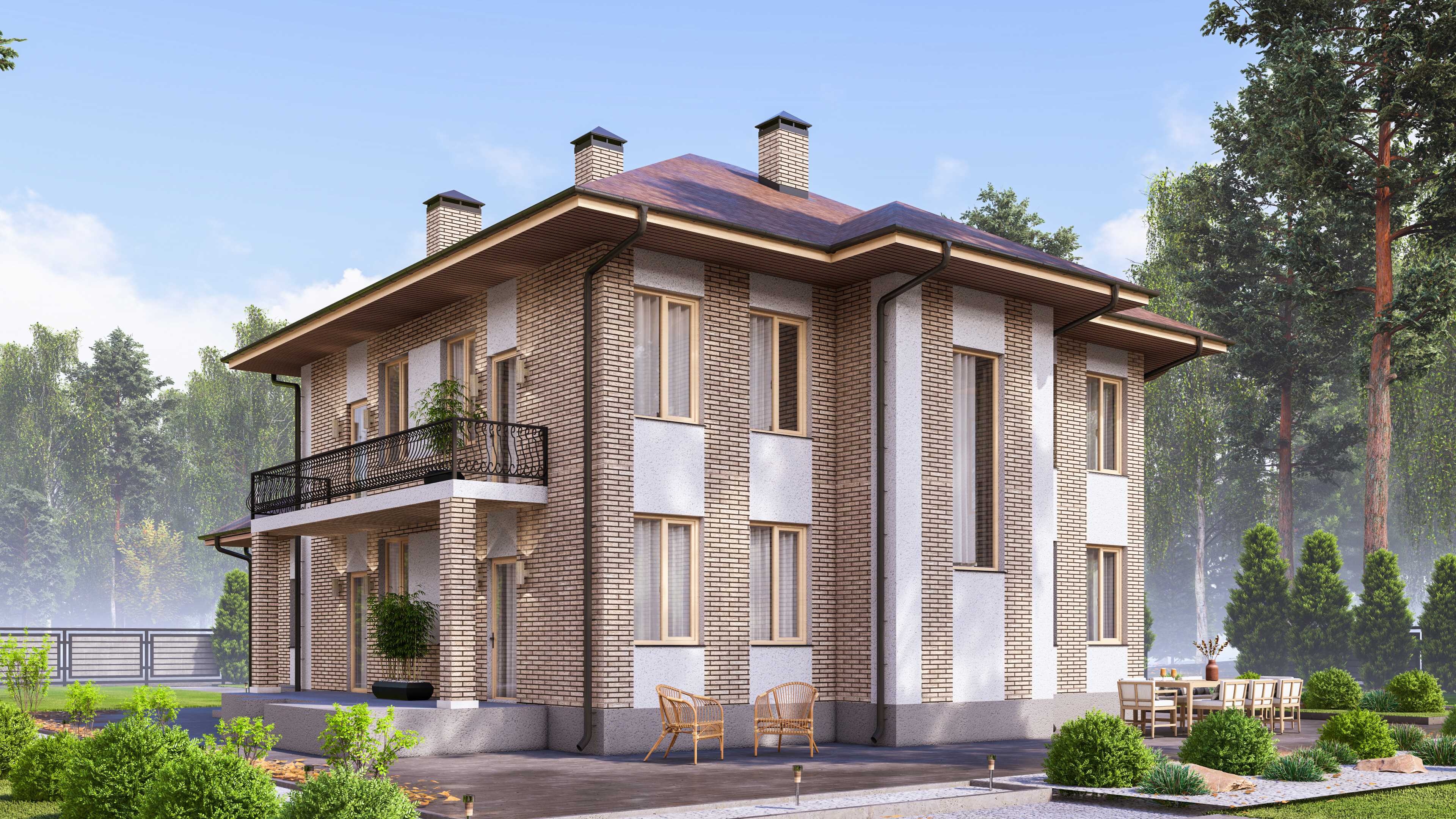 Двухэтажный дом с эркером высотой на все два этажа, что существенно добавляет дневного света в гостиную и в большую спальню на втором этаже. Застекленная лоджия дает возможность насладиться видом в любую погоду, а просторная терраса является отличным местом для отдыха на свежем воздухе.