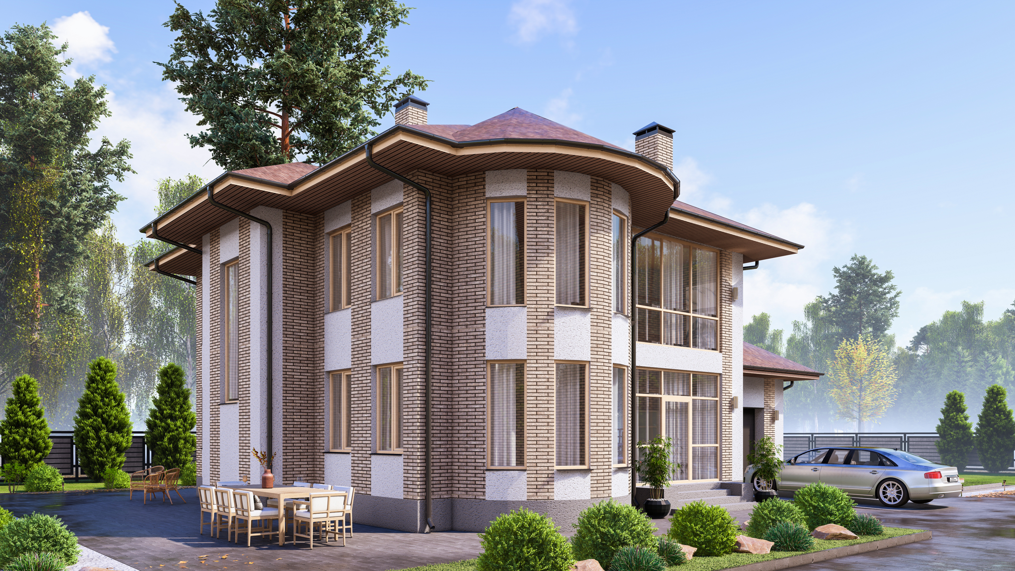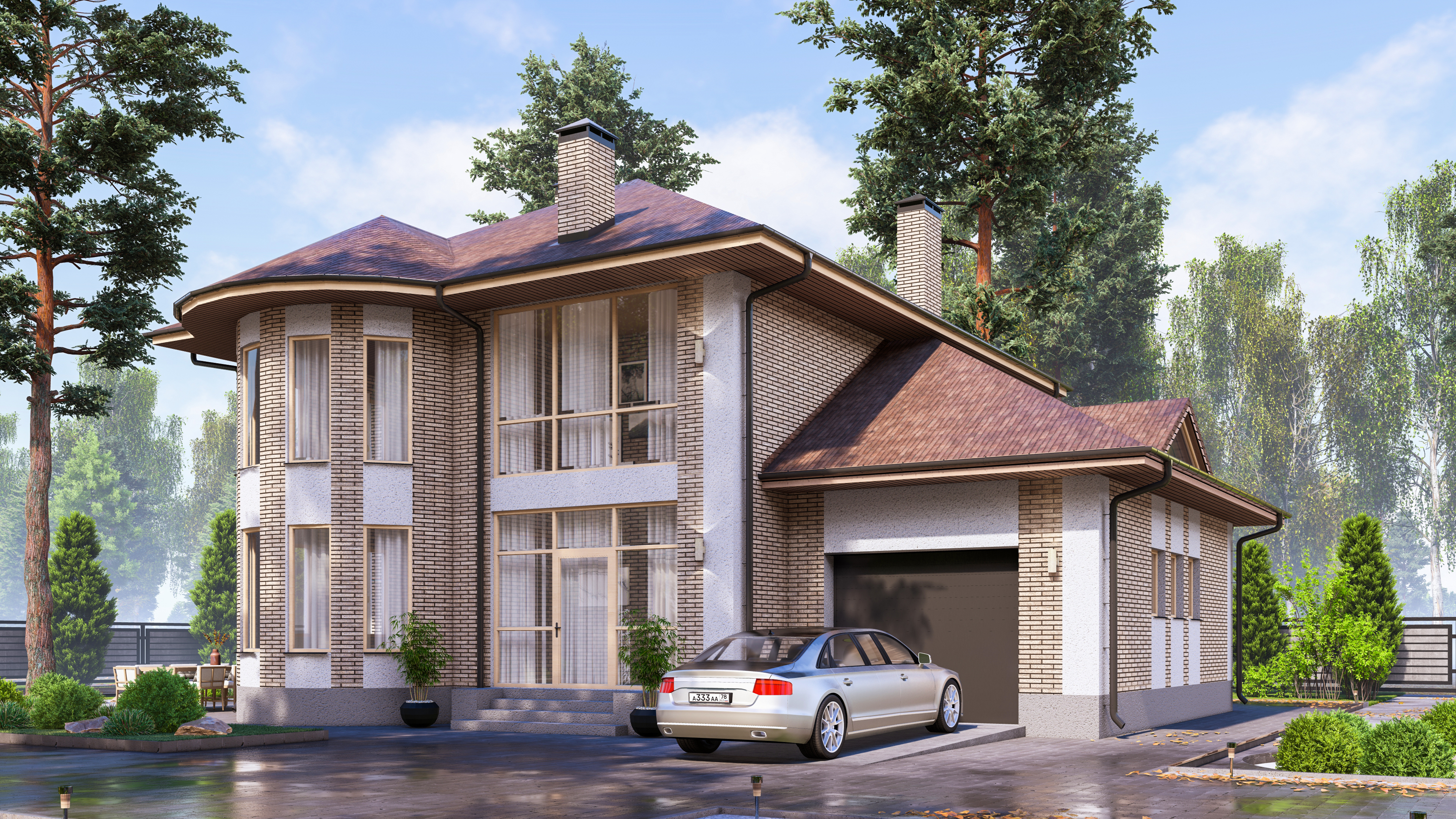 Изюминка дома — красивый эркер, интересная крыша и большая площадь остекления.