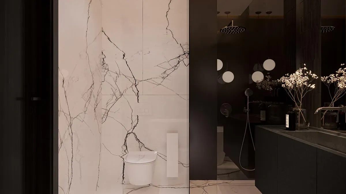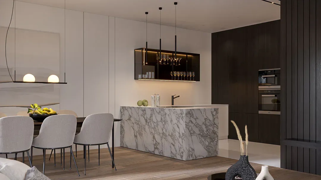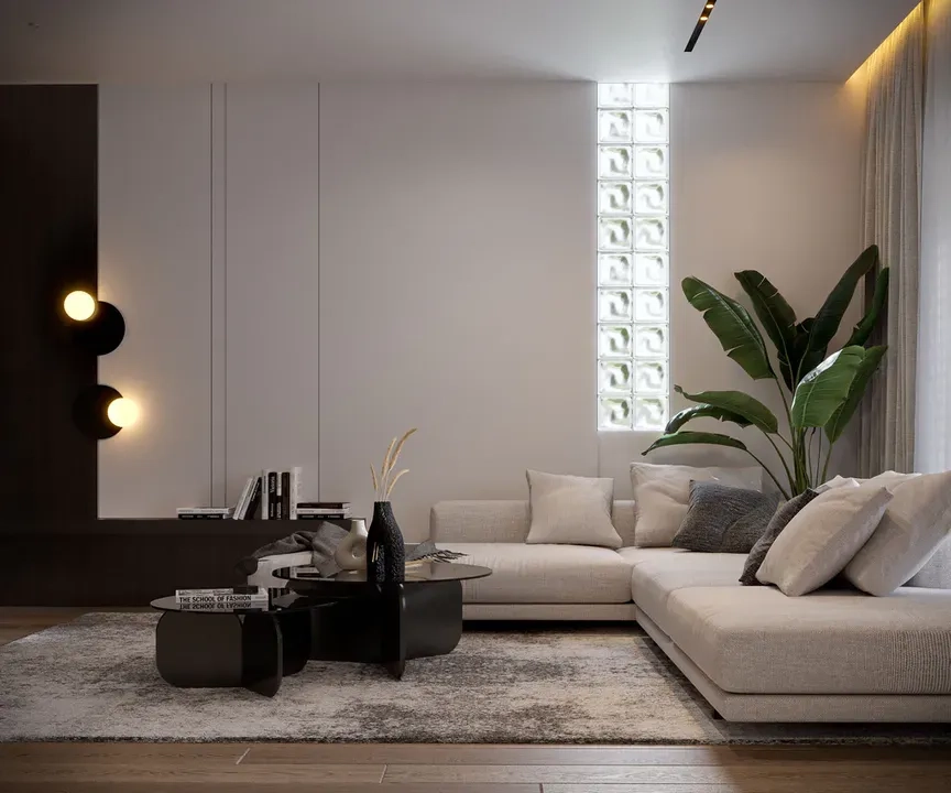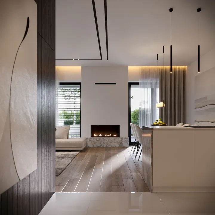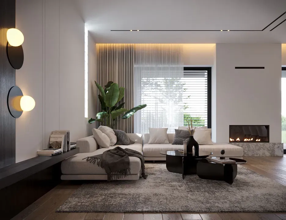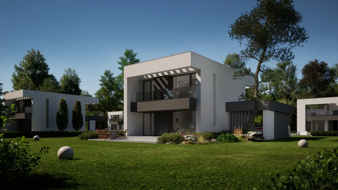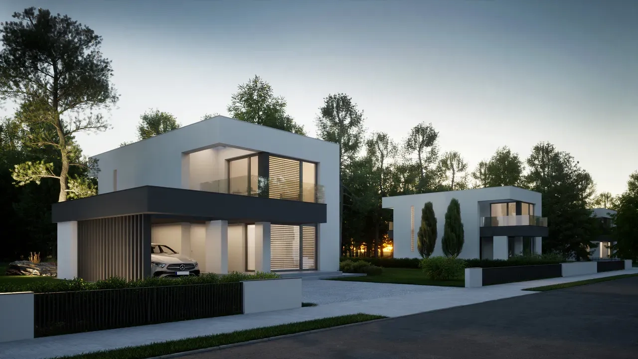 Фасад дома выполнен в белом цвете, с элементами темно-серой штукатурки в области навеса и первого этажа. Дом имеет большую площадь остекления, подчеркивая индивидуальность и утонченность дизайна.