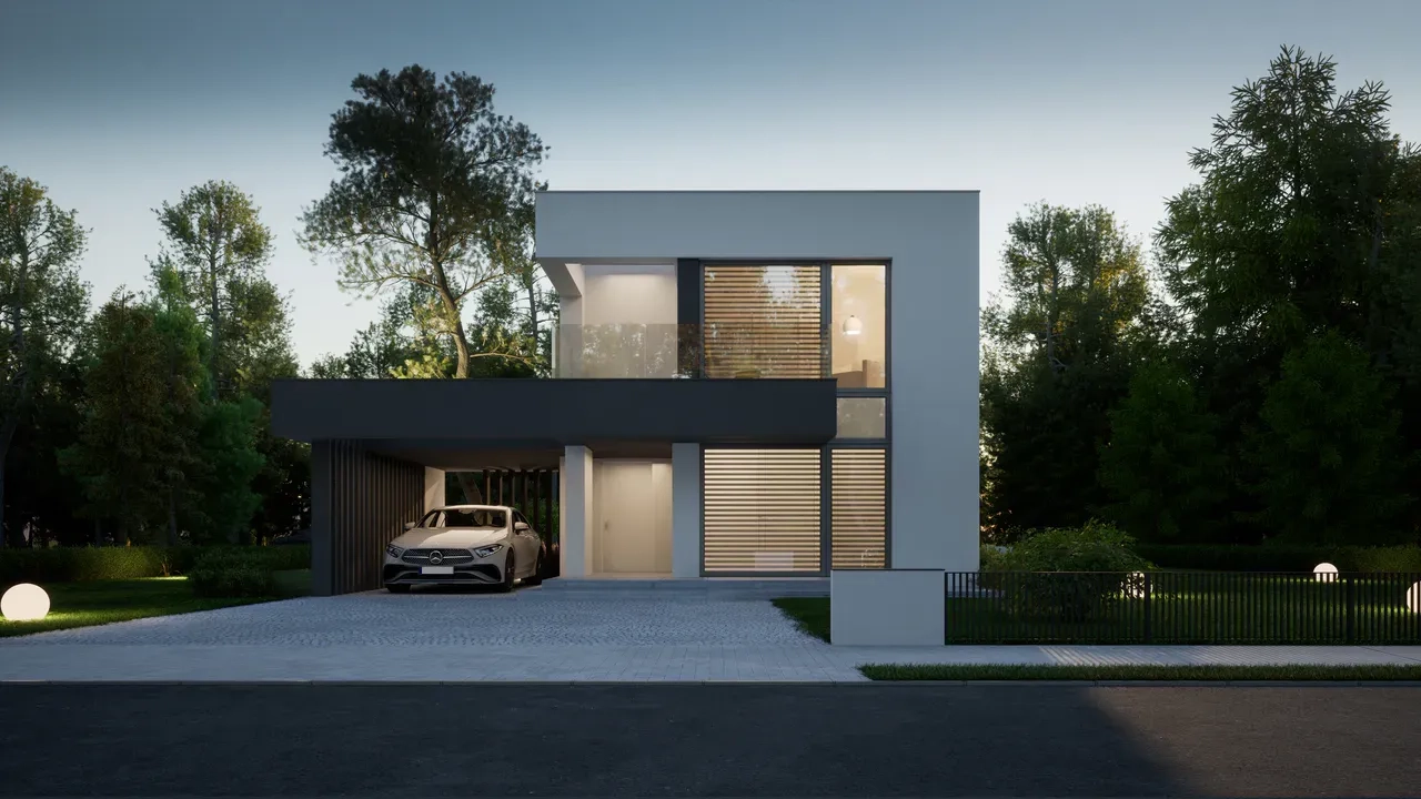 Проект двухэтажного дома с плоской крышей и навесом для машины.