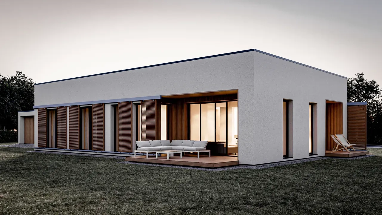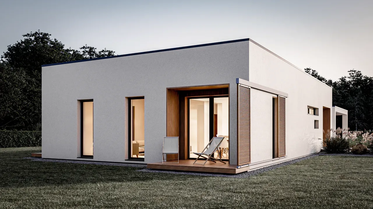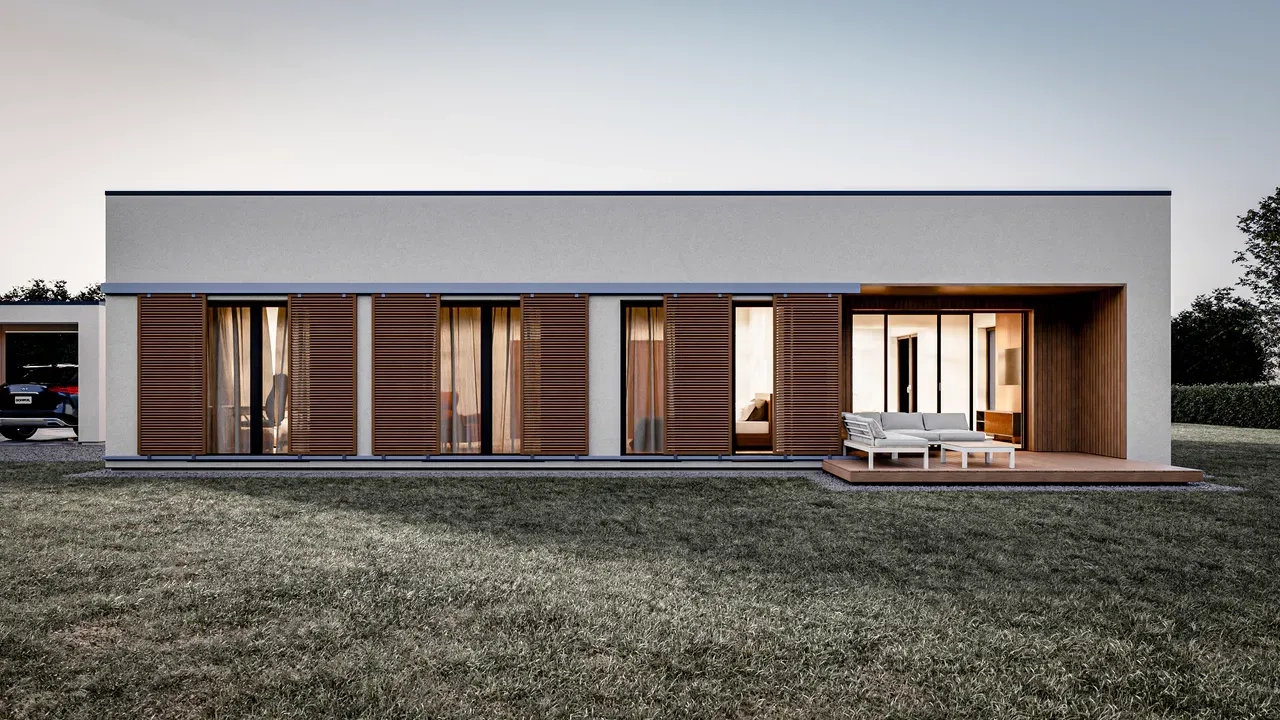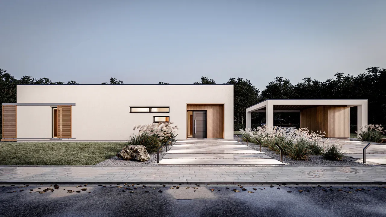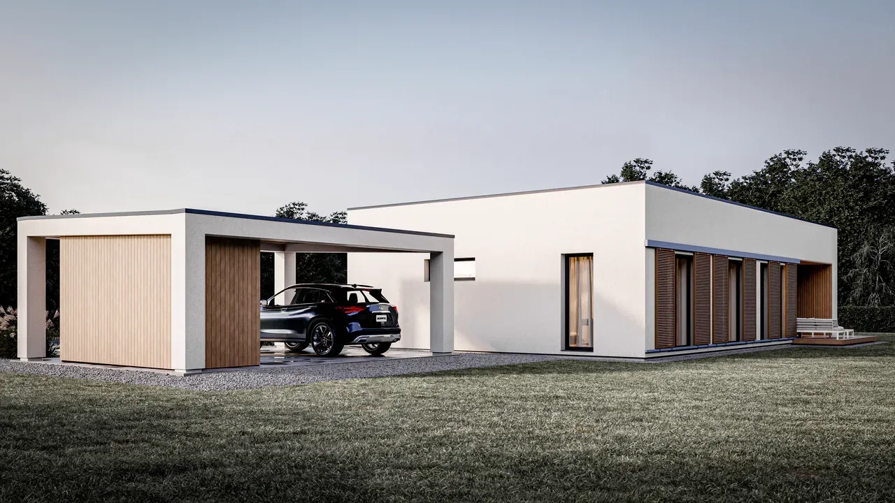 Проект одноэтажного современного дома с террасой и отдельно стоящим навесом для одной машины.