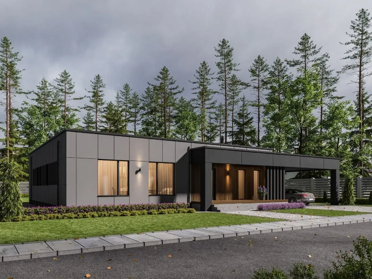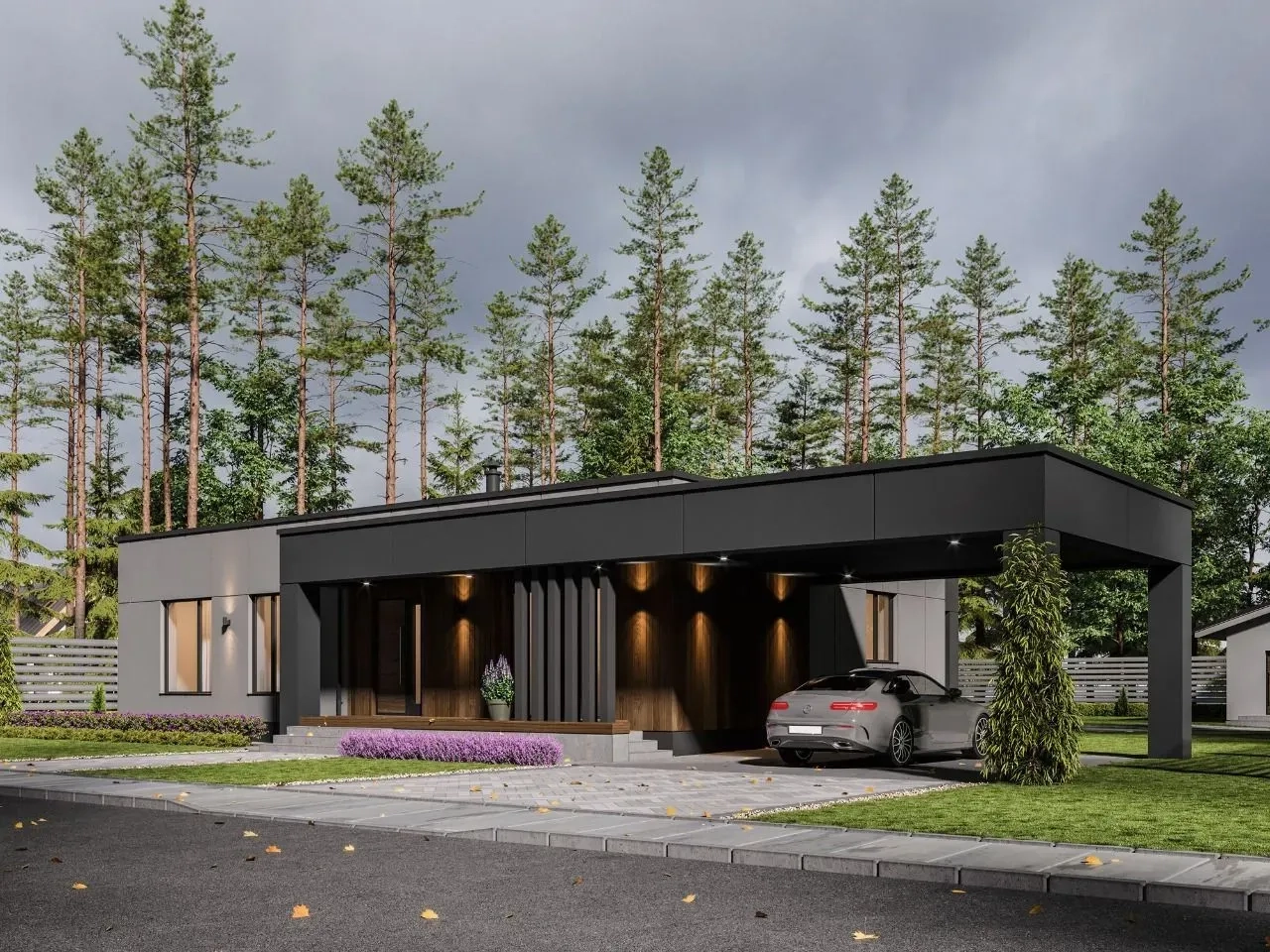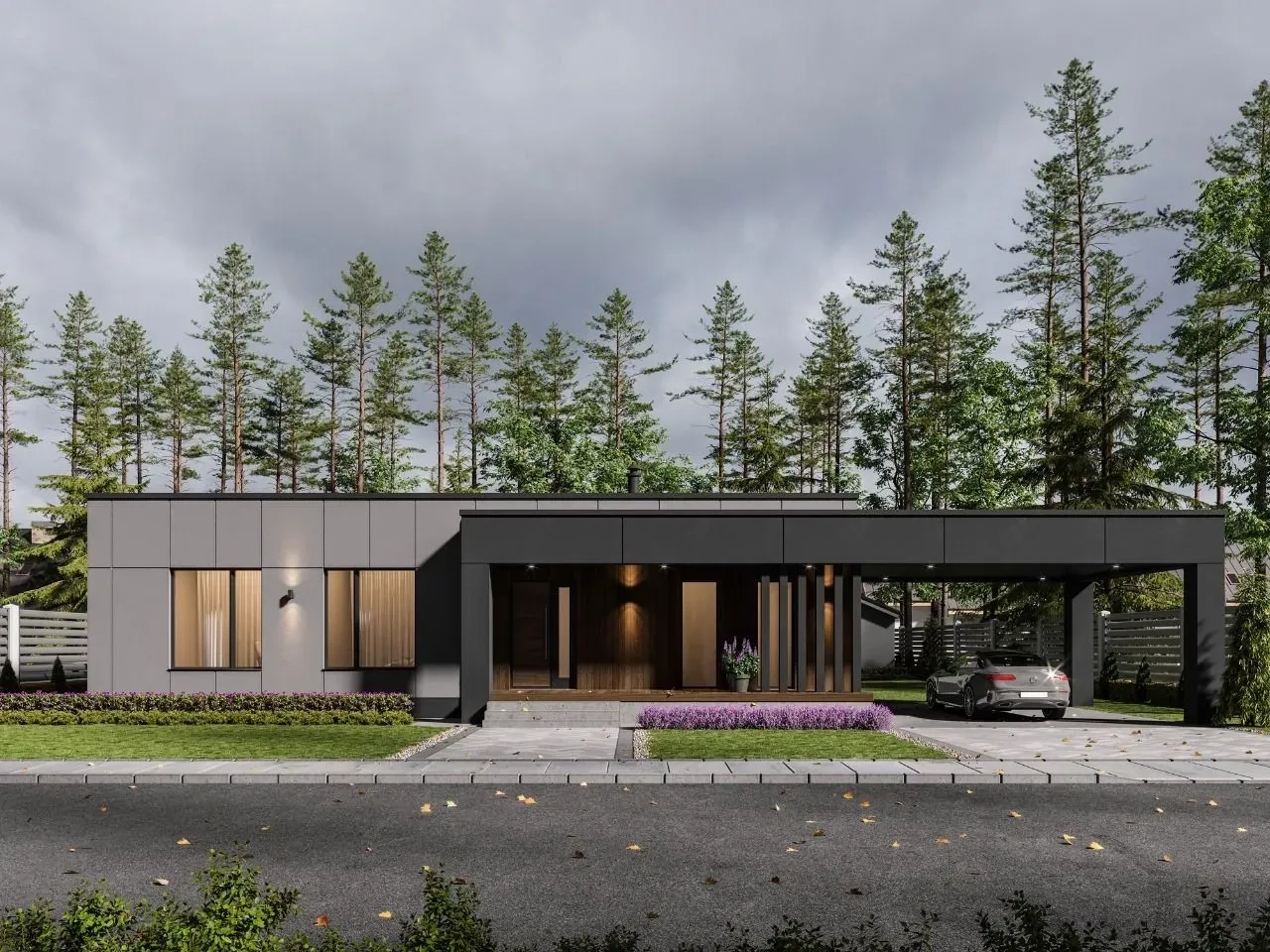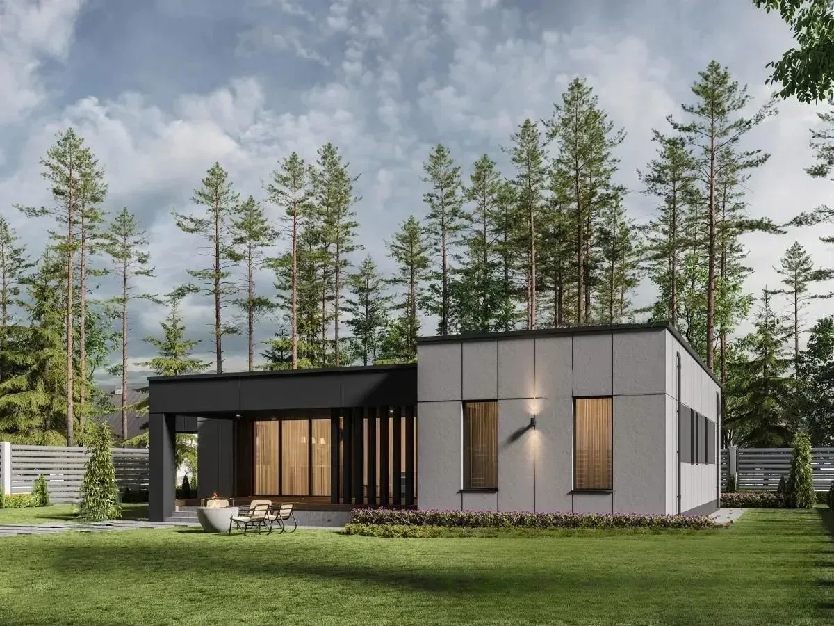 Дом имеет простую, но элегантную геометрическую форму с плоской крышей и большими окнами. Фасады выполнены из темных оттенков штукатурки, а вход в дом и терраса выделены облицовкой под дерево светлого оттенка, что создаёт теплый акцент на фасадах.
