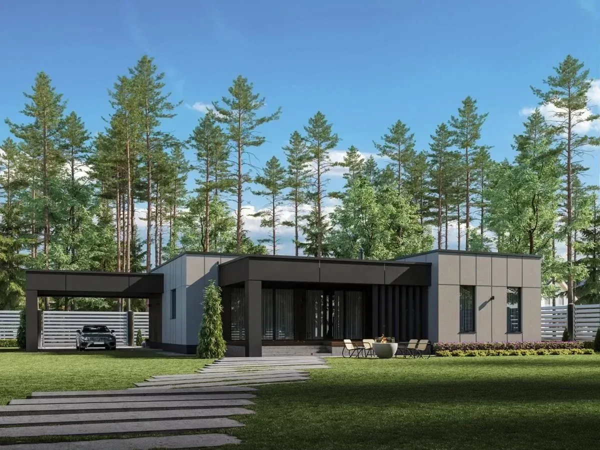 Проект одноэтажного дома с террасой и пристроенным навесом.