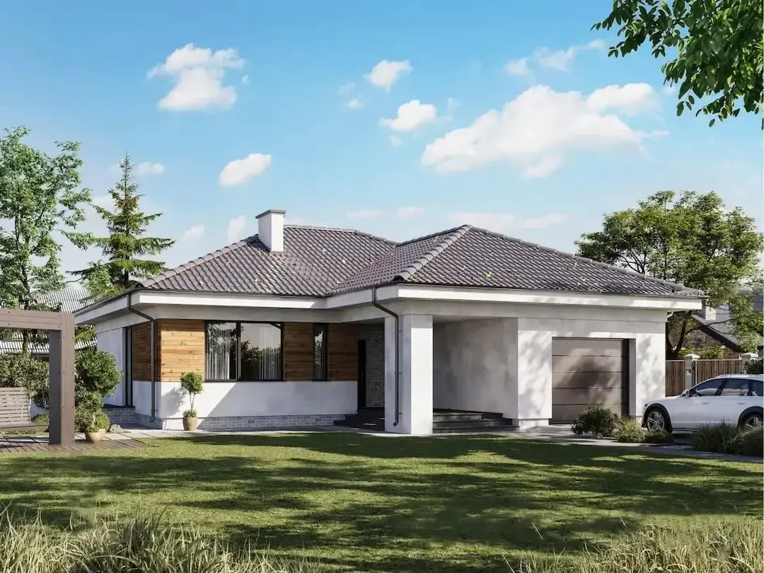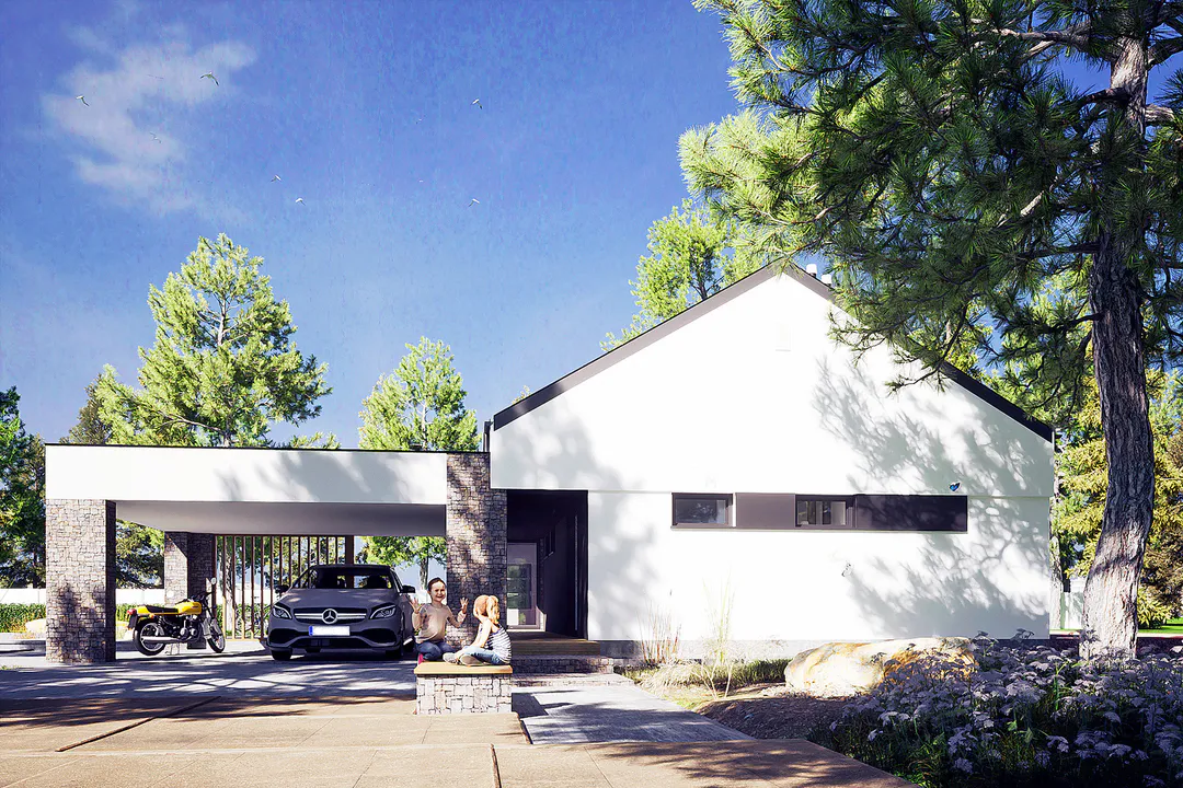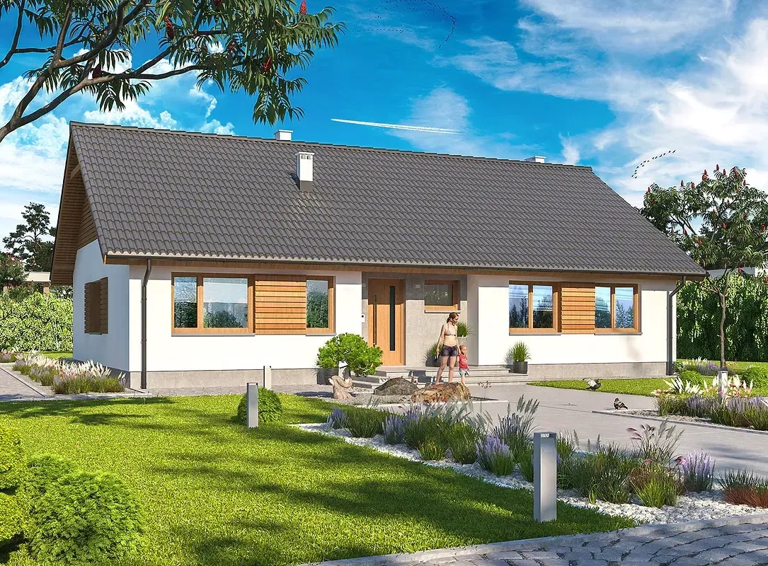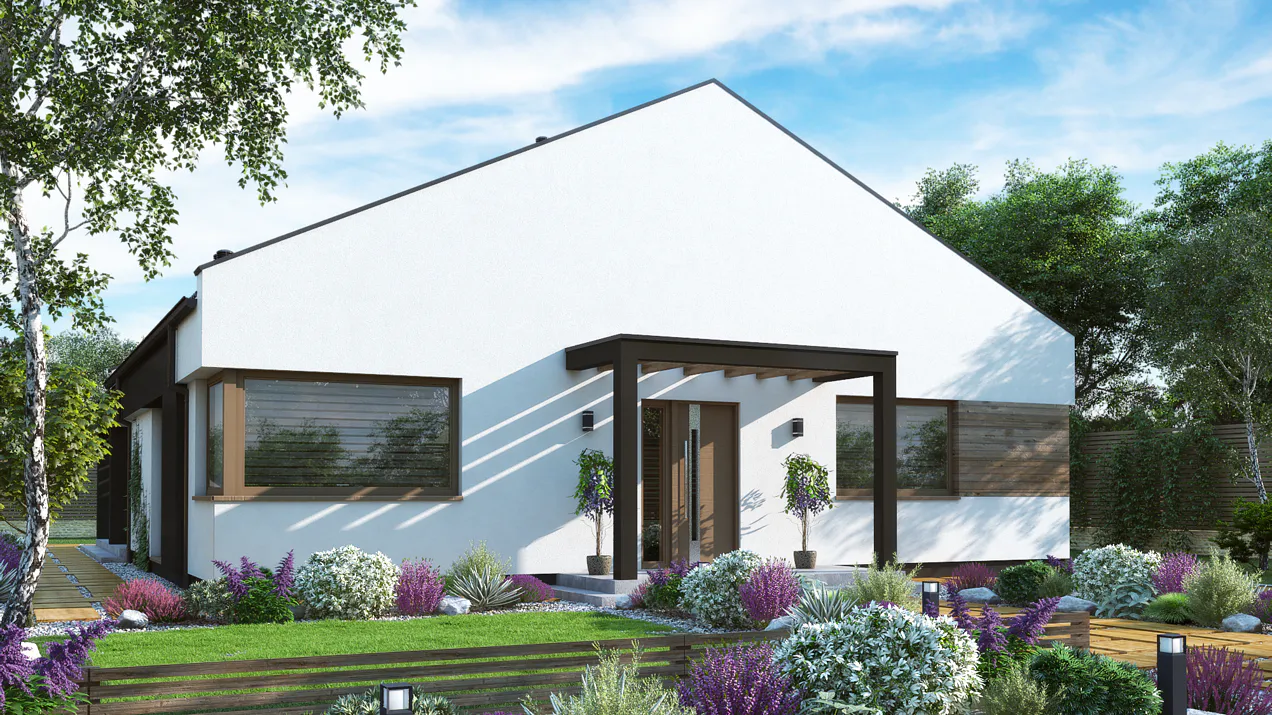 Фасады сочетают белую штукатурку и элементы декоративной деревянной облицовки. Крыша дома покрыта керамической черепицей серого цвета. Такого же цвета гаражные ворота и клинкерная плитка.