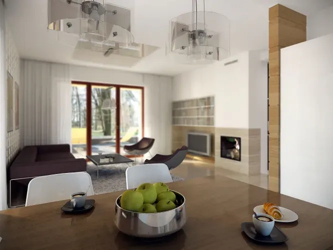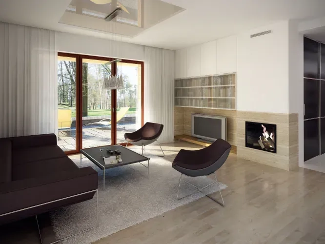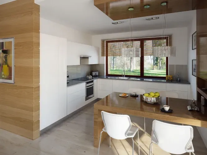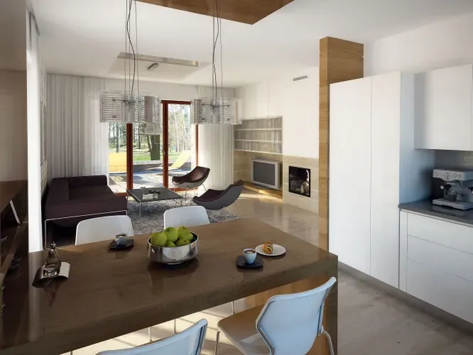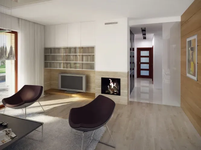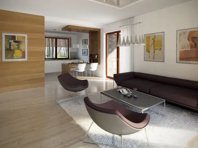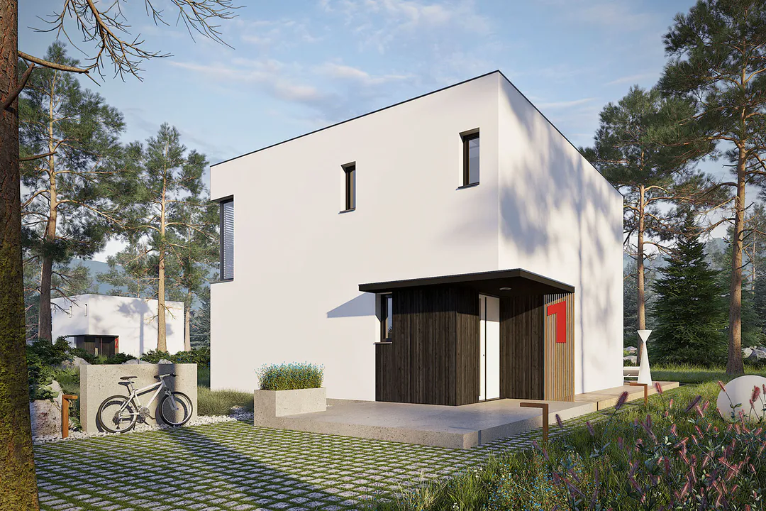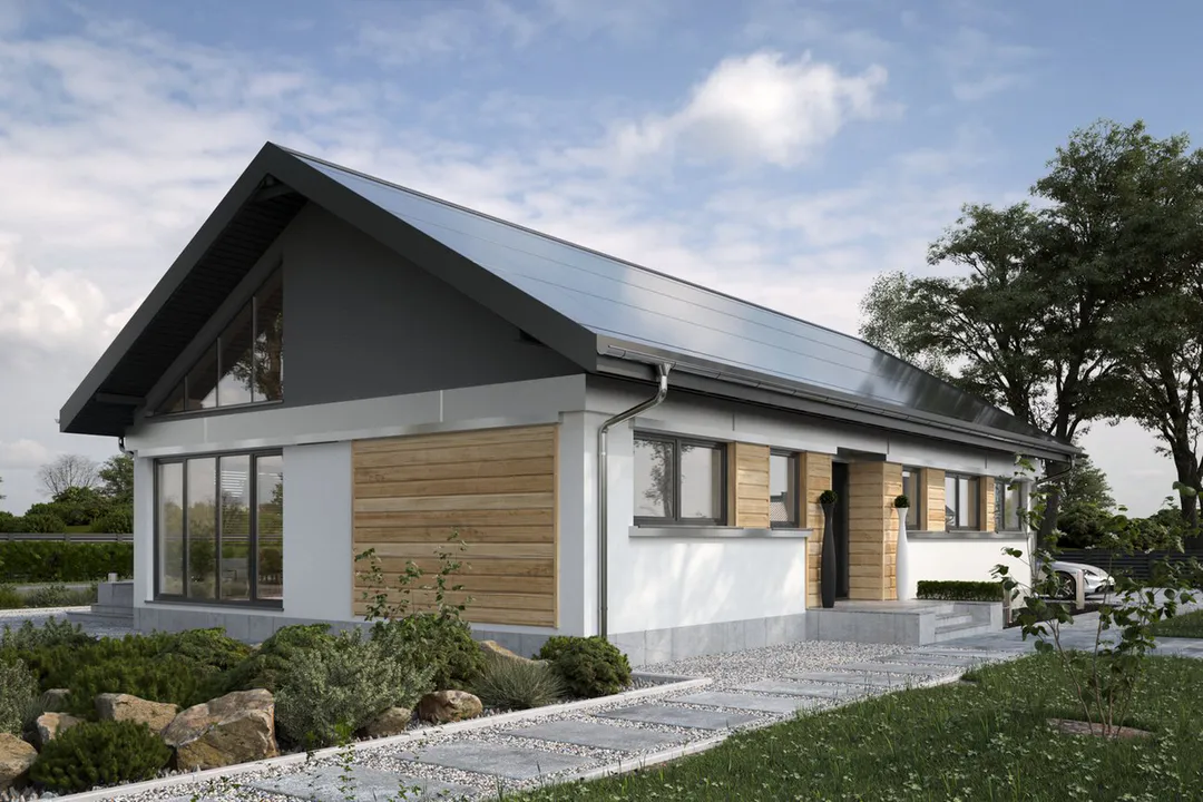 Фасады сочетают белую штукатурку и элементы декоративной деревянной облицовки. Крыша дома покрыта керамической черепицей серого цвета. Такого же цвета гаражные ворота и клинкерная плитка.