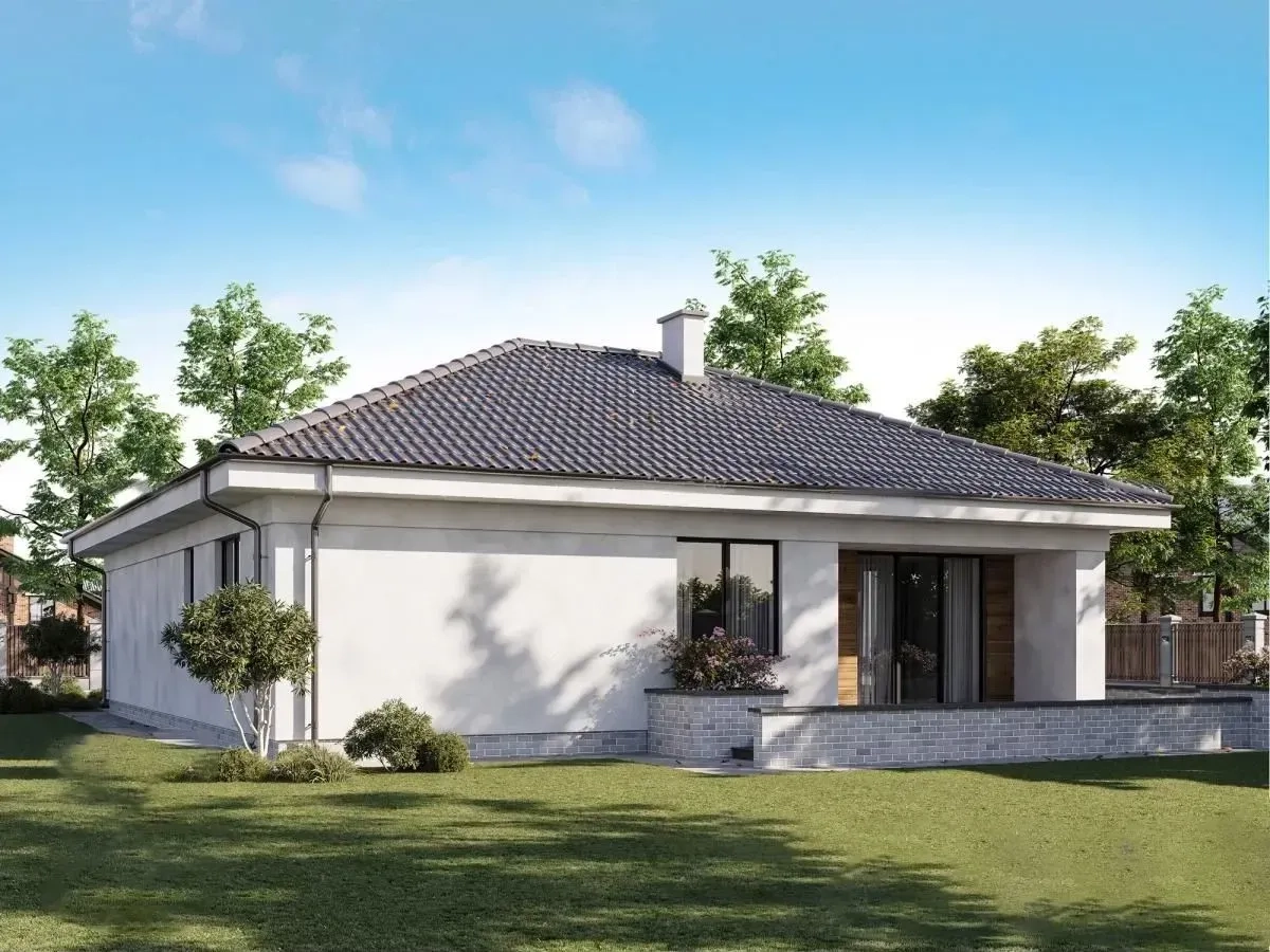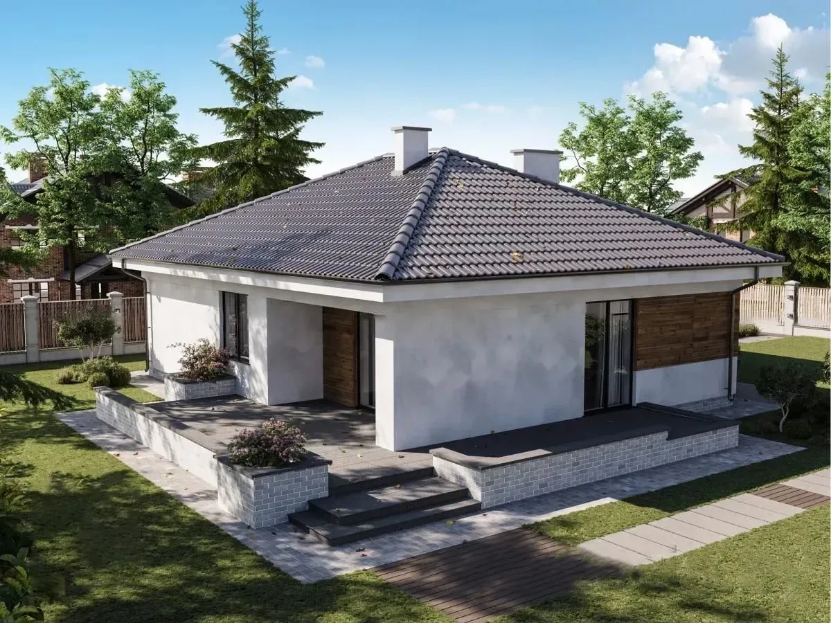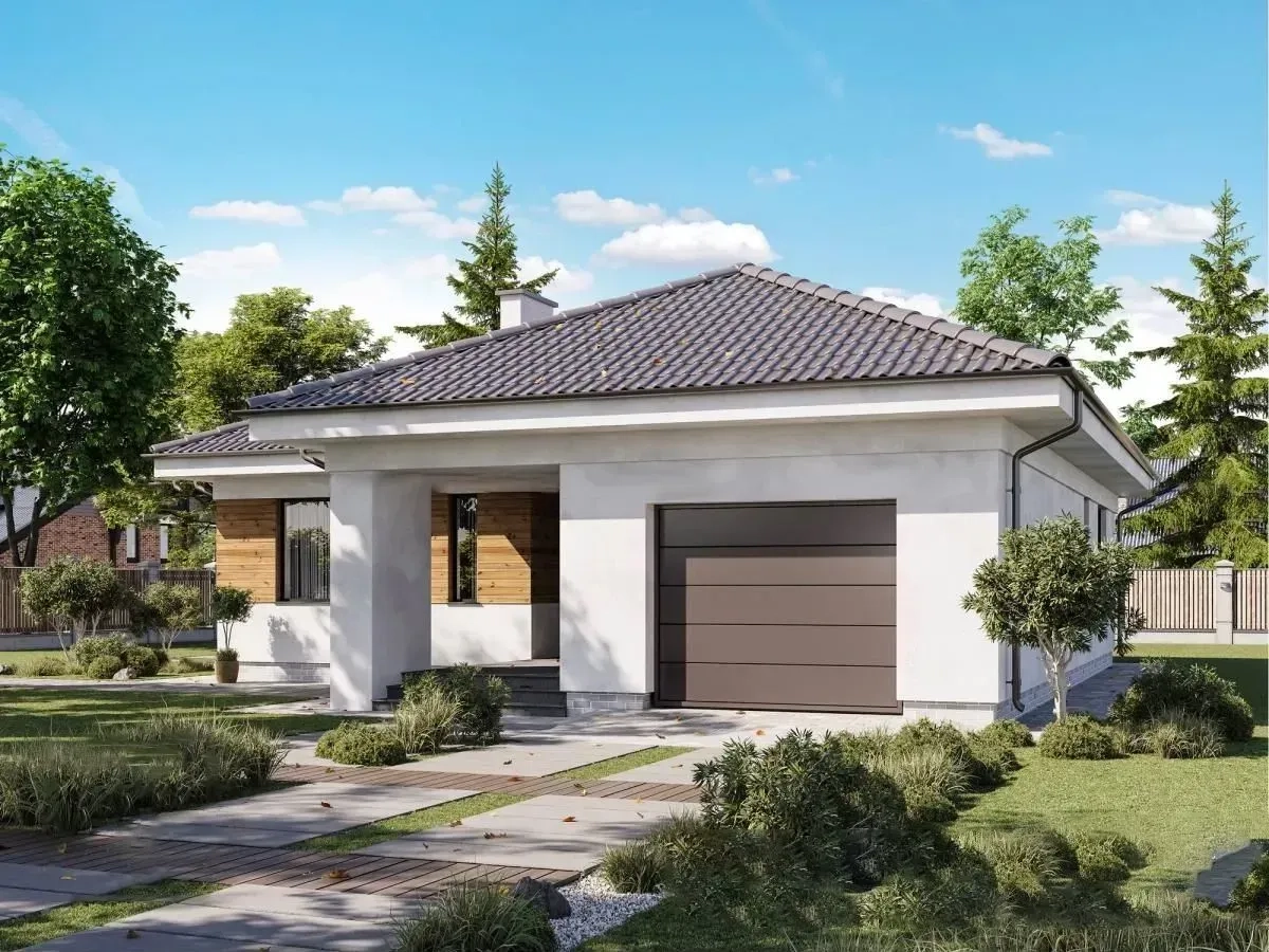 Проект одноэтажного современного дома с четырехскатной крышей и гаражом.