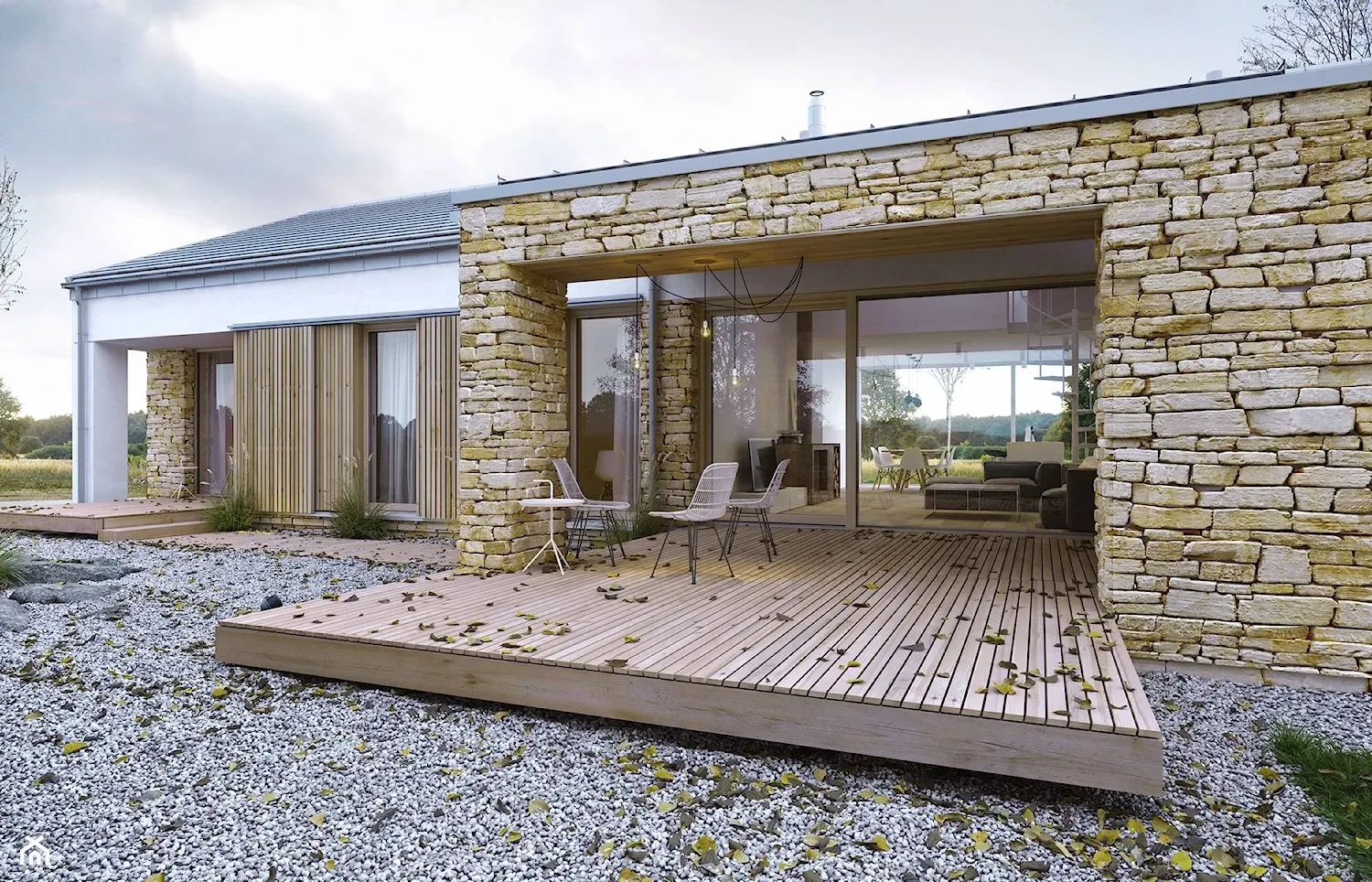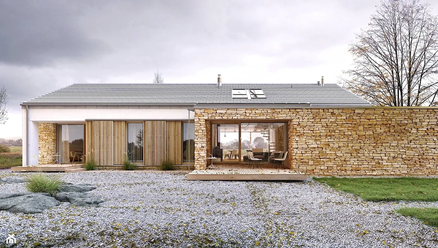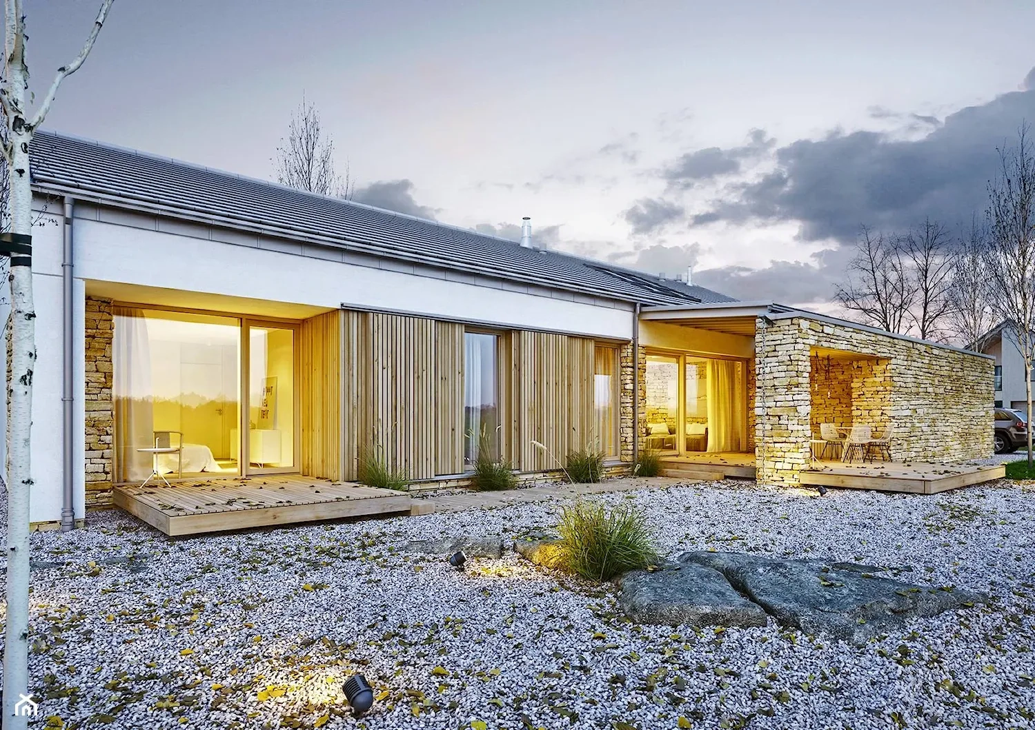 Отделочные материалы, использованные в дизайне этого дома, добавляют природный шарм и теплоту к общему интерьеру. Белая штукатурка придает стенам гладкую текстуру и создает чистый и современный вид. Камень и дерево добавляют натуральность и уют в дизайне дома, придавая ему ощущение тепла и комфорта.