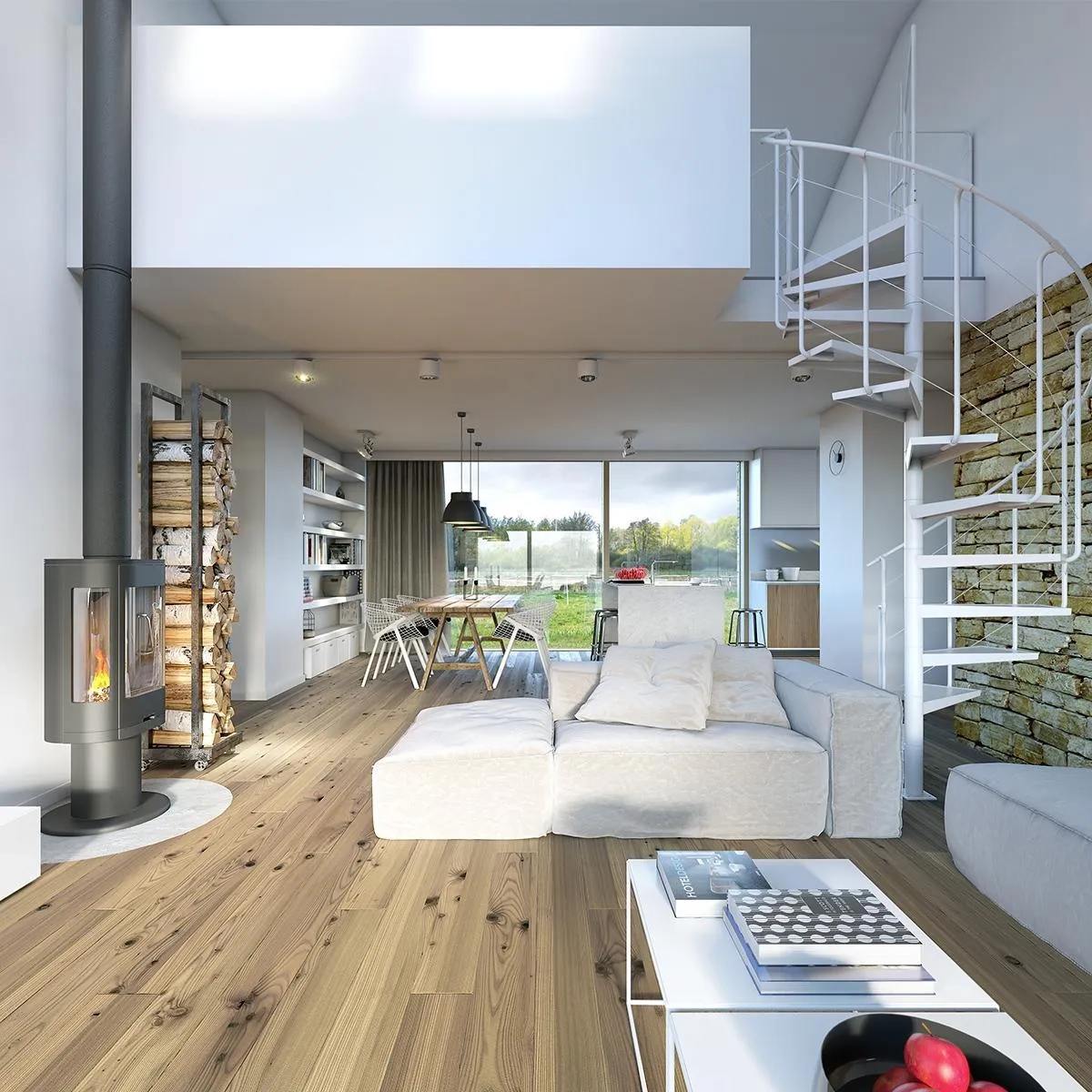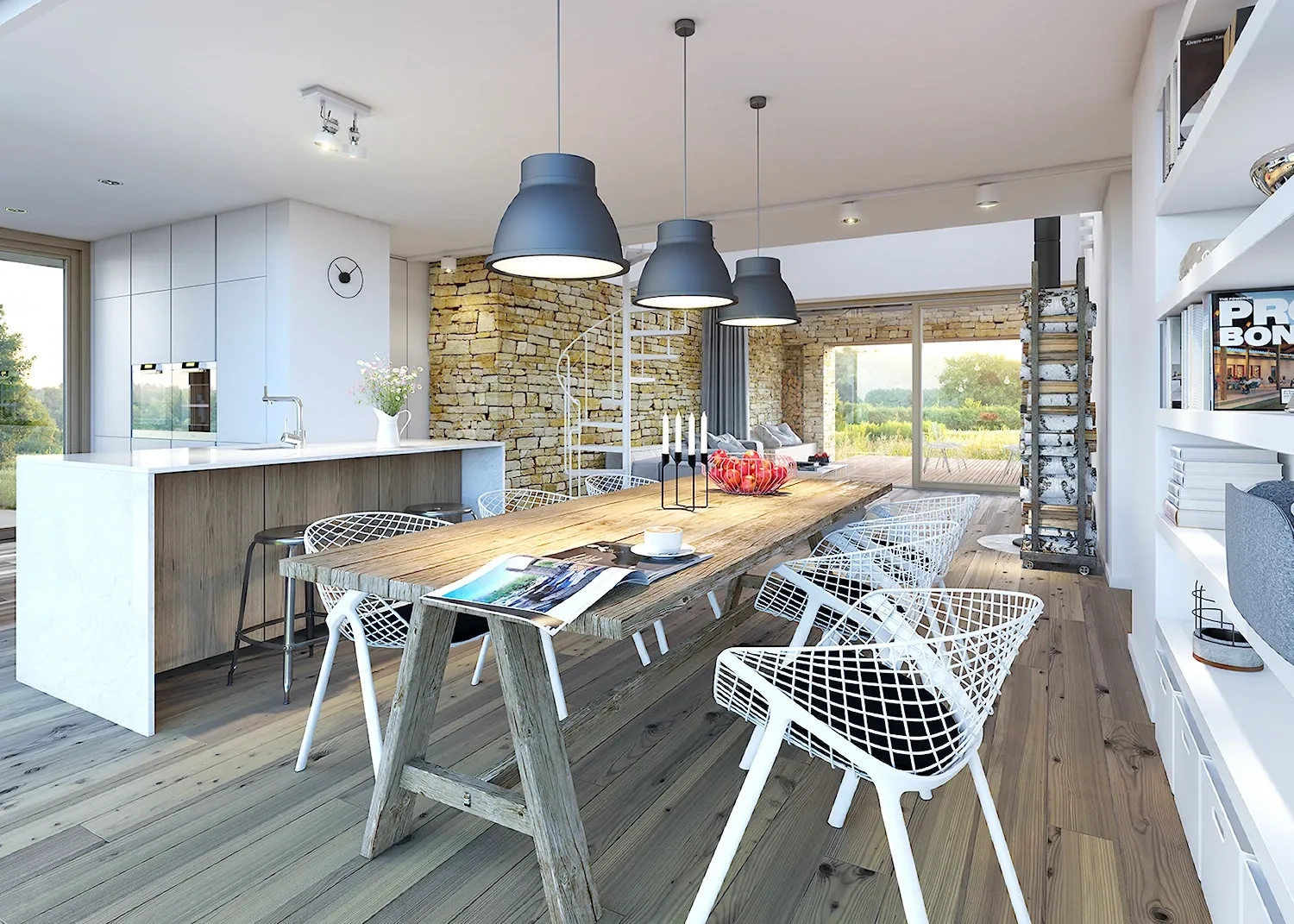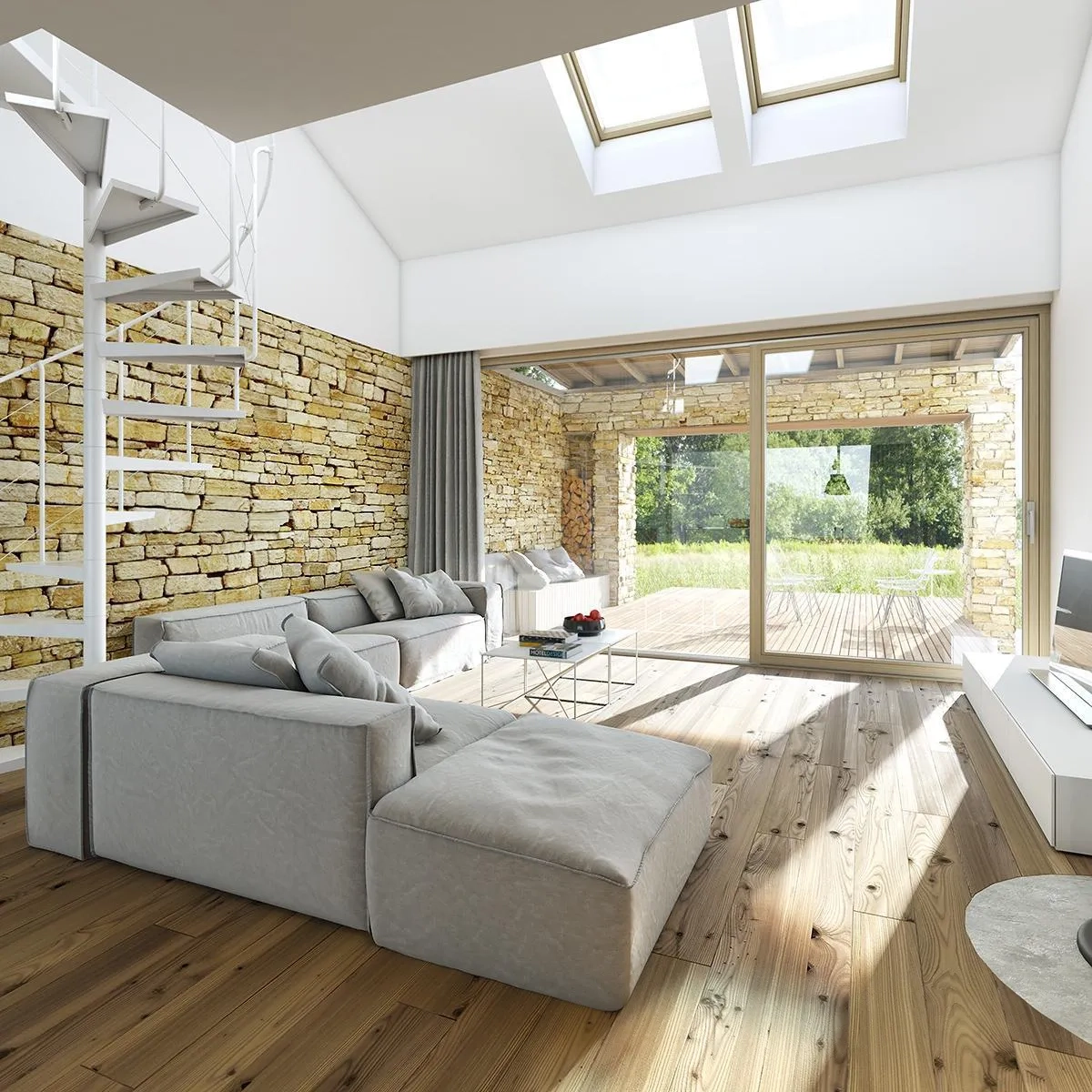 Отделочные материалы, использованные в дизайне этого дома, добавляют природный шарм и теплоту к общему интерьеру. Белая штукатурка придает стенам гладкую текстуру и создает чистый и современный вид. Камень и дерево добавляют натуральность и уют в дизайне дома, придавая ему ощущение тепла и комфорта.
