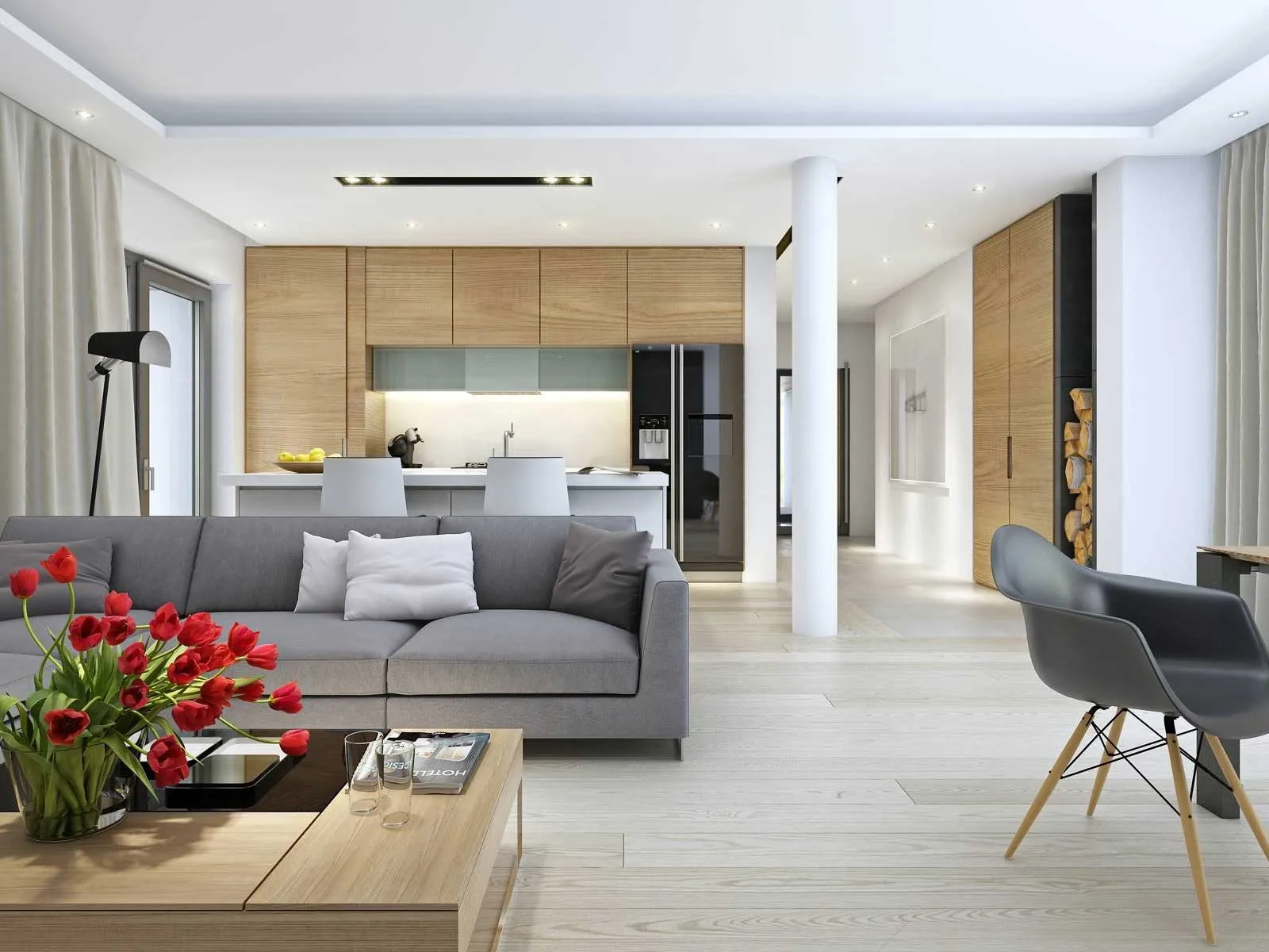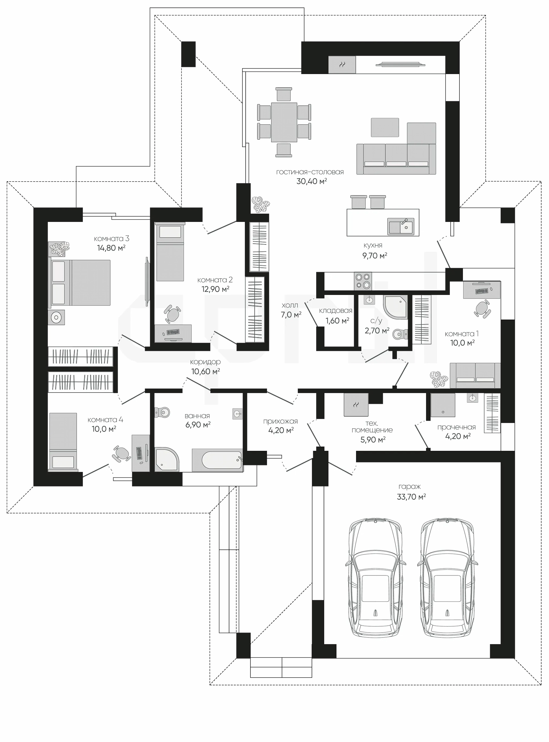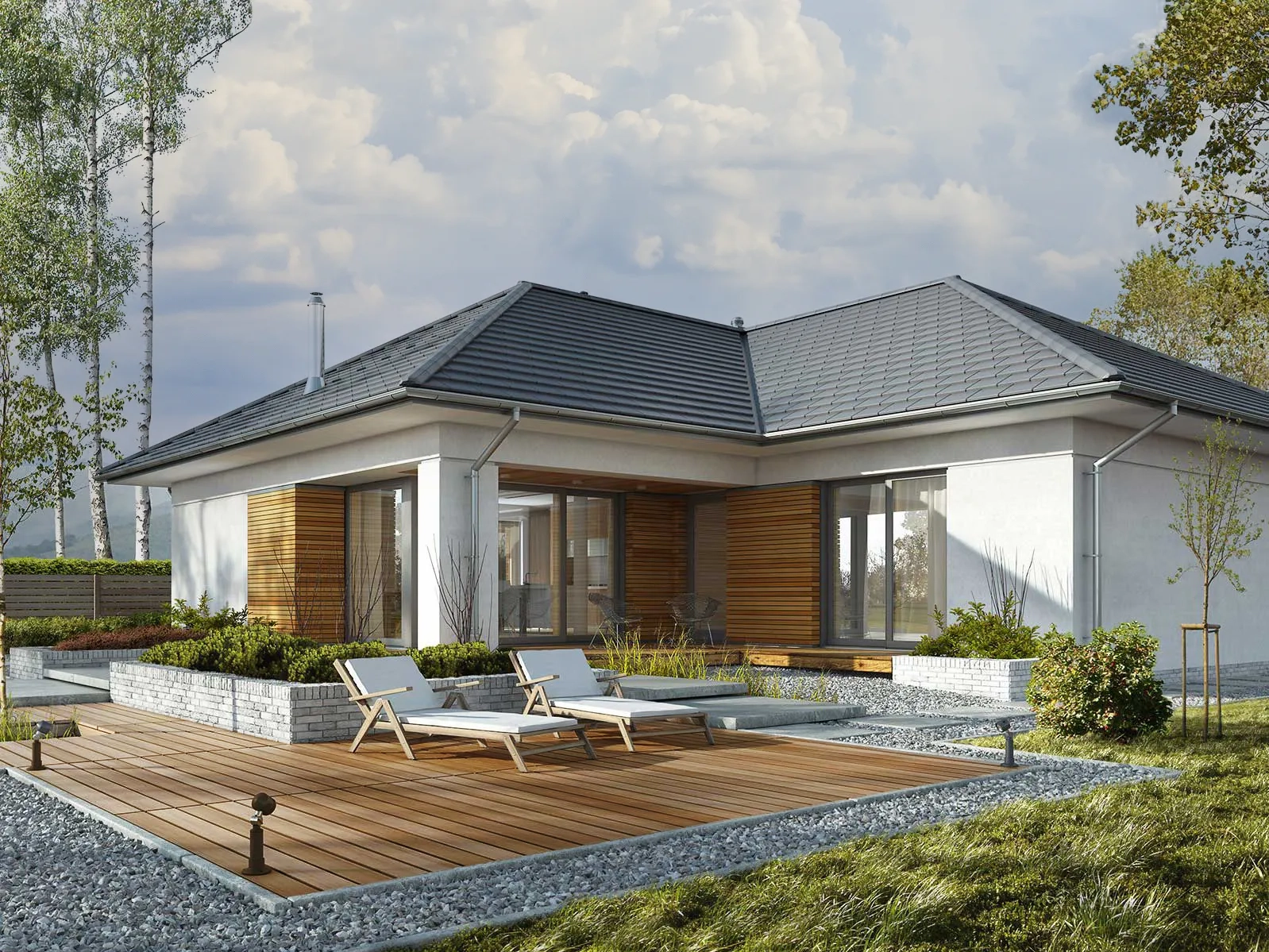 У дома четырехскатная крыша с серой черепичной кровлей. Фасад сочетает в себе штукатурку белого и серого цвета, а также элементы деревянной облицовки теплого оттенка. Вход в дом и террасу покрывает крыша, что защищает от непогоды. Гараж имеет вместительность на два автомобиля и примыкает прямо к дому.