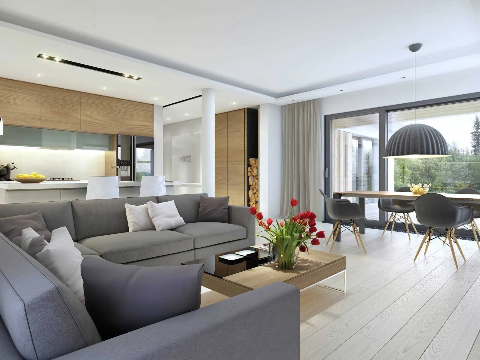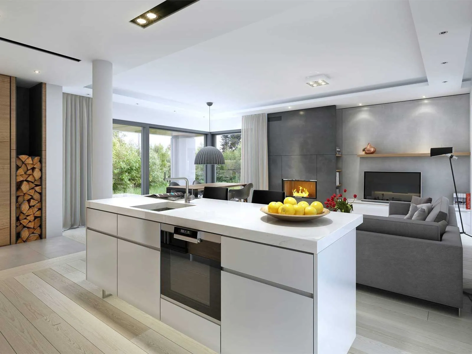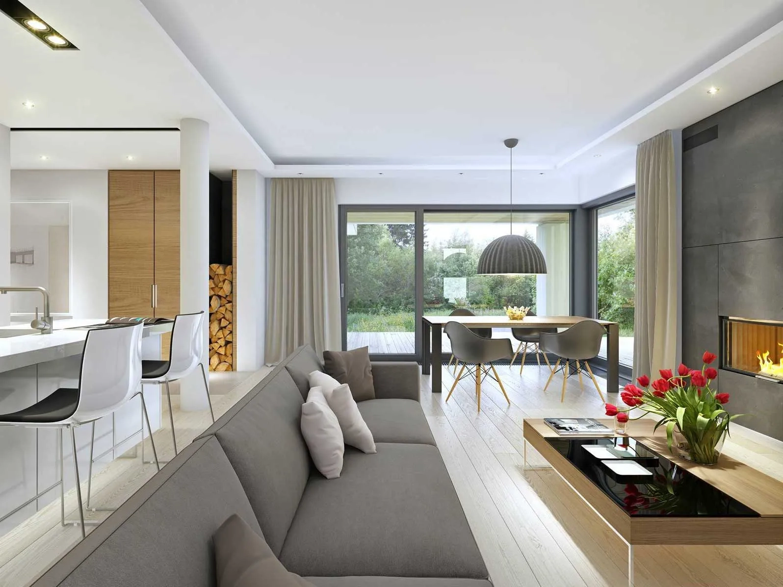 Внешняя отделка дома выполнена из высококачественных материалов, сочетающих в себе долговечность и красоту. Однако изюминкой проекта являются панорамные окна, которые наполняют дом светом и создают ощущение единения с природой и визуально расширяют пространство.