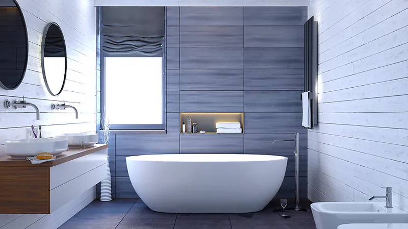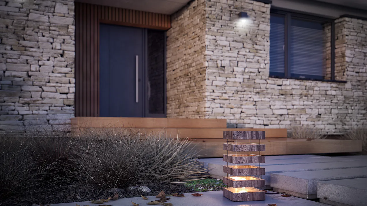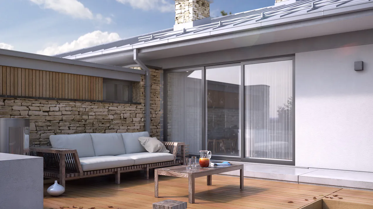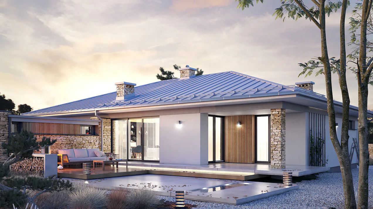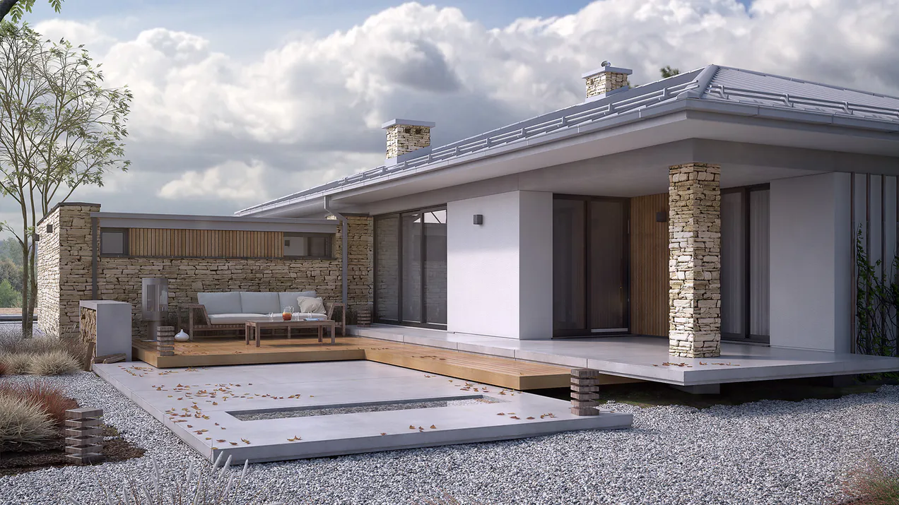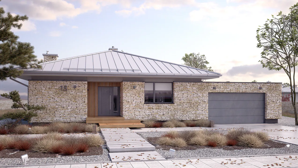 Простая, но оригинально оформленная форма дома и архитектурные детали в сочетании с фактурой камня создают элегантную отсылку к модернистской архитектуре середины двадцатого века. Главный вход в дом располагается по центру фасада под крышей, что защищает от дождя и ветра. С правой стороны от входа есть гараж с плоской крышей, за гаражом на заднем дворе находится большая частично крытая терраса, где можно проводить время на свежем воздухе с семьей и близкими.