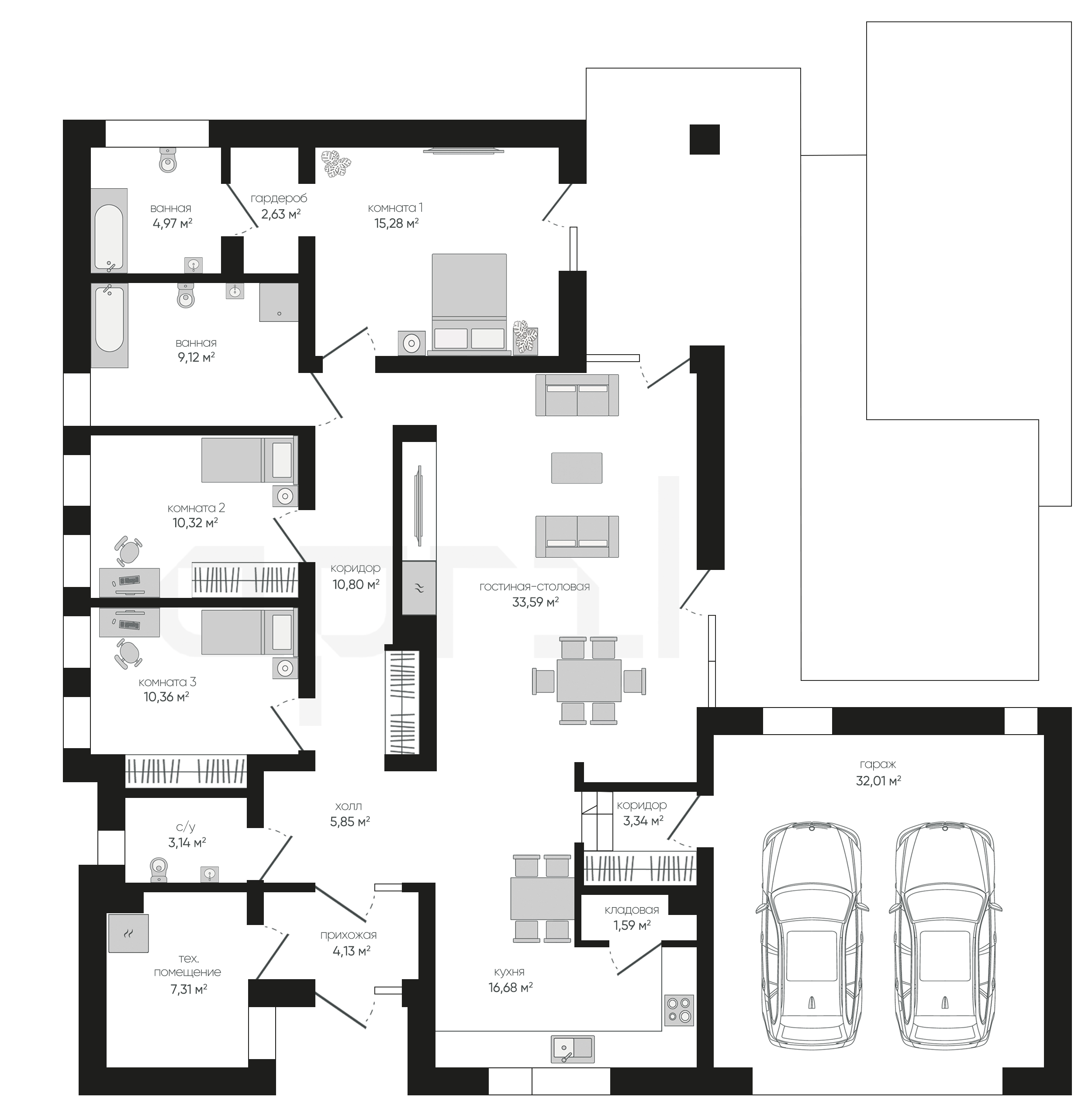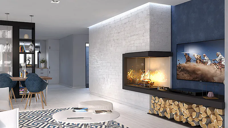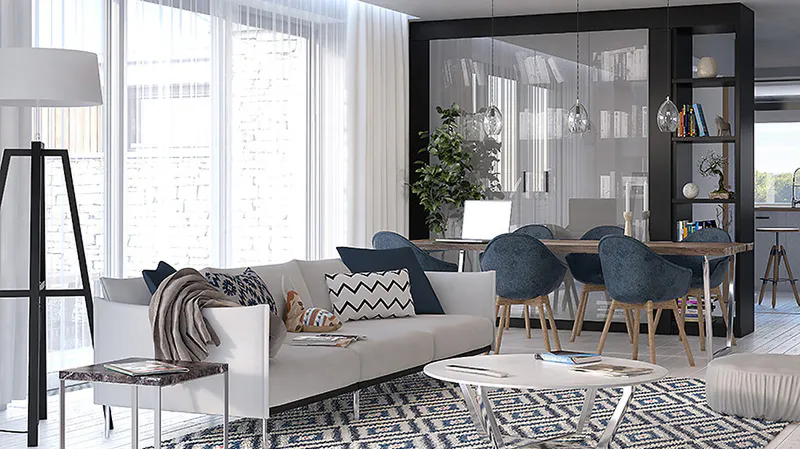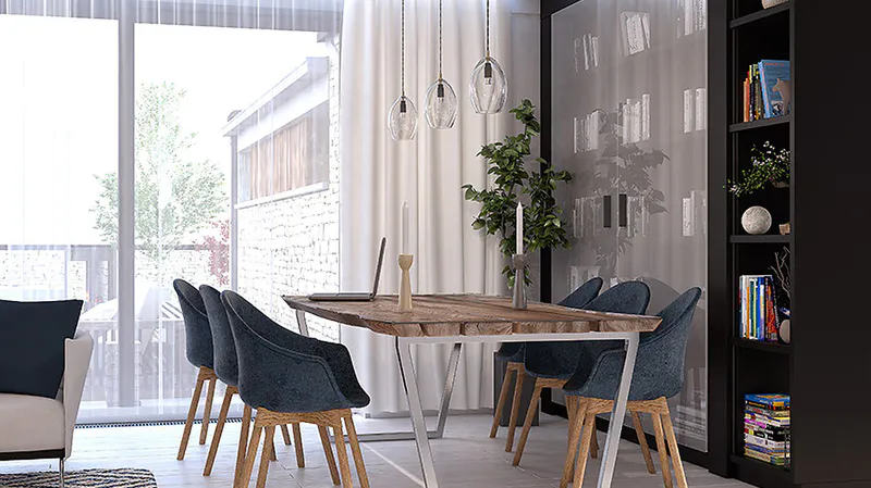Внутри дома открытая планировка с четким разделением на функциональные зоны.