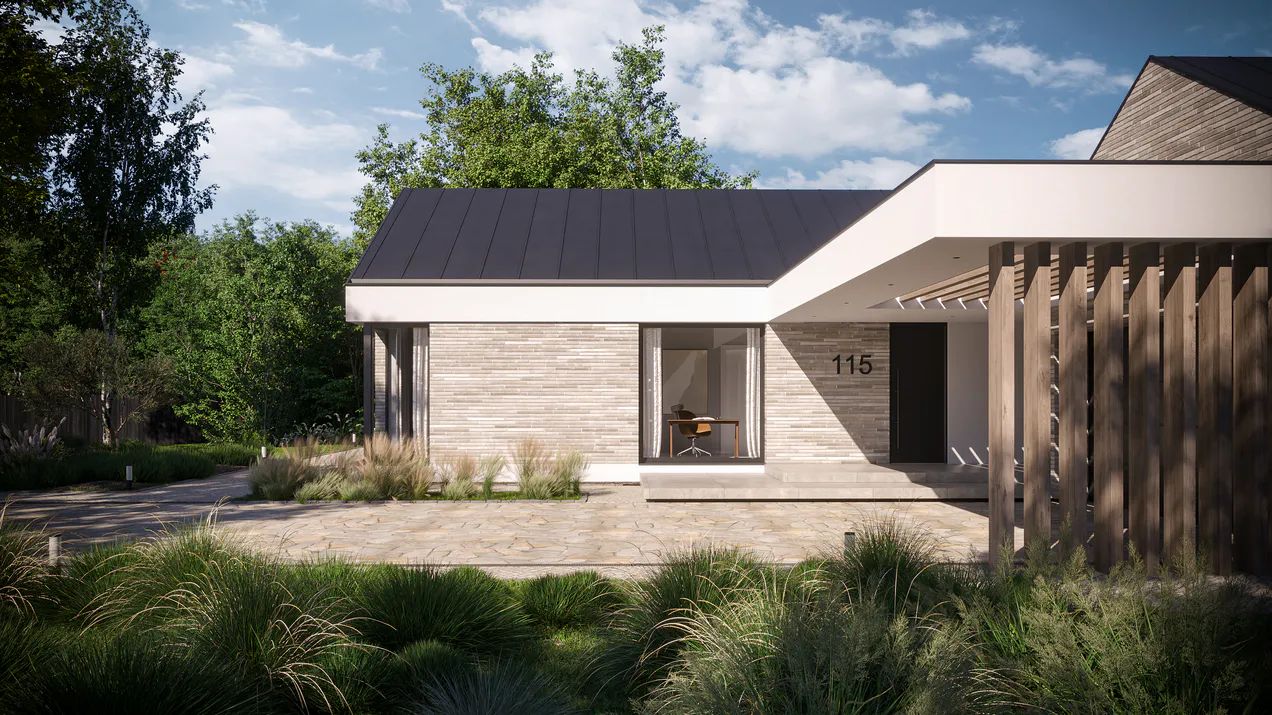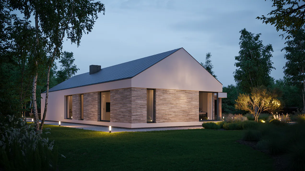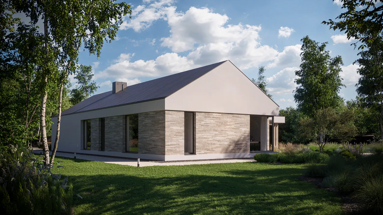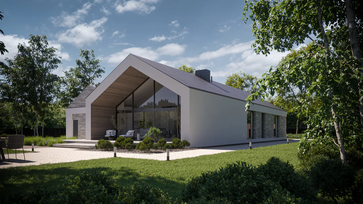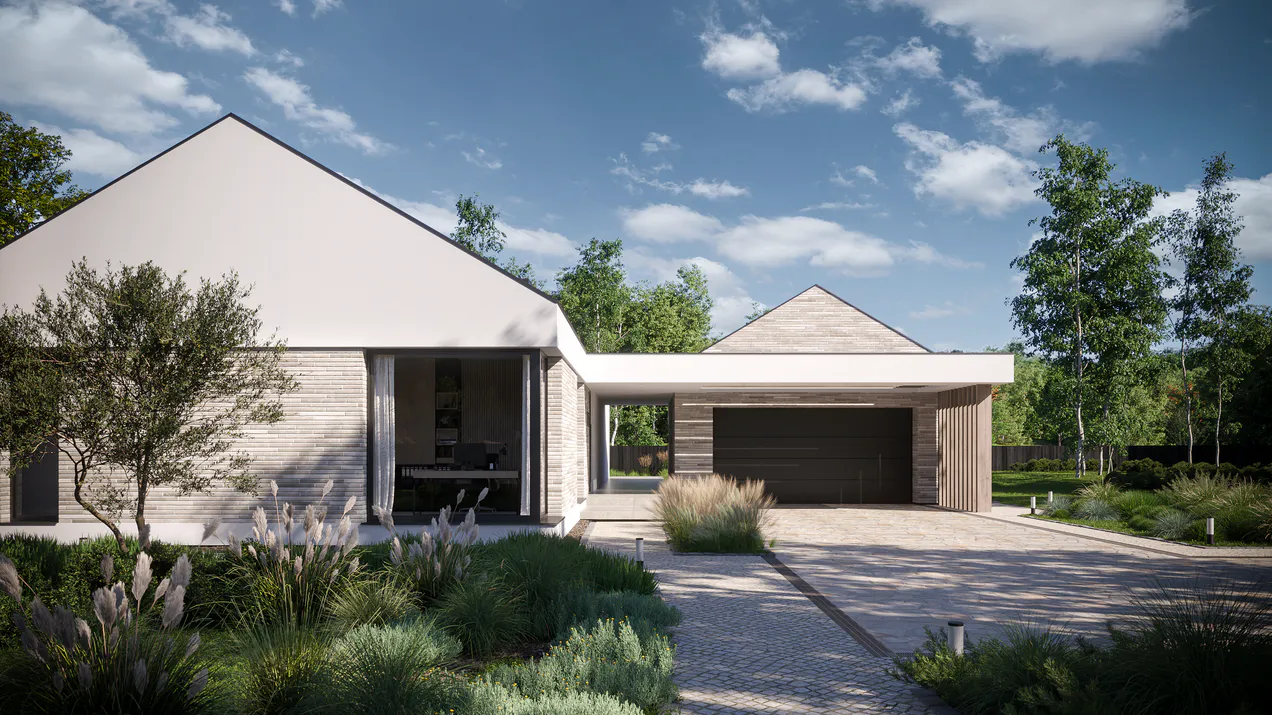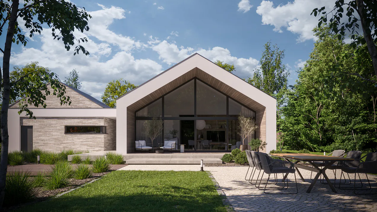 Белая штукатурка красиво контрастирует с серым цветом клинкерной плитки, создавая яркий и выразительный фасад. Добавление элементов фасадного дерева придает дому естественность и ощущение уюта. Графитовая крыша из листового металла и оконная фурнитура подчеркивают современность архитектуры.