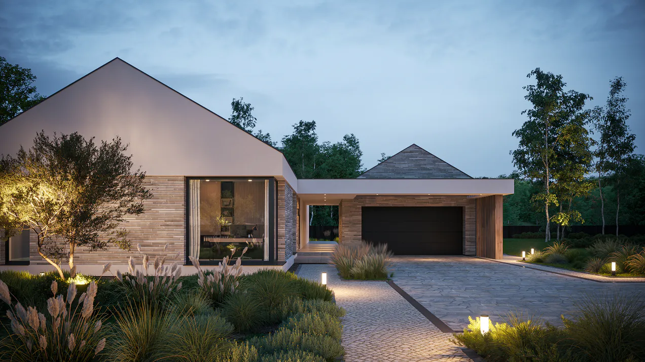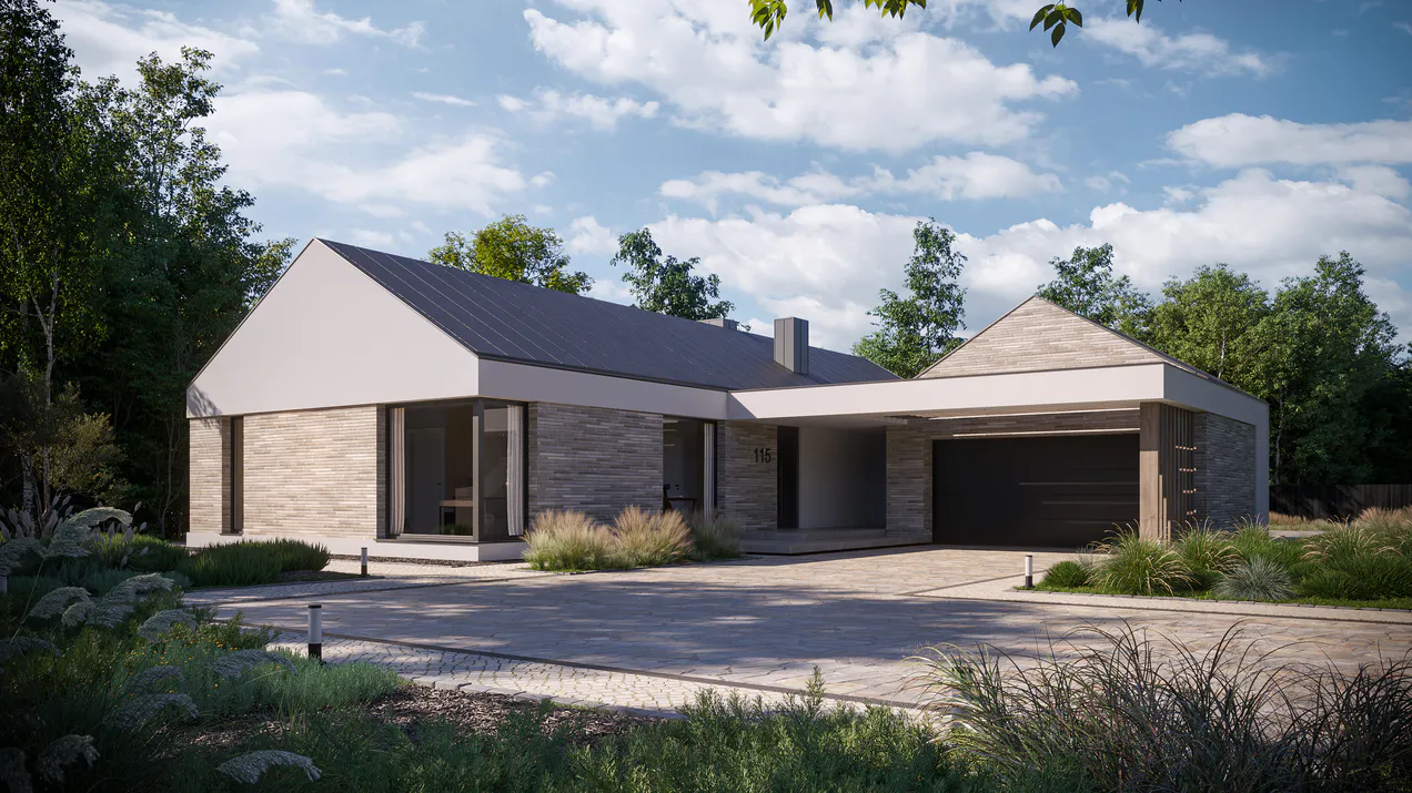 Проект одноэтажного дома в современном стиле предлагает функциональное планирование пространства, большую террасу и гараж на две машины.