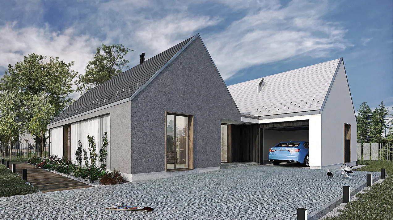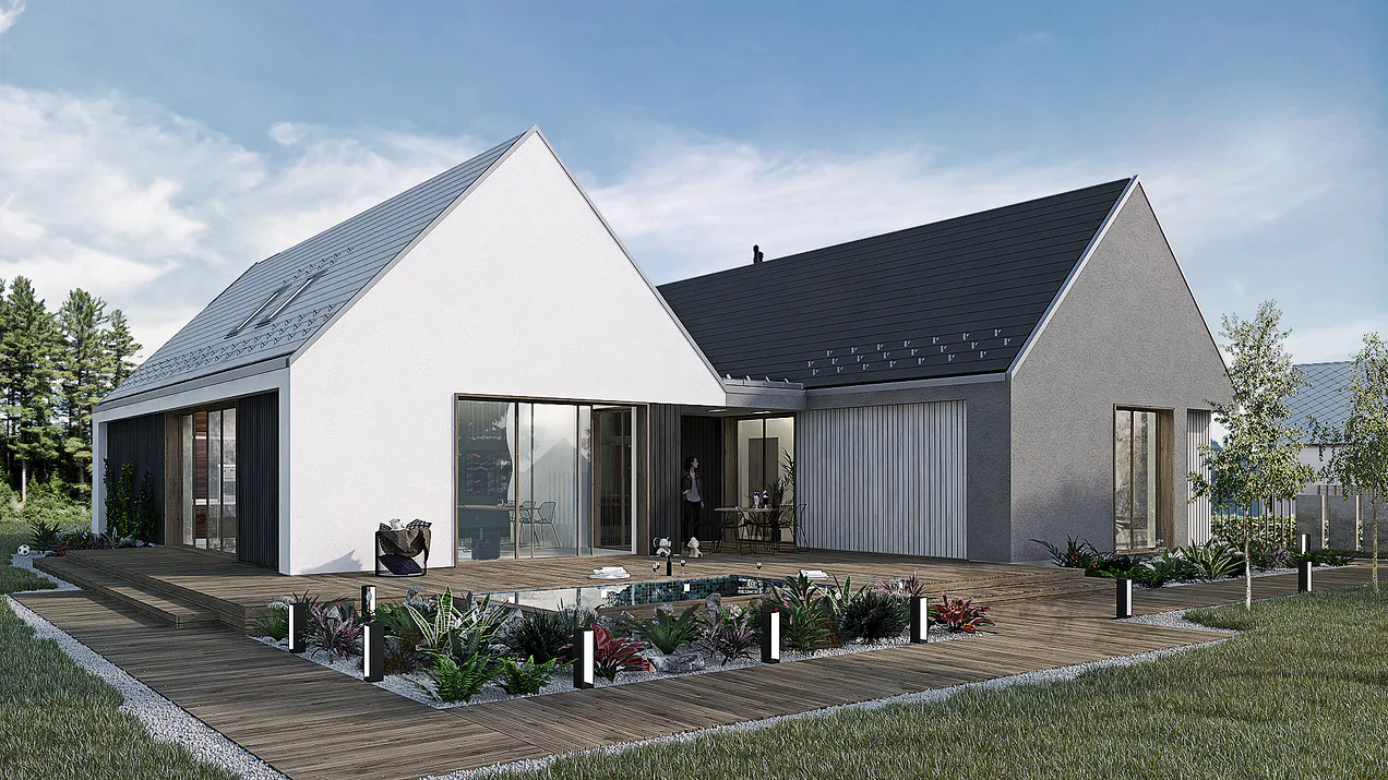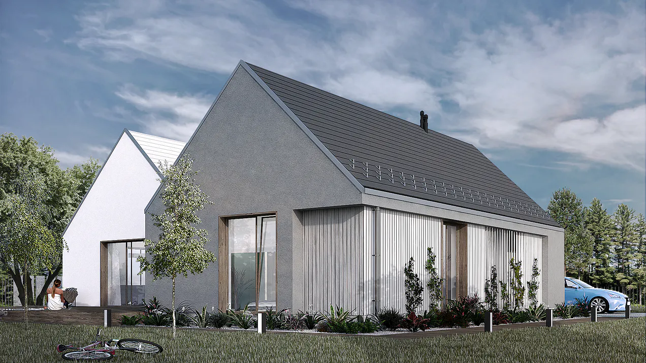 Дом состоит из двух прямоугольных частей с двускатными крышами. Внешние стены одной из частей отделаны штукатуркой серого цвета, а другой — белой штукатуркой. Это создает визуальный контраст и добавляет интерес к фасаду.